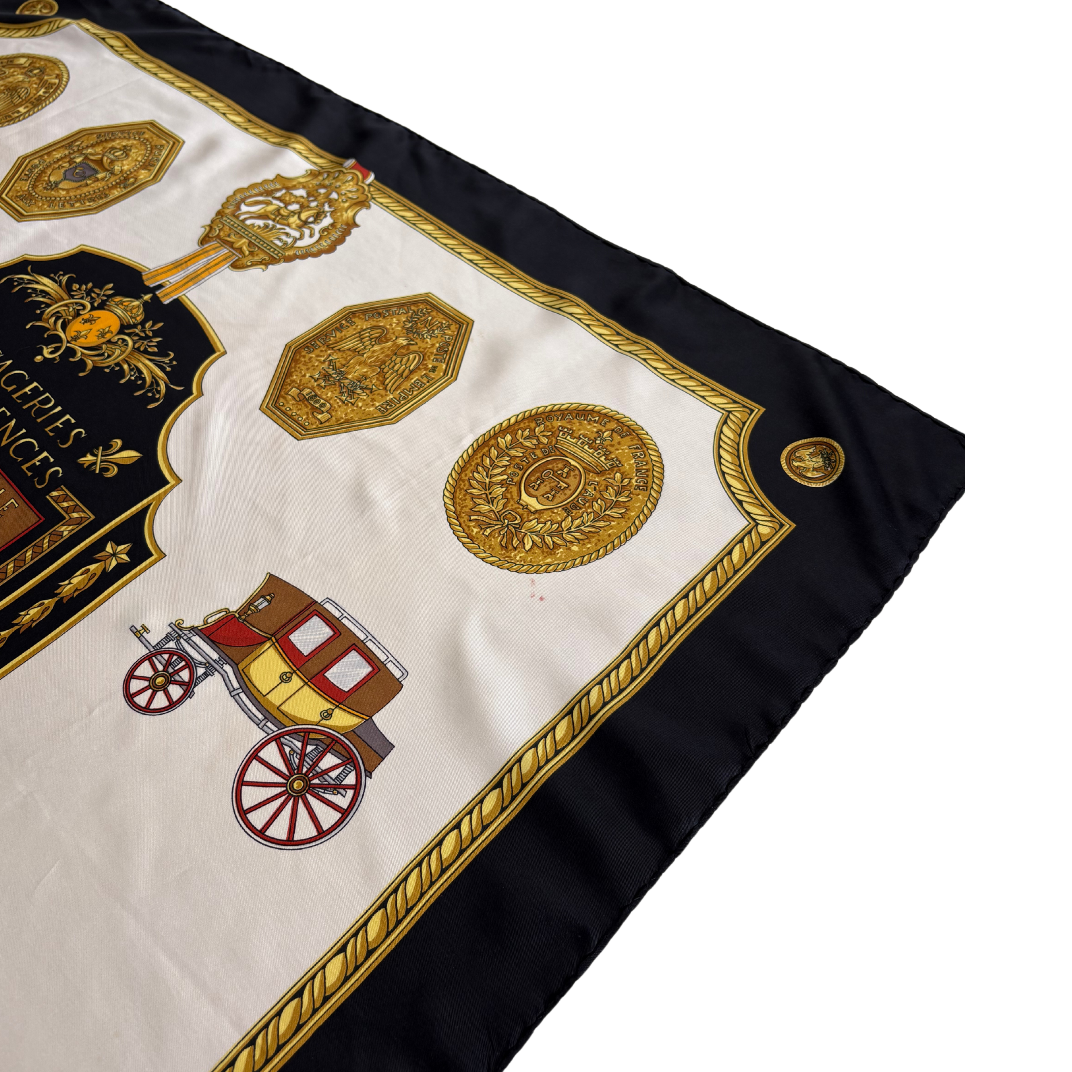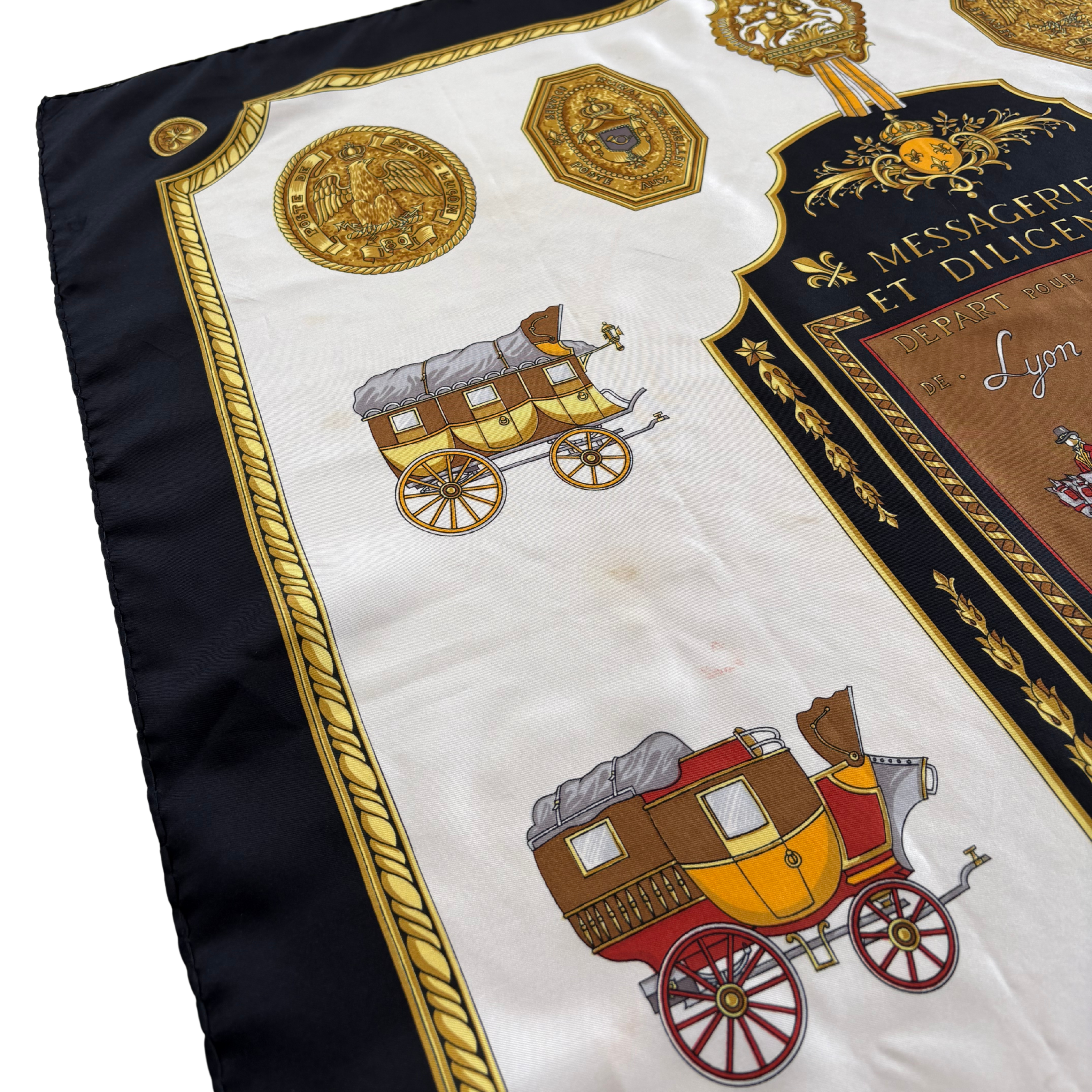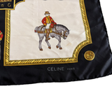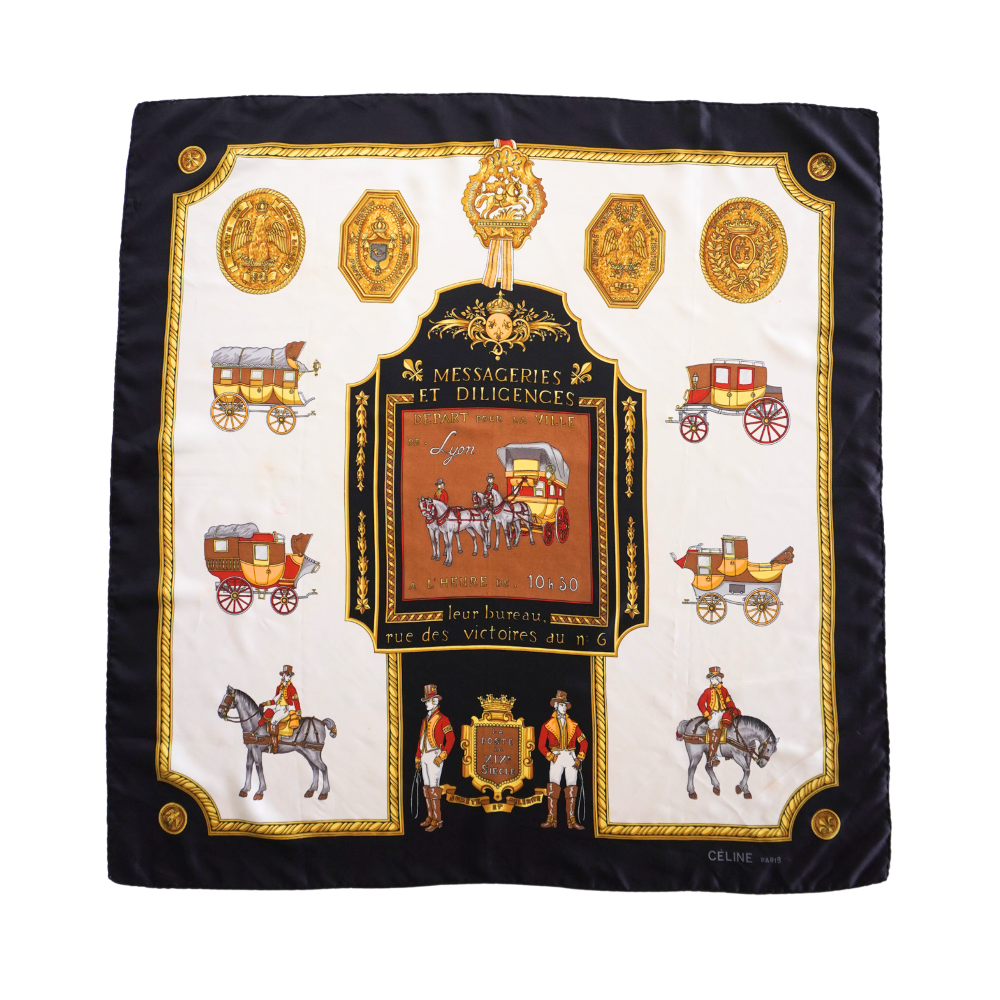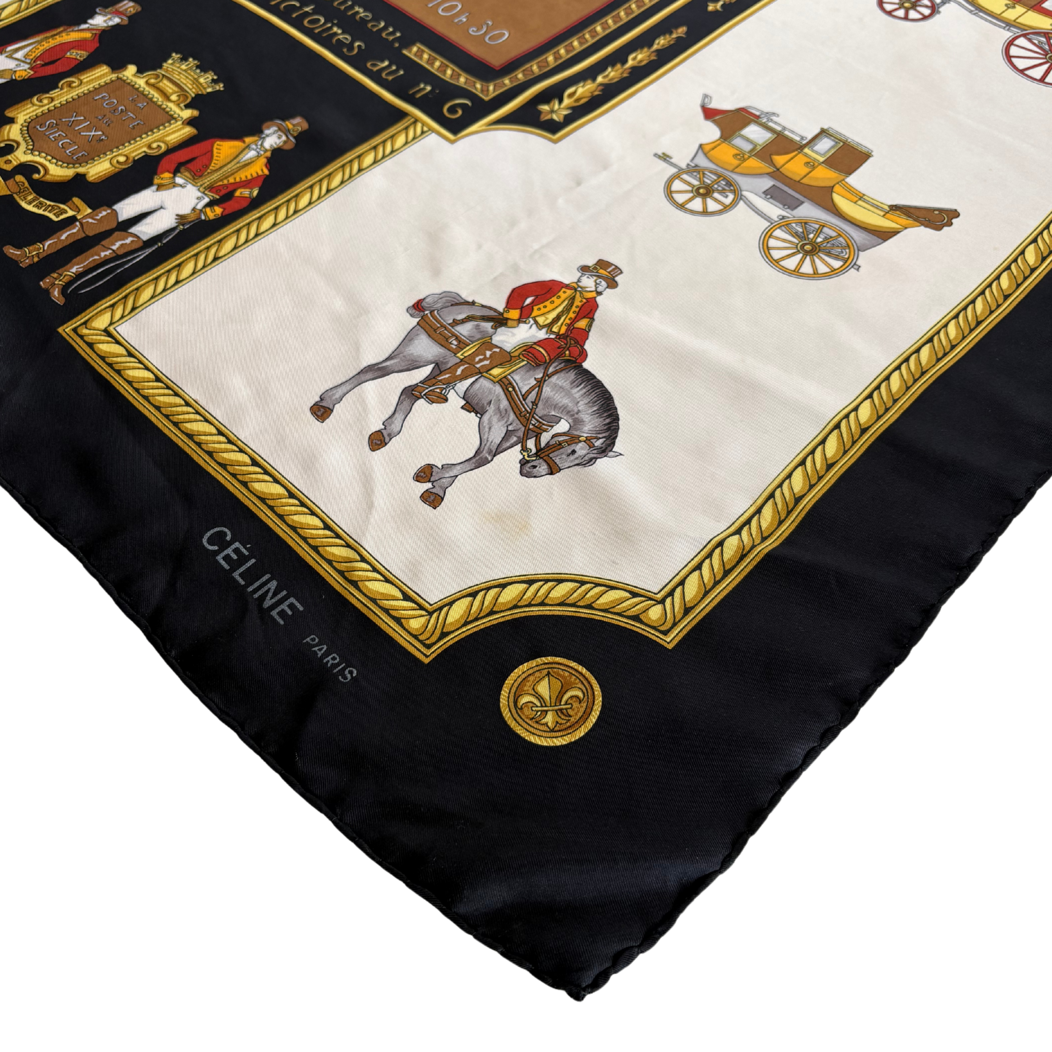 Celine vintage 'Messageries et Diligences' white silk scarf with black and gold border featuring postal service and carriage print.