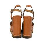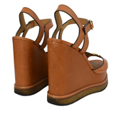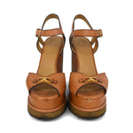 Celine platform wedge sandals in warm brown leather with crepe soles and gold 'Triomphe' logo hardware.