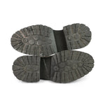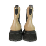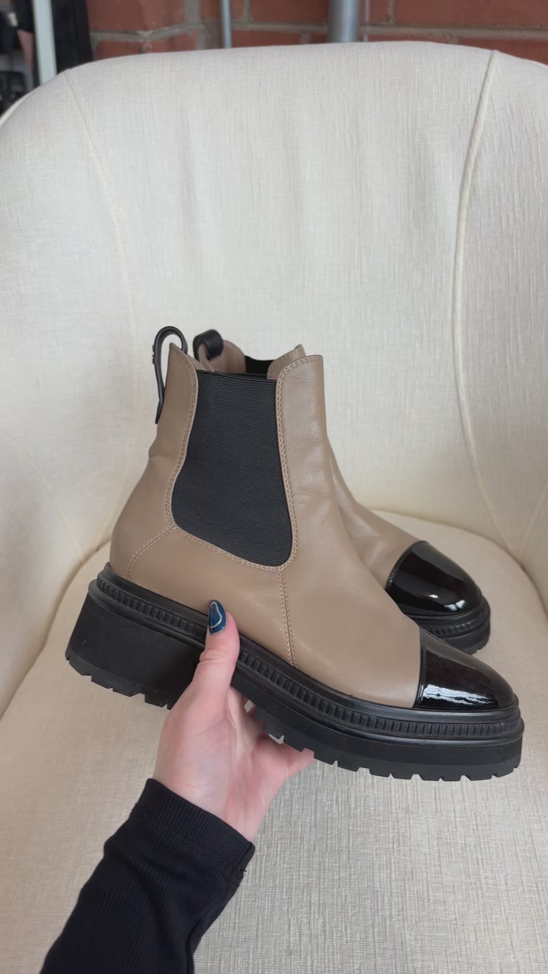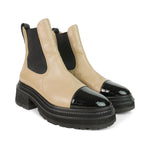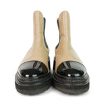 Chanel ankle boots in tan leather with black patent leather toe caps. Features black elastic panels on either side of the ankle, black leather heel pull-tab with gold logo hardware, and a black rubber sole.