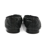 Chanel ballet flats in black quilted leather with leather bow, stitched 'CC' on the toes, black canvas trim, and stacked wooden low heel.