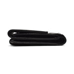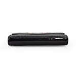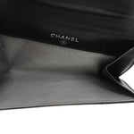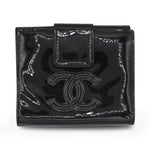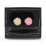 Chanel French Wallet in black patent leather with gold and pink Camilla flower detailing and CC logo embossing. Features a front flap pocket, inner cash and card pockets.