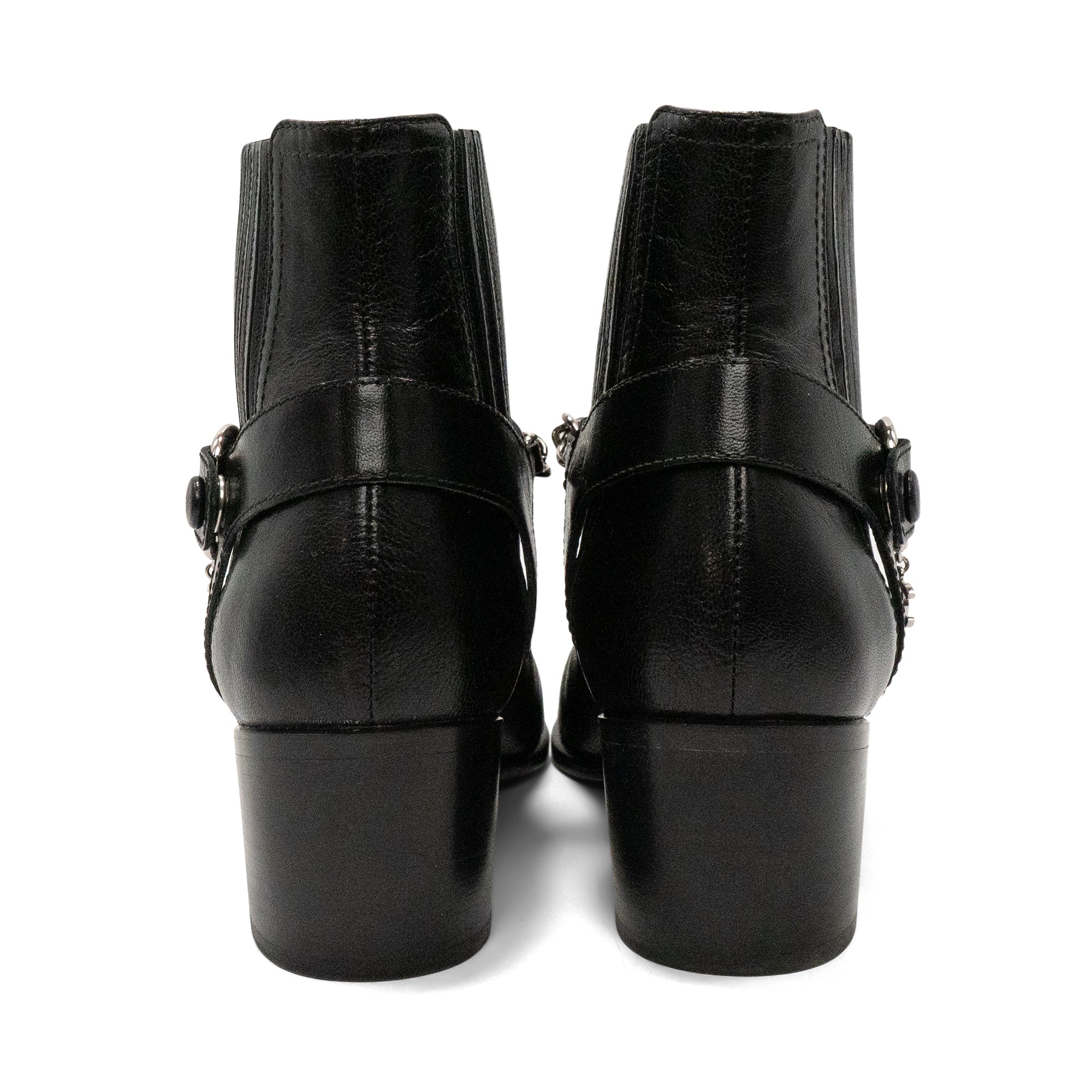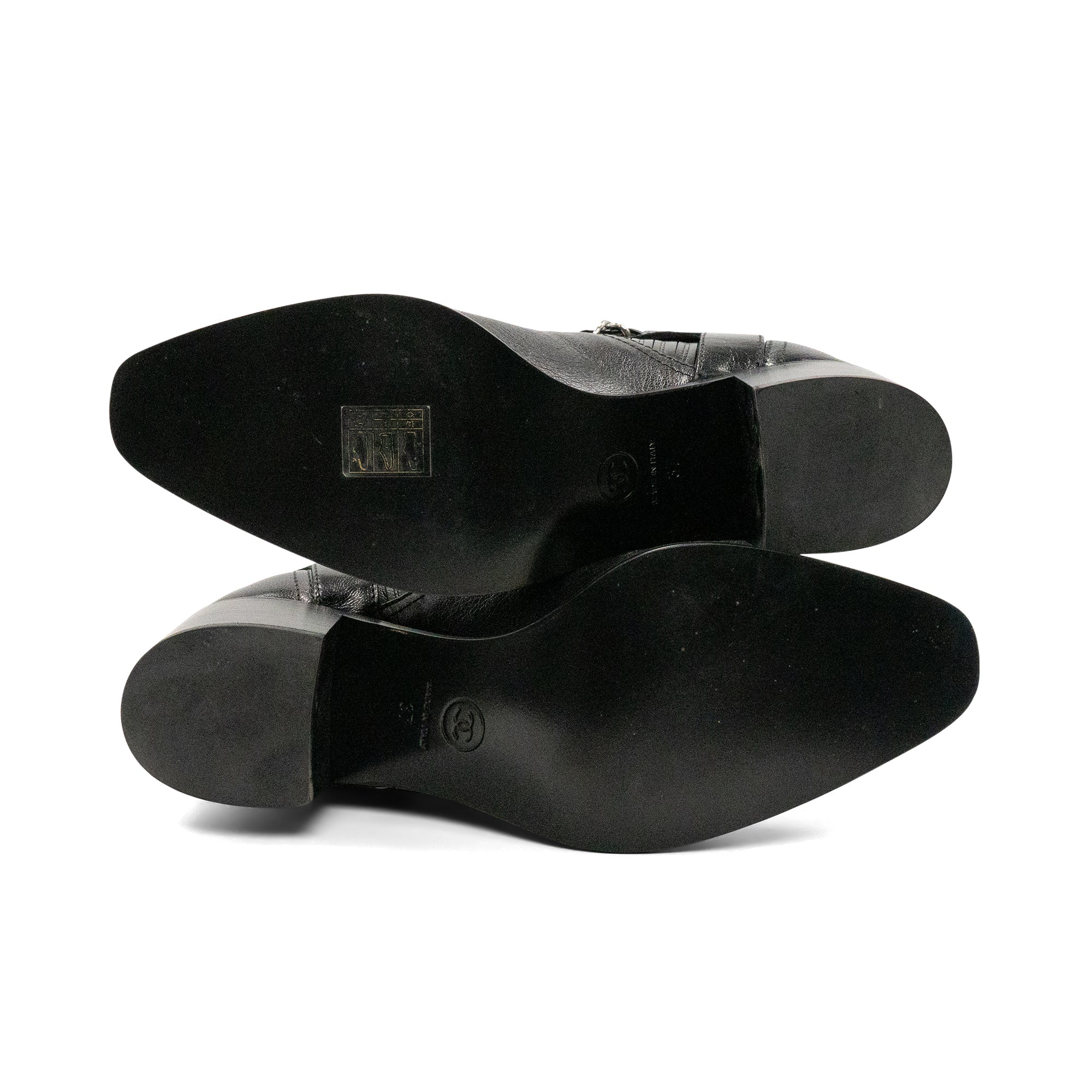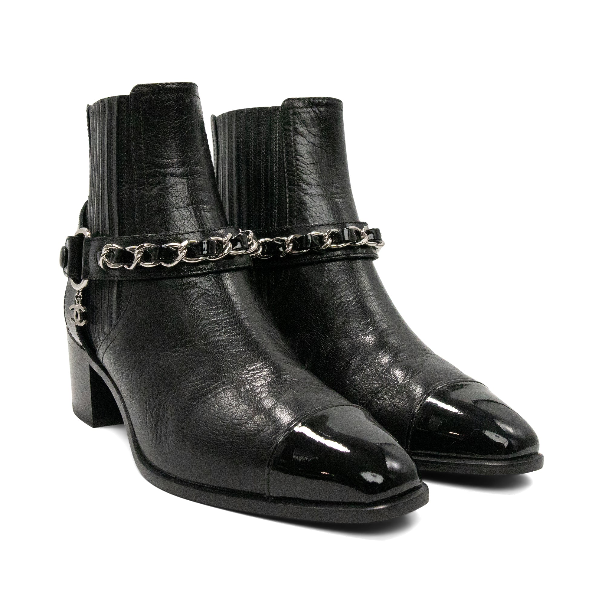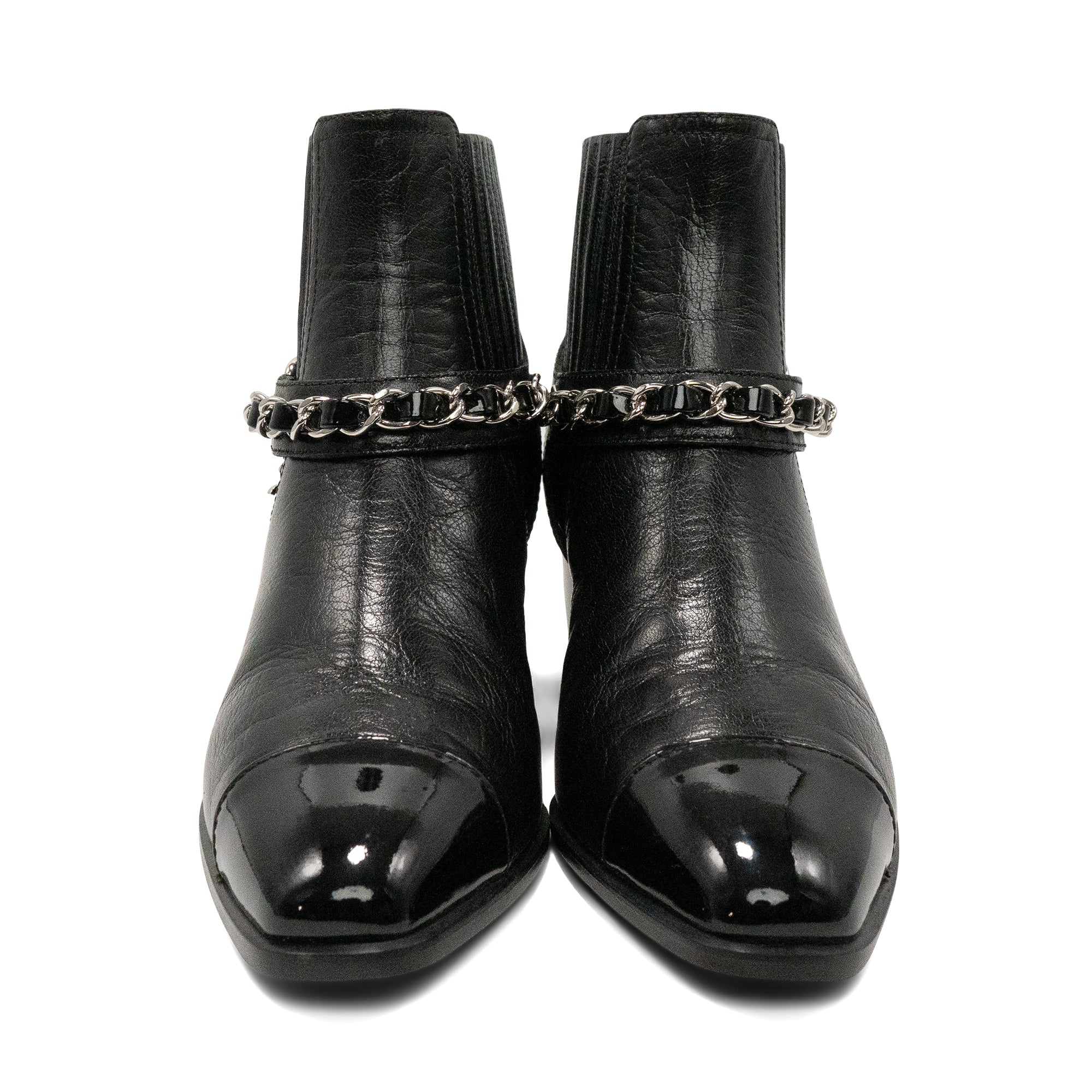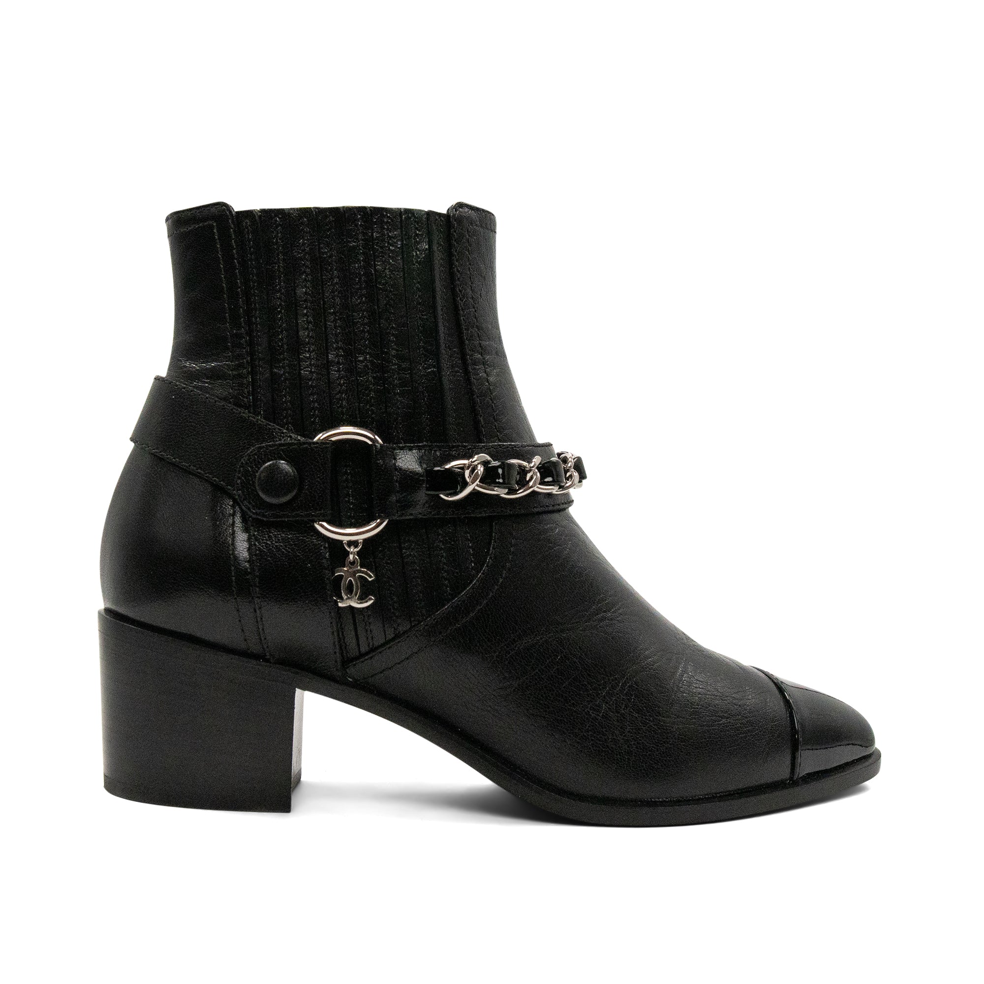 Chanel ankle boots in black leather with a patent leather toe cap, and a western style chain harness around the ankle. Features elasticized panels on the sides of the ankles, silver 'CC' charm hanging off chain harness, and a small block heel.