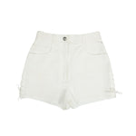Chanel high waisted shorts in white denim with a lace up detail on the side seams, raw hems, a 'CC' stitch patch on the back pocket, and silver logo-embossed button hardware.