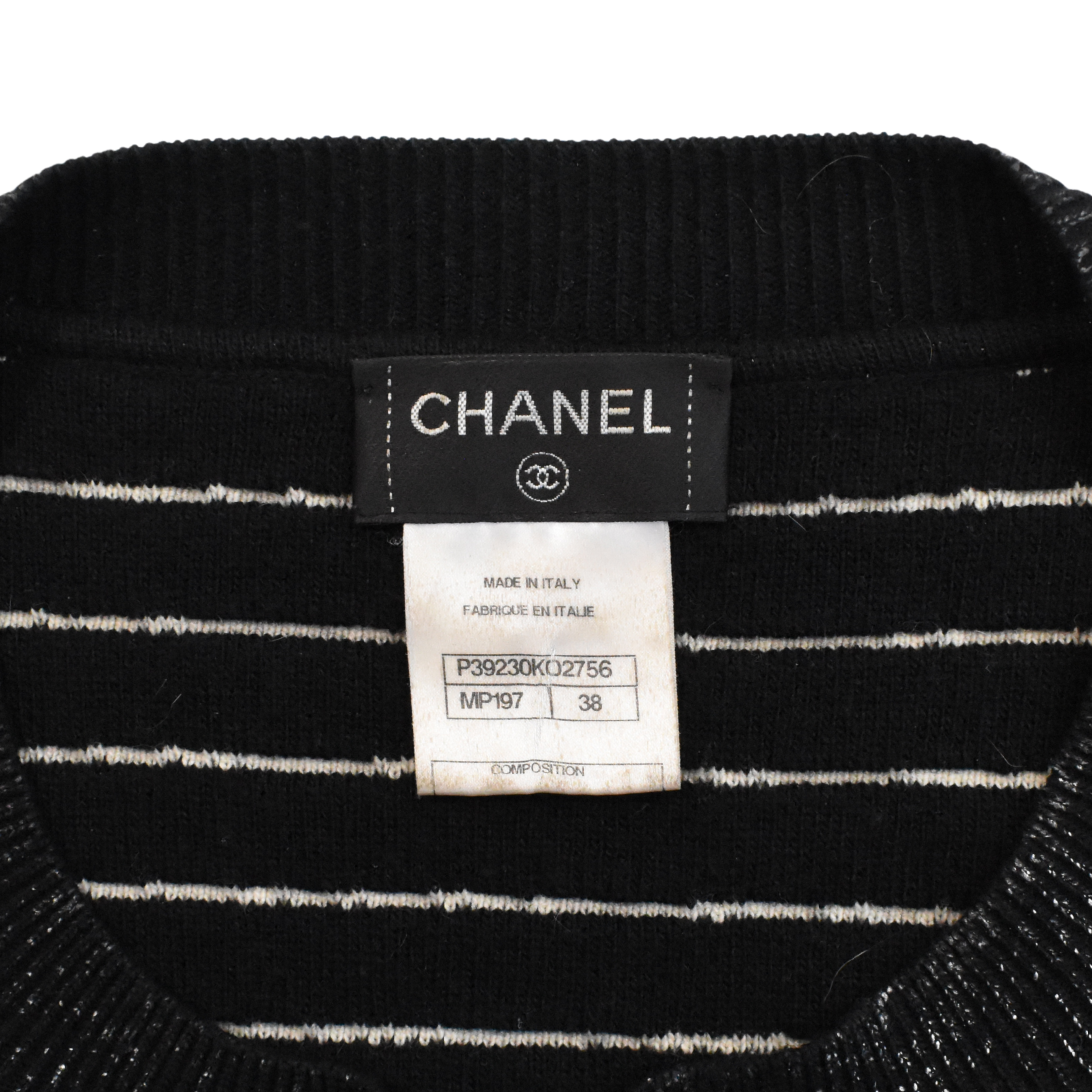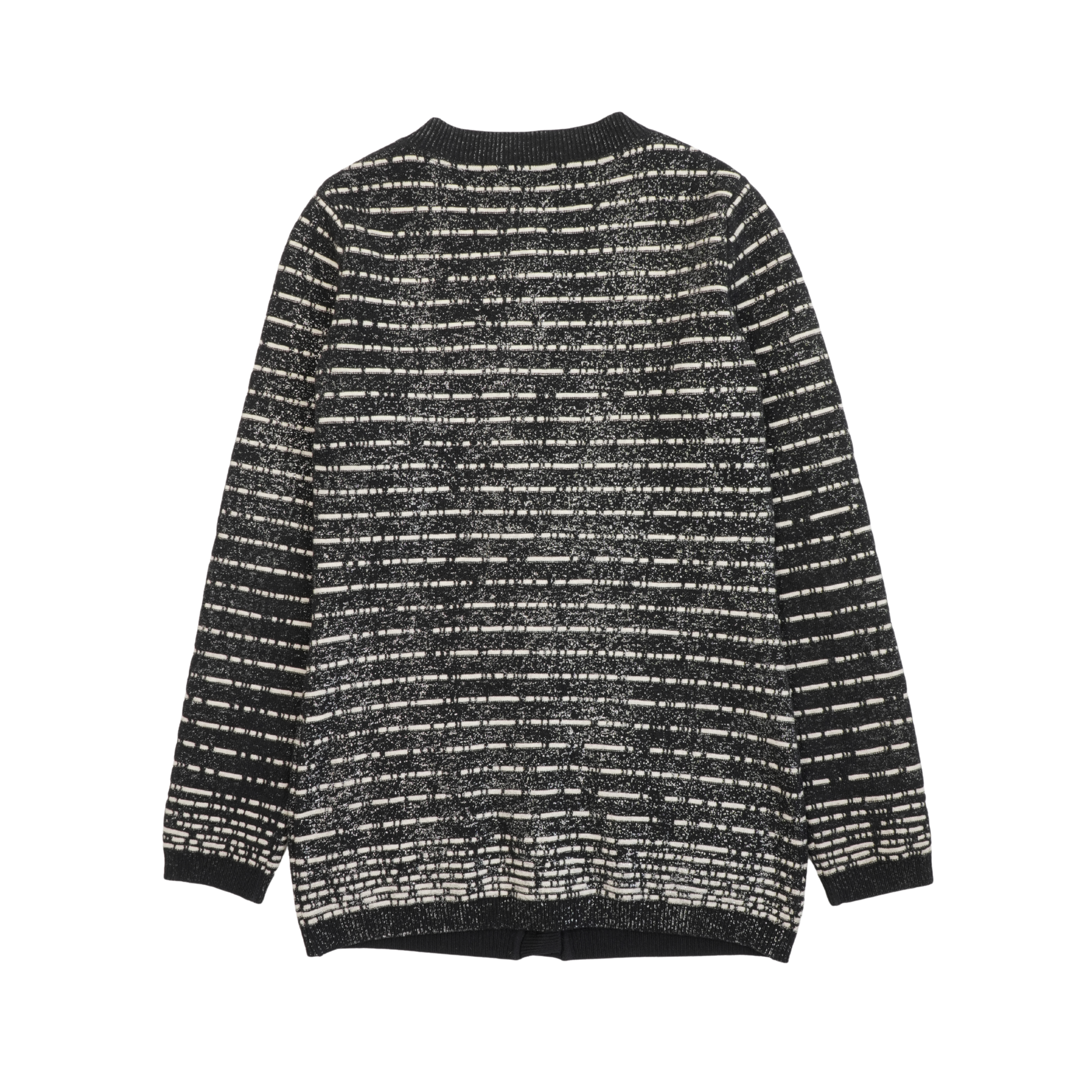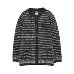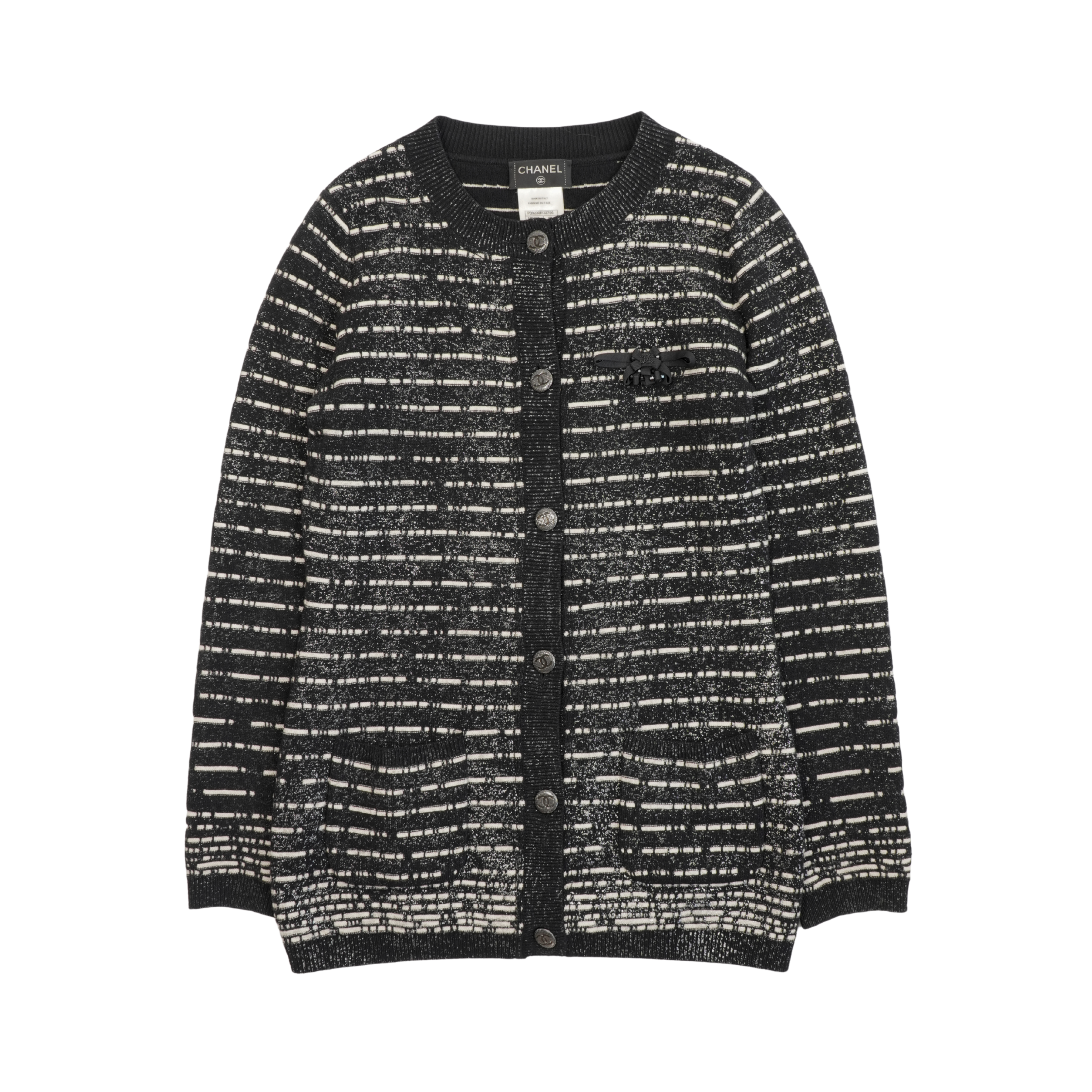 Chanel cardigan from Karl Lagerfeld 'Iceberg Fall 2010' collection in black and white striped knit. Features silver lurex thread throughout, CC logo buttons, black bow applique with small rhinestone CC logo and black shiny beads on left side of chest, and patch pockets on the front.