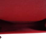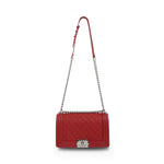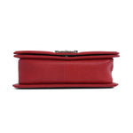 Chanel 'Old Medium Boy' bag in red micro caviar leather with shiny silver hardware. Features iconic 'CC' push lock closure and pull chain strap with leather shoulder rest. The interior is lined with red grosgrain fabric and has a slip pocket.