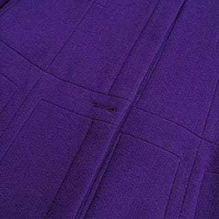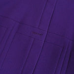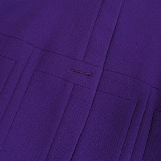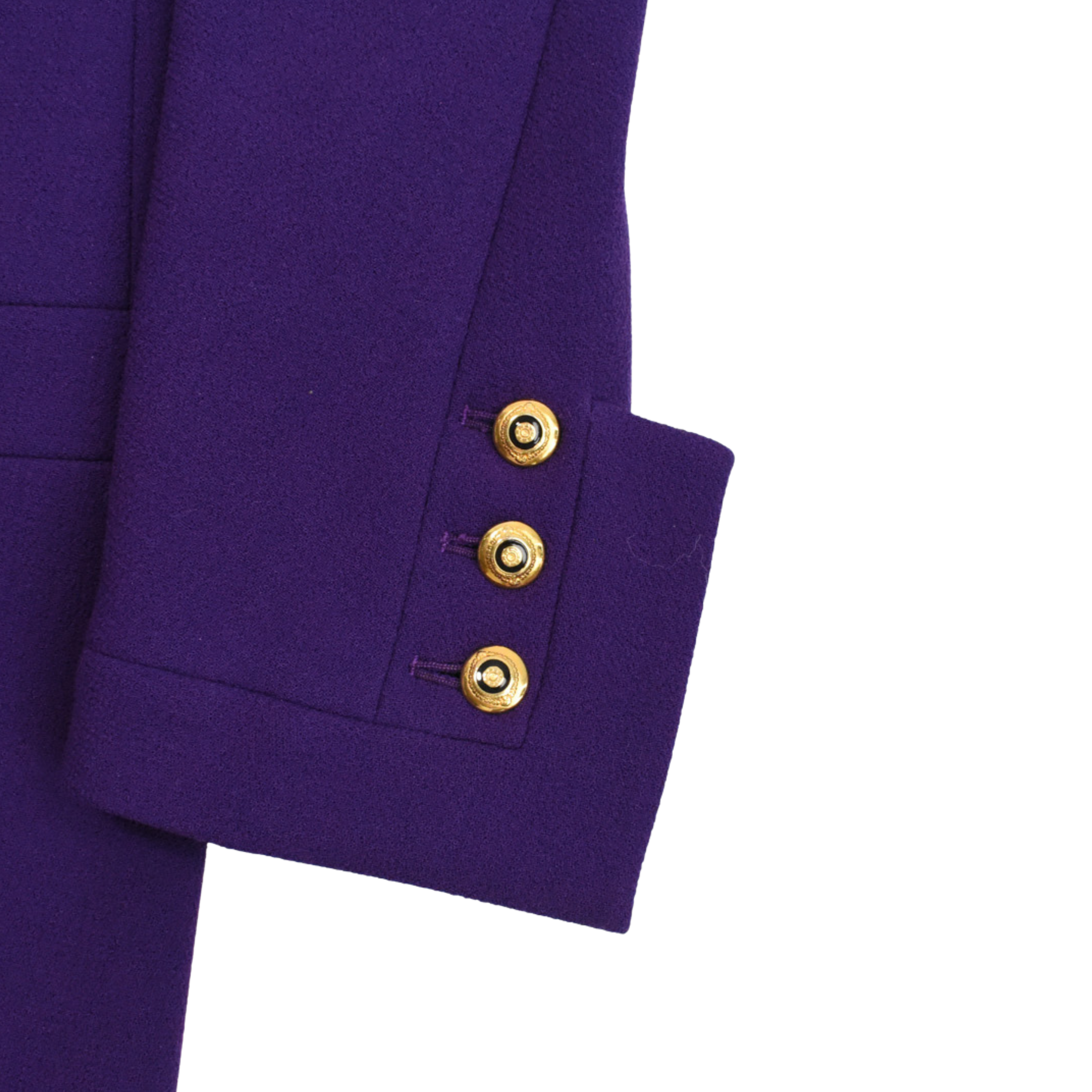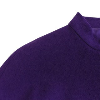 Chanel high neck, button down jacket in purple wool crepe fabric. Features purple buttons down the front that replaced original black and gold buttons which are included, original gold and black buttons on the wrists, seam details all over the front, and a vent in the centre back at the bottom hem.
