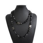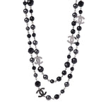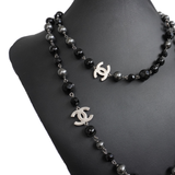 Chanel long beaded necklace in silver metal hardware with smooth and faceted glass black beads, smokey grey faux pearls, and polished dark silver CC charms.