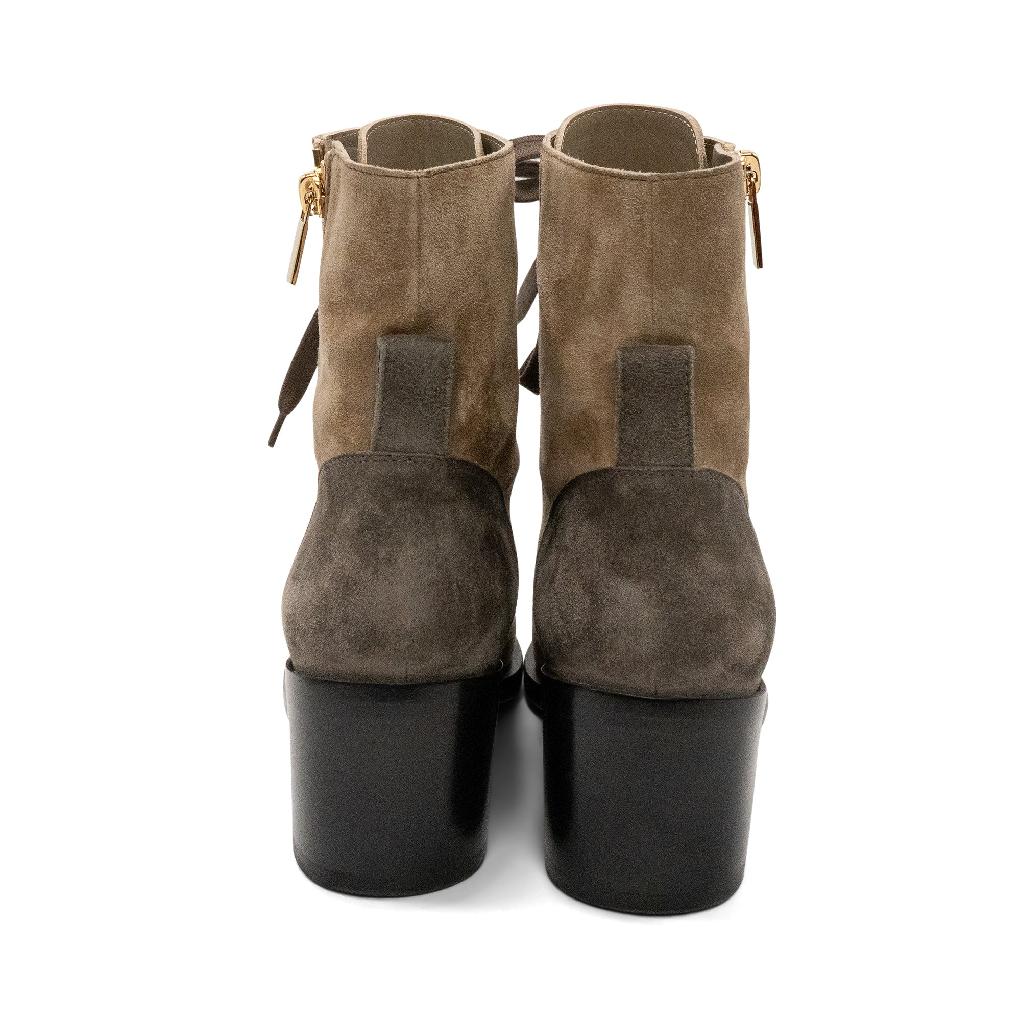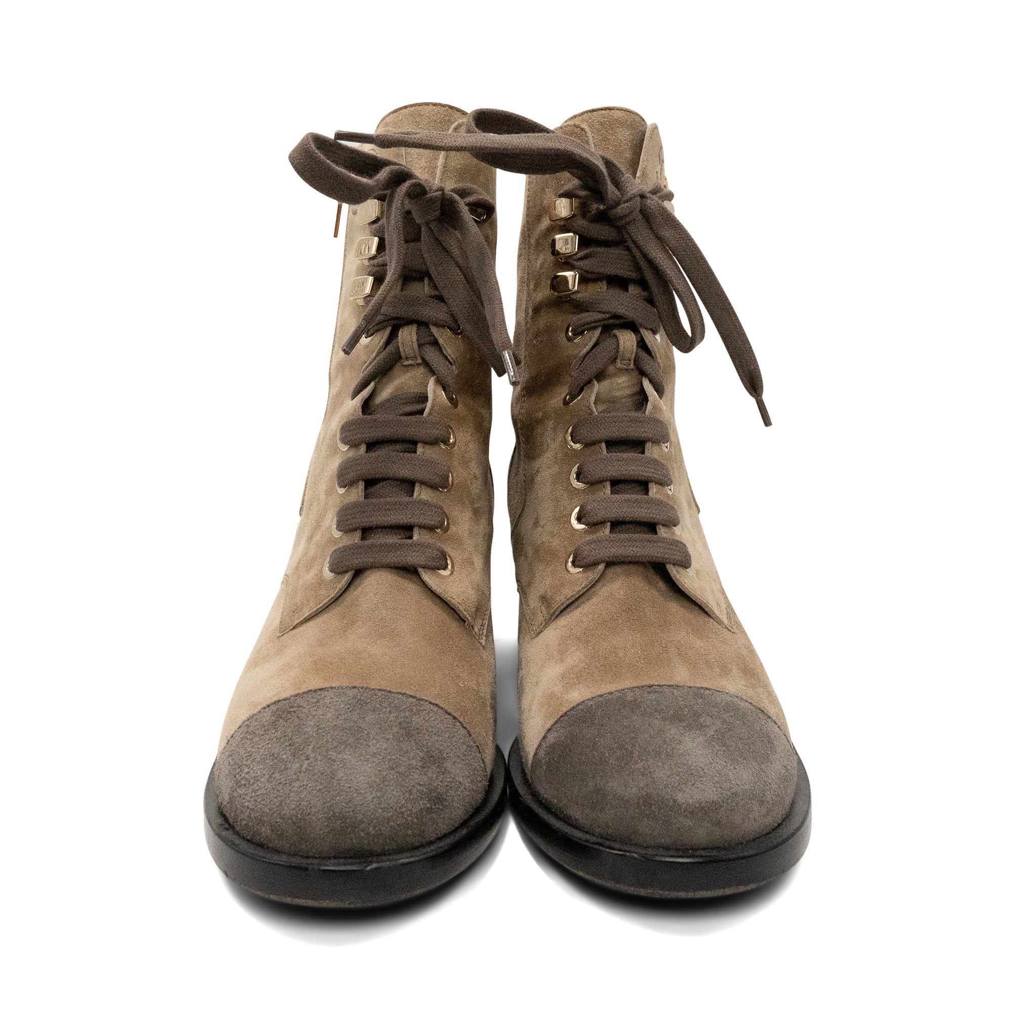 Chanel lace up, heeled combat boots in beige and grey suede with gold zippers up the outside of the ankle from 2019 collection. Features grey laces, an embroidered 'CC' logo at the top of the laces, a grey toe cap and heel, a pull tap on the heel, and a black chunky, stacked heel.