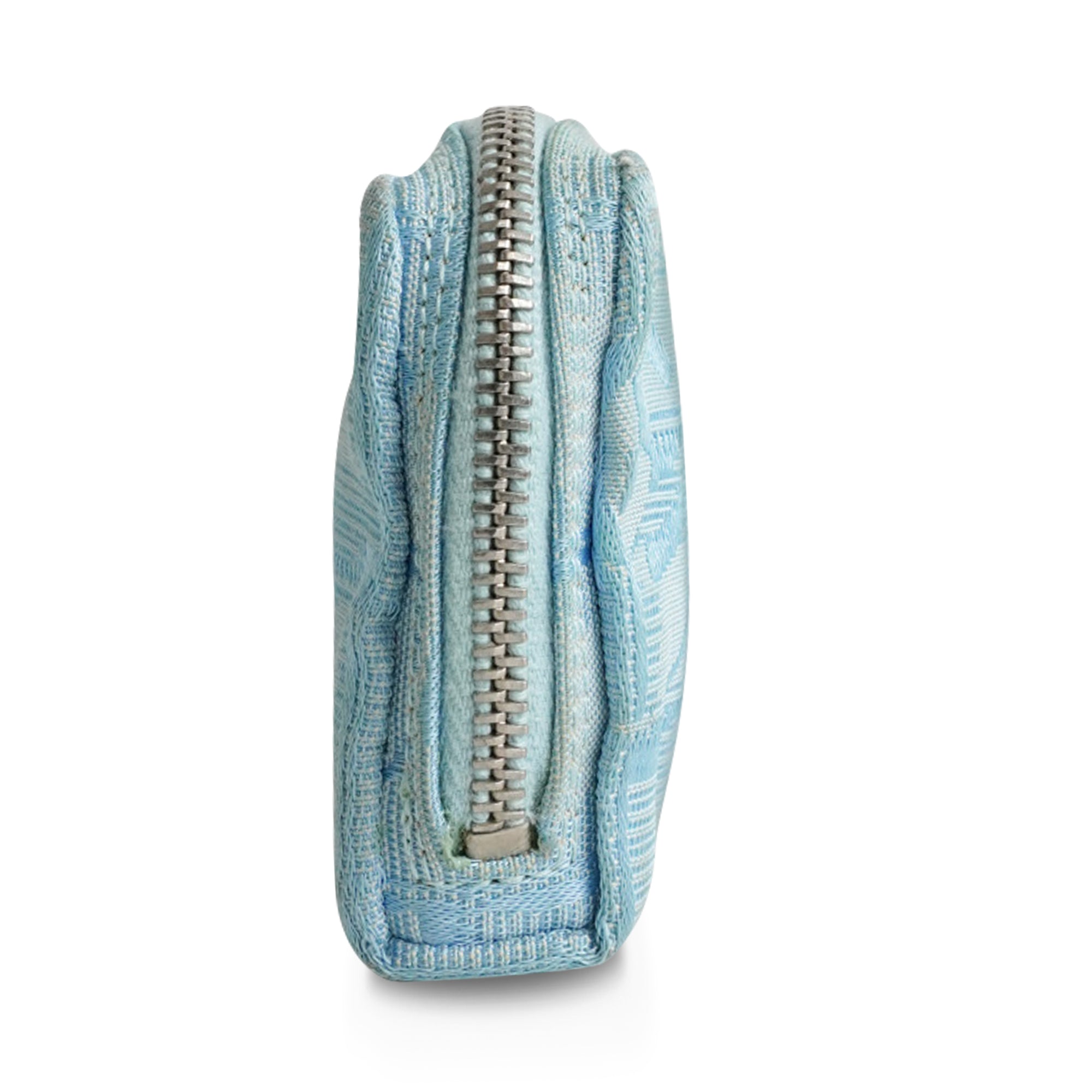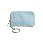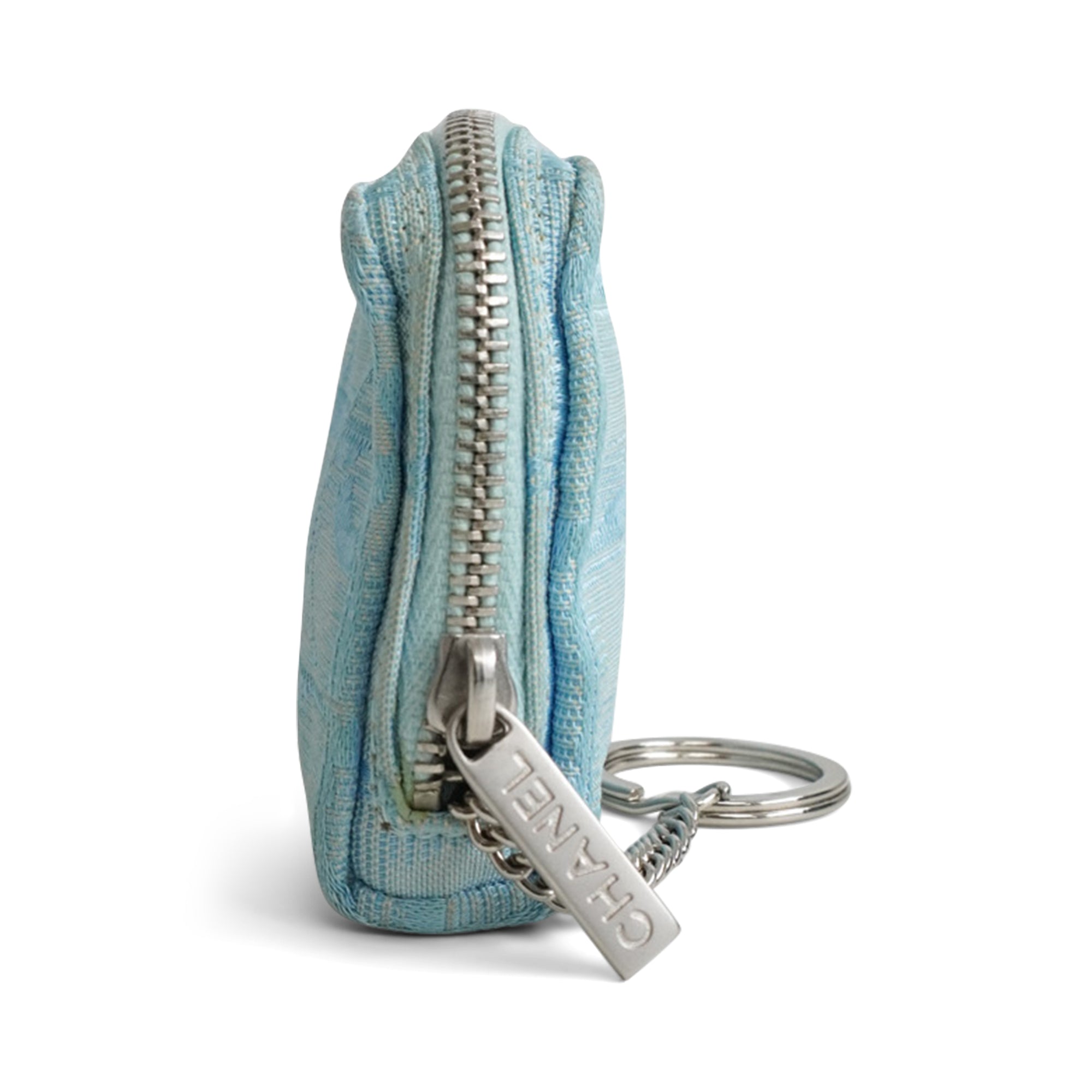 Chanel 'Travel Ligne 2002' mini pouch in light blue canvas with a jacquard 'CC' grid pattern, a zip around opening in silver hardware, a keychain ring, and a blue satin interior lining.