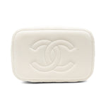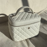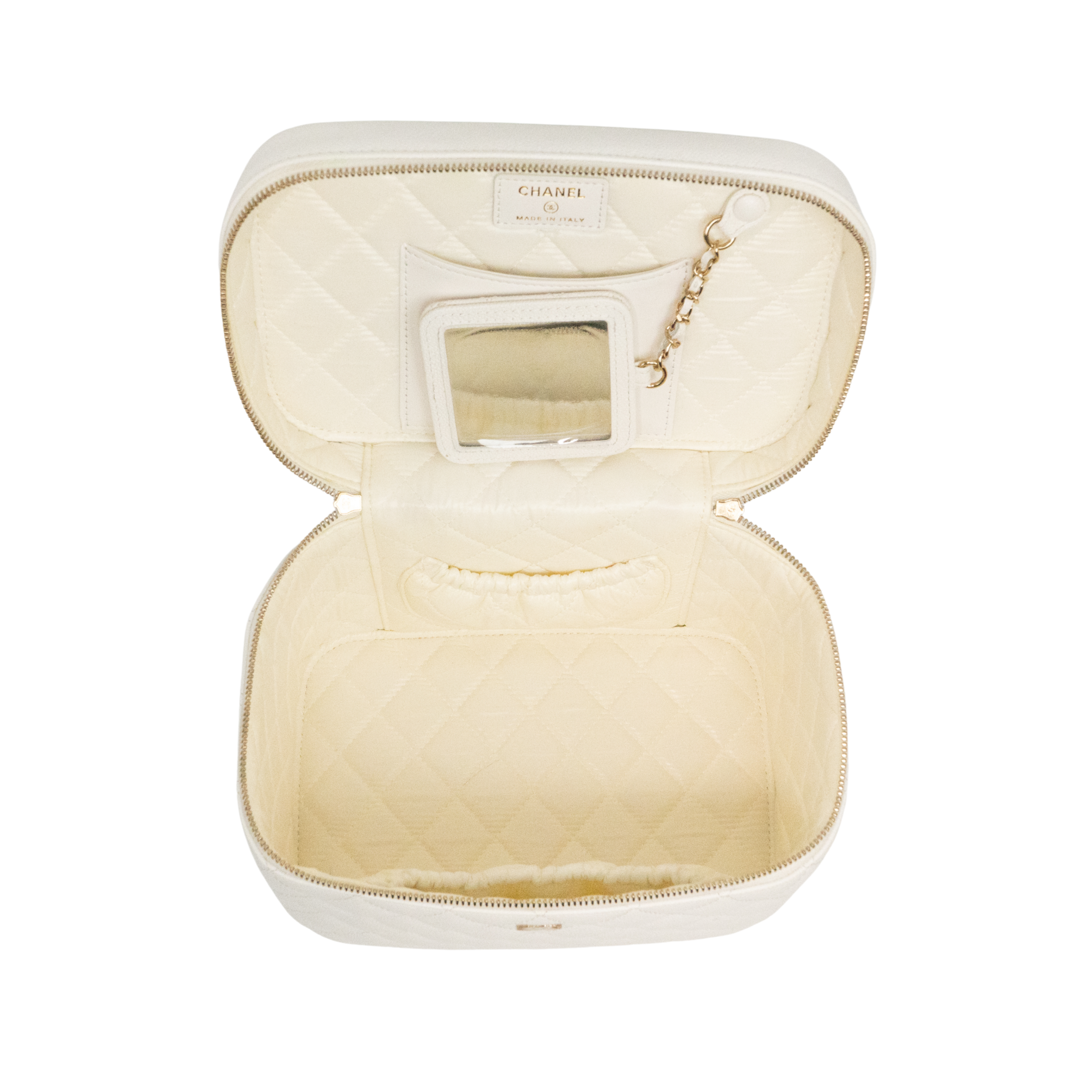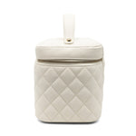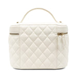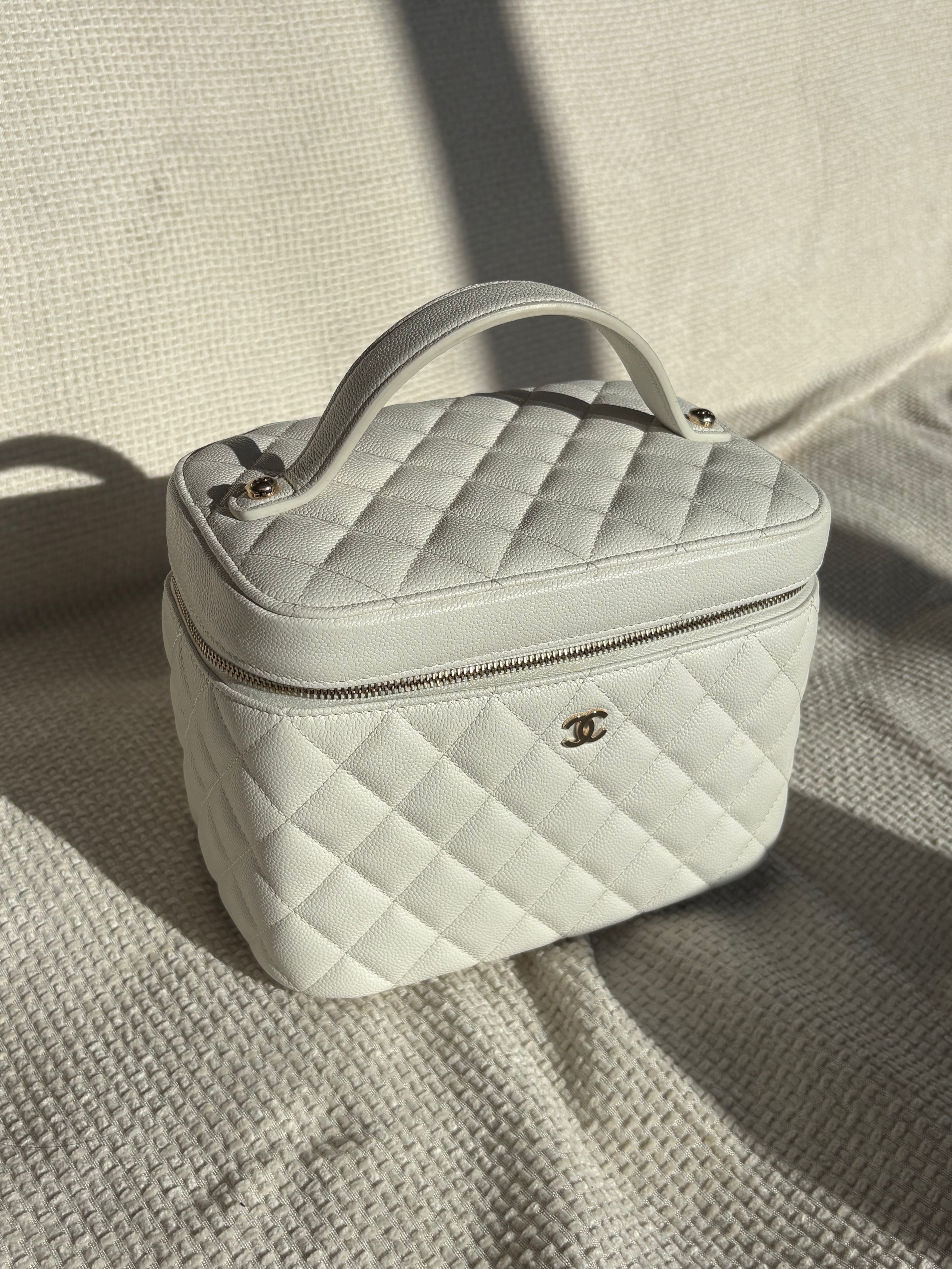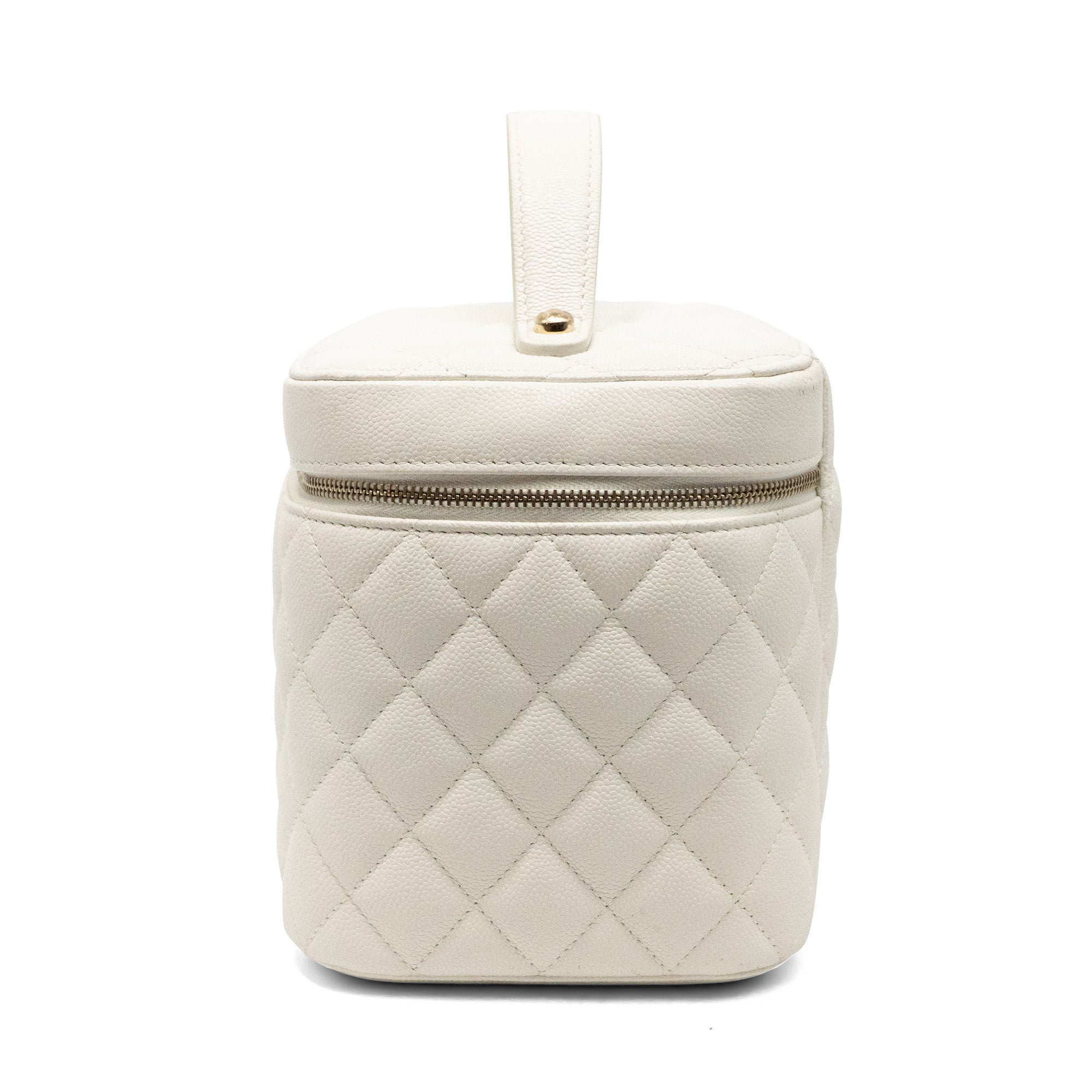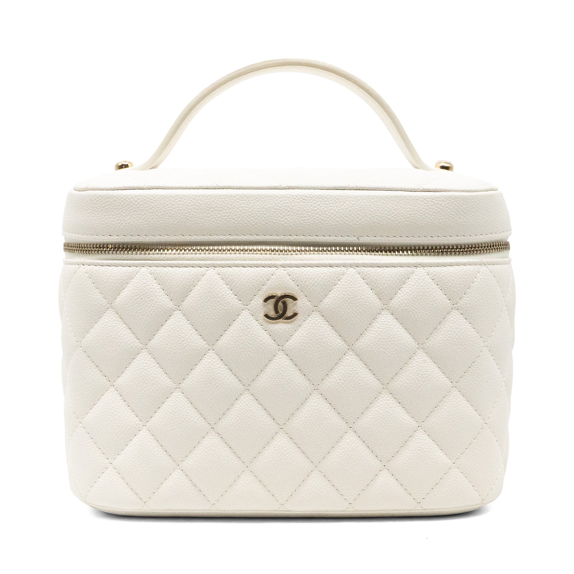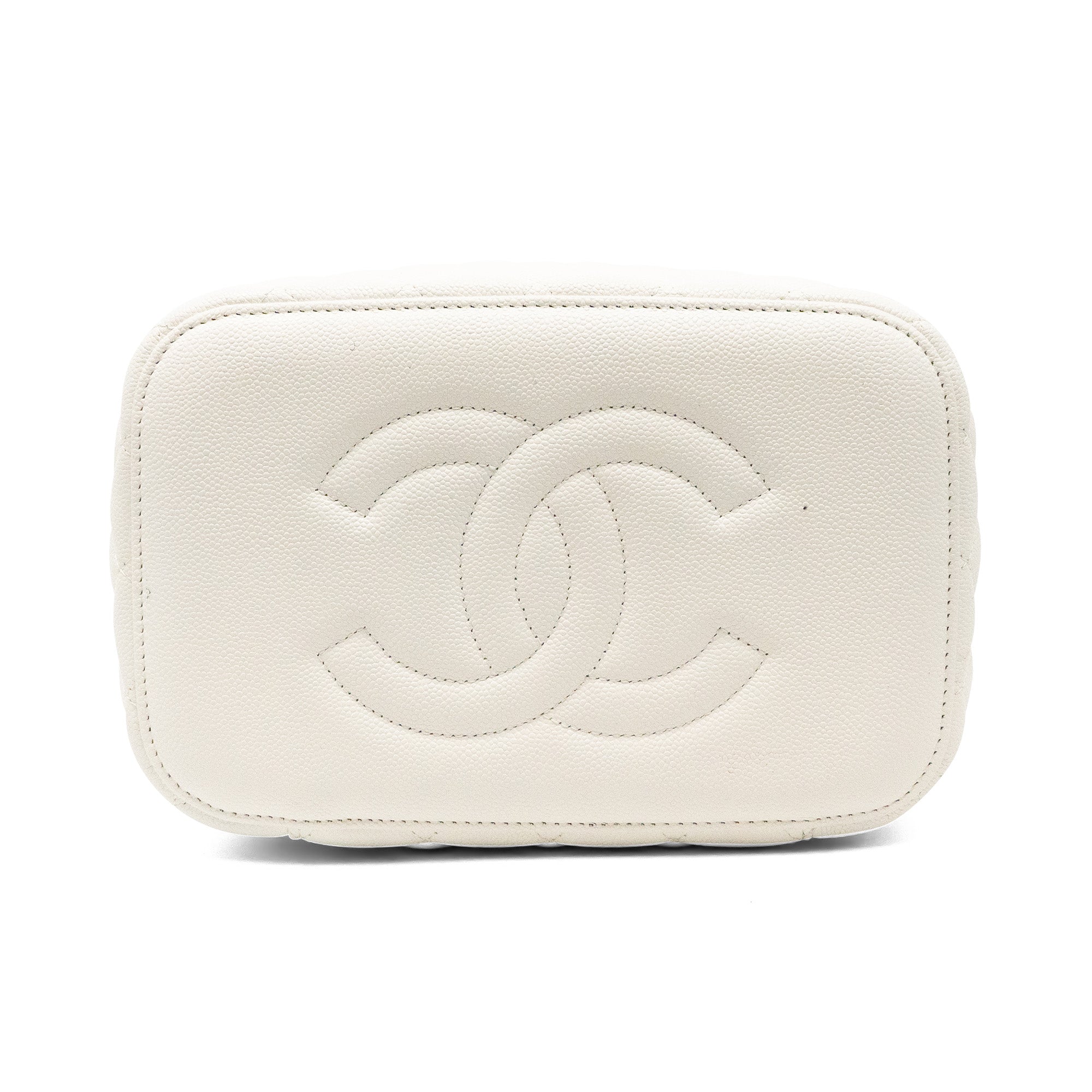 Chanel top handle vanity case in white quilted caviar leather. Features a small soft-gold CC logo on the front, a double zip closure, a quilted lining with three inner pockets, and a square mini mirror held onto the inside of the top with a gold chain.