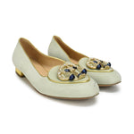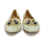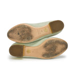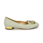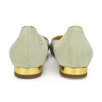 Charlotte Olympia flats in seafoam green suede with gold heels and a gold and blue broach detail on the toe.