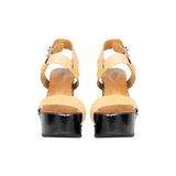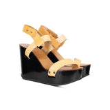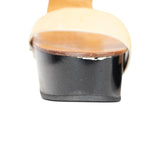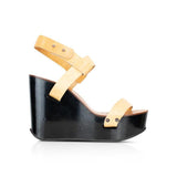 Chloe platform black glossy wedges with light brown leather straps and gunmetal hardware.