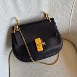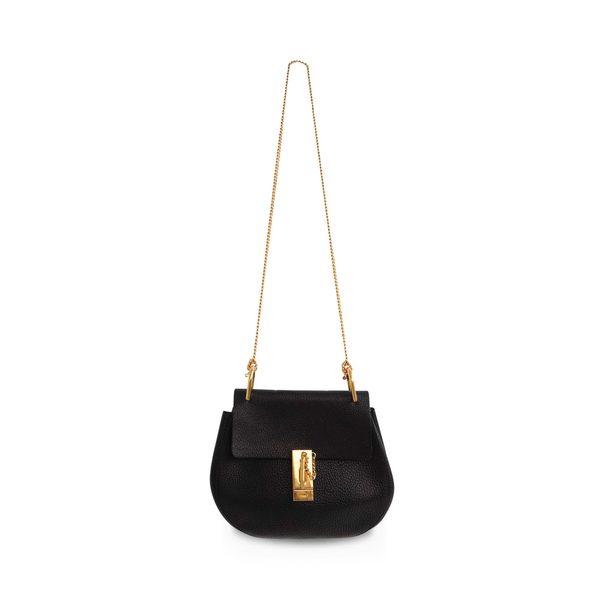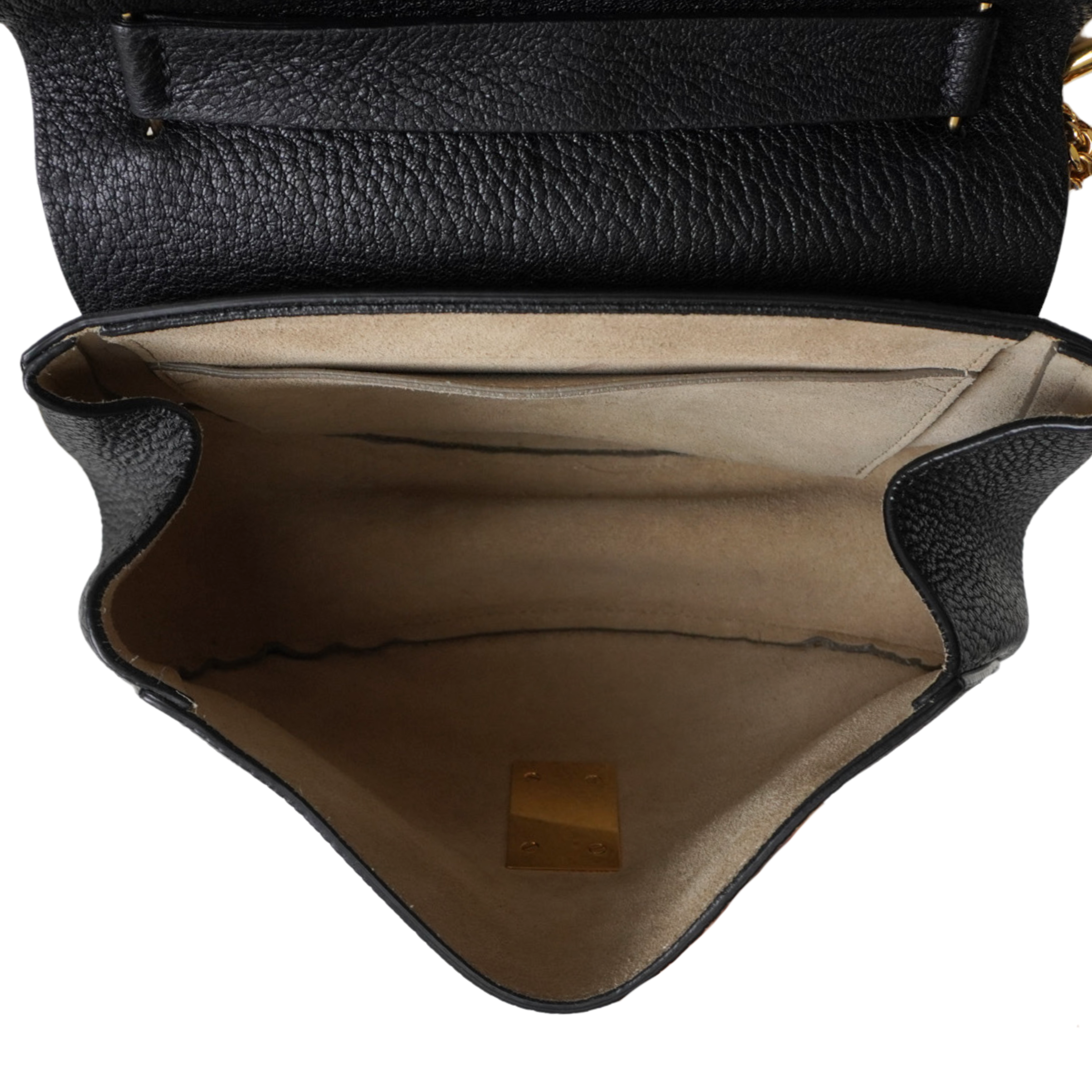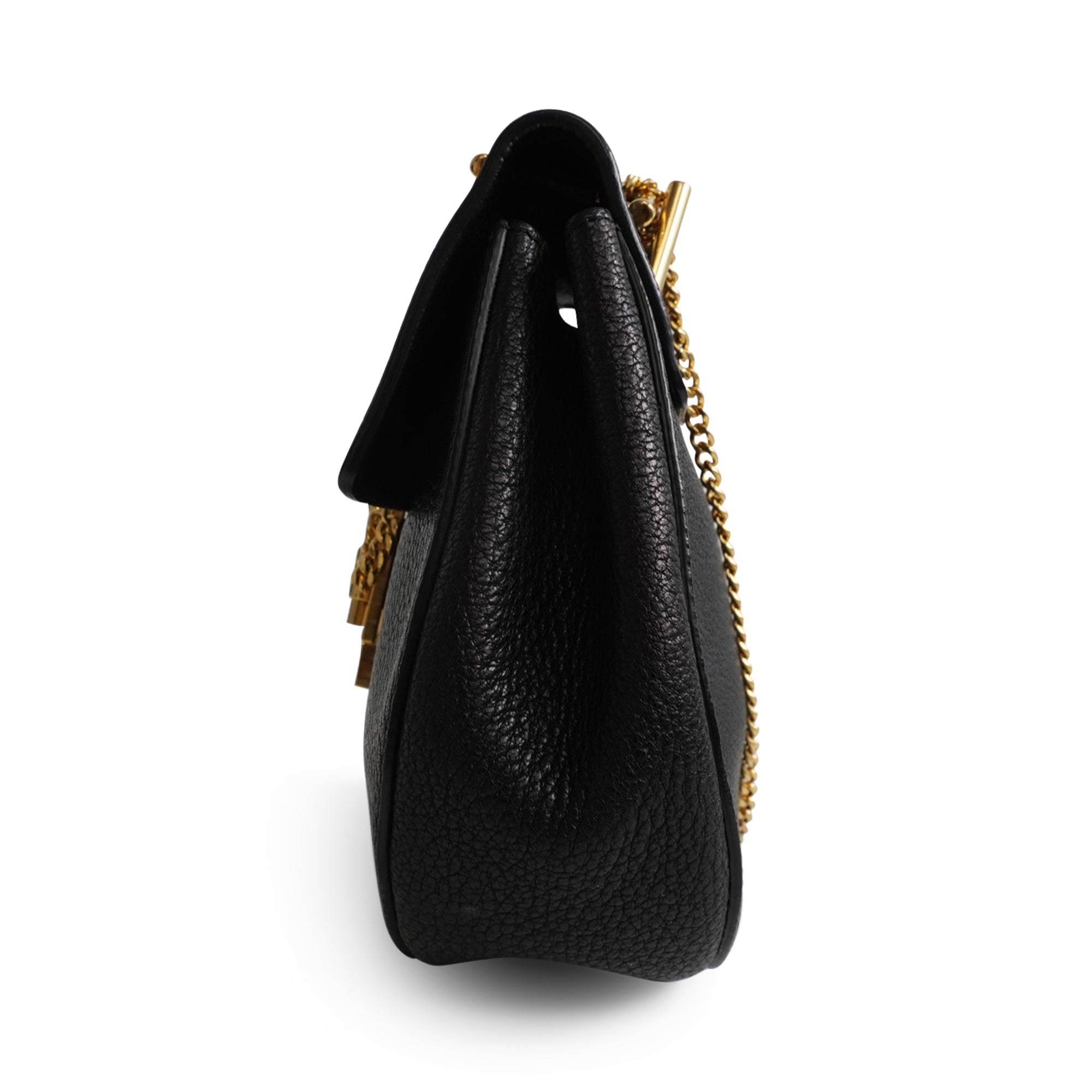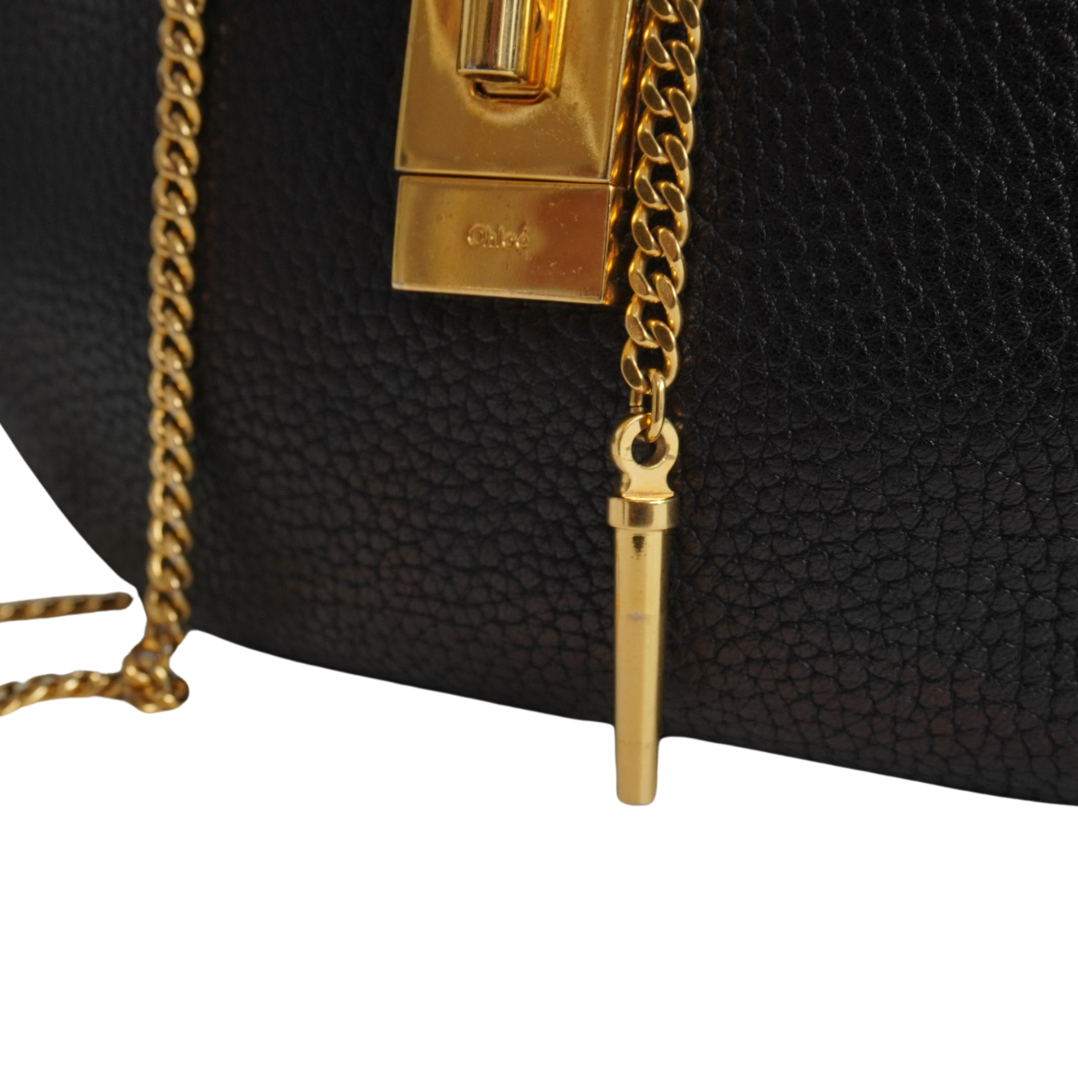 Chloe 'Drew' bag in grained black leather with gold hardware and a chain crossbody strap. Features a turnlock closure with metal bar lock detail. The bag is lined with beige suede and has a single slip pocket.