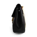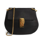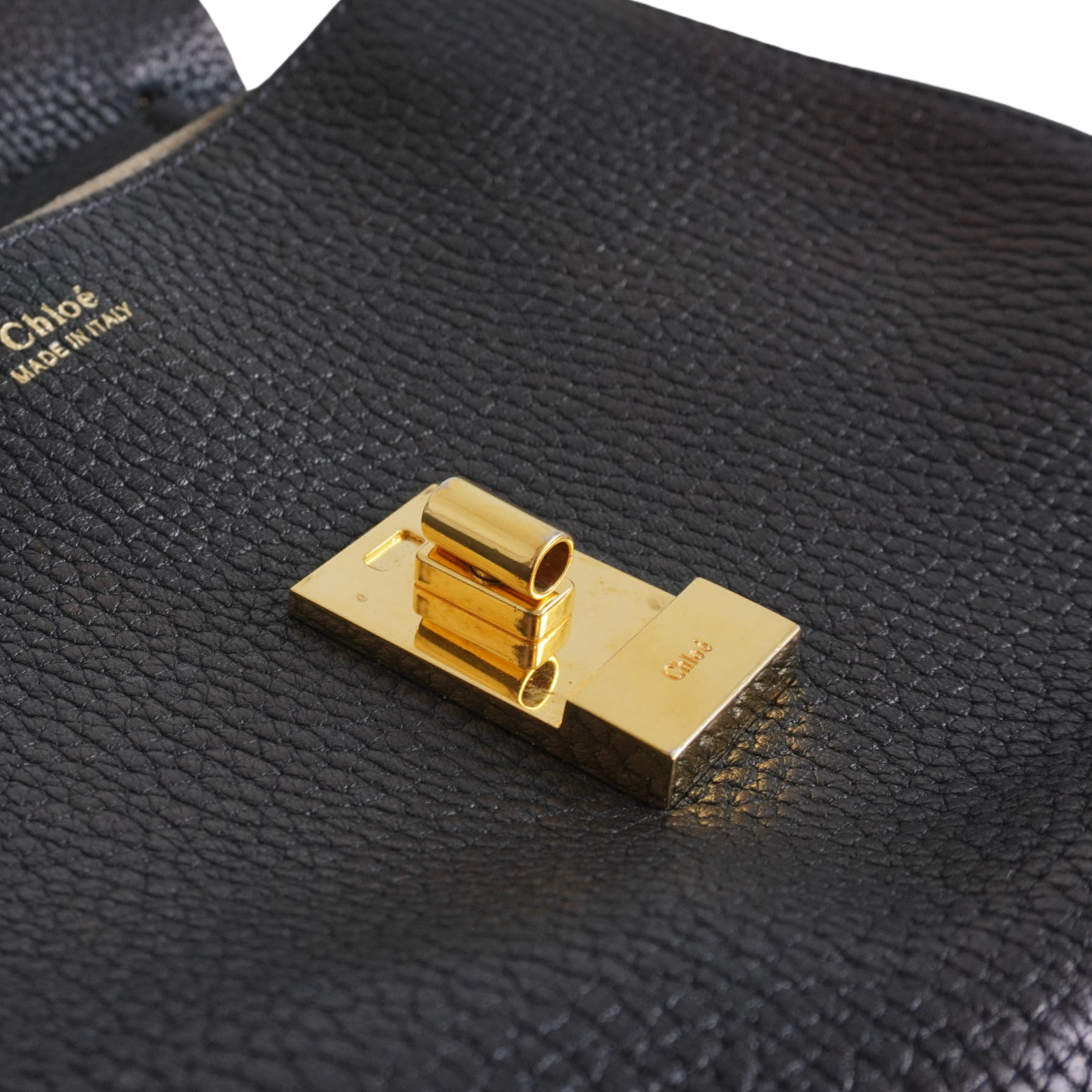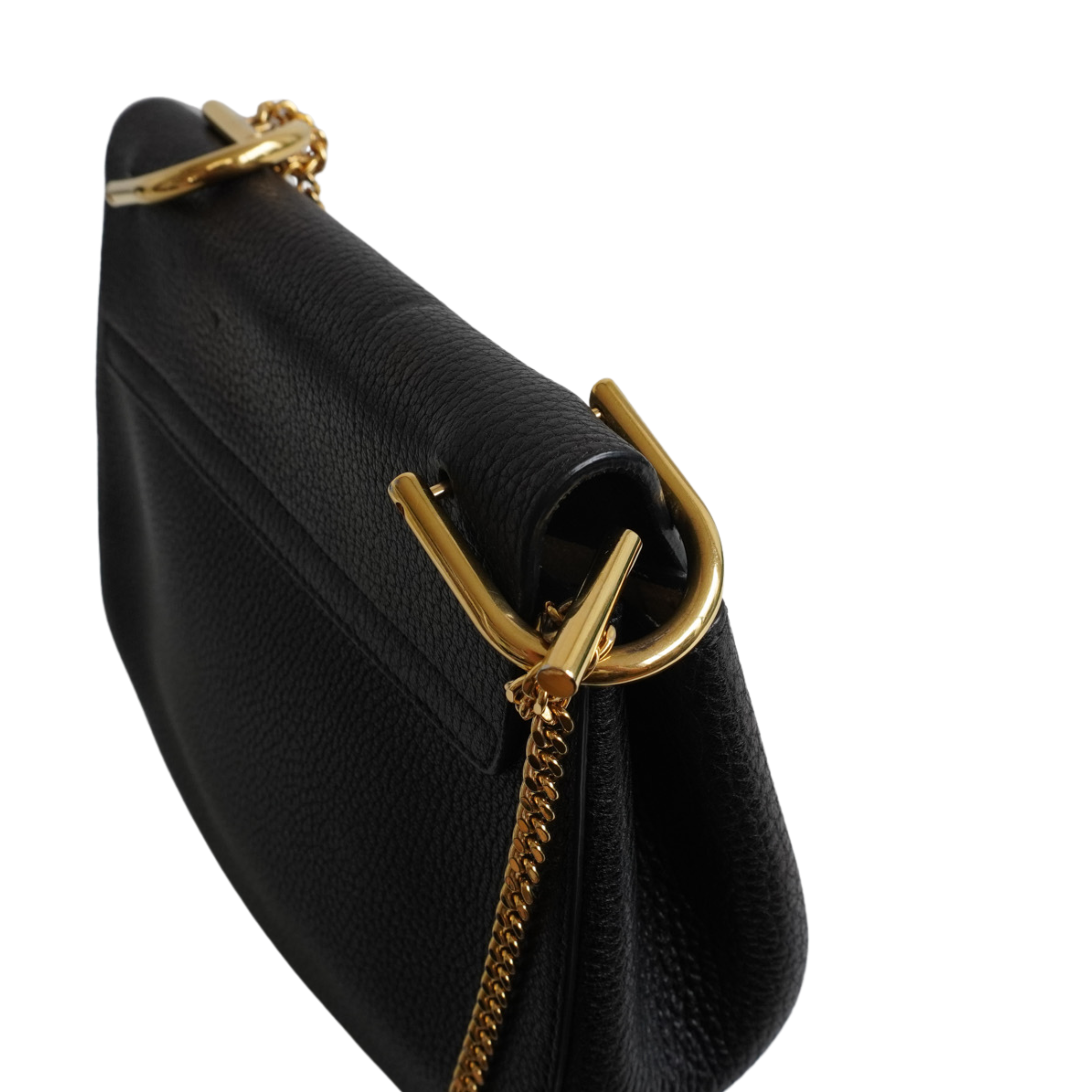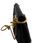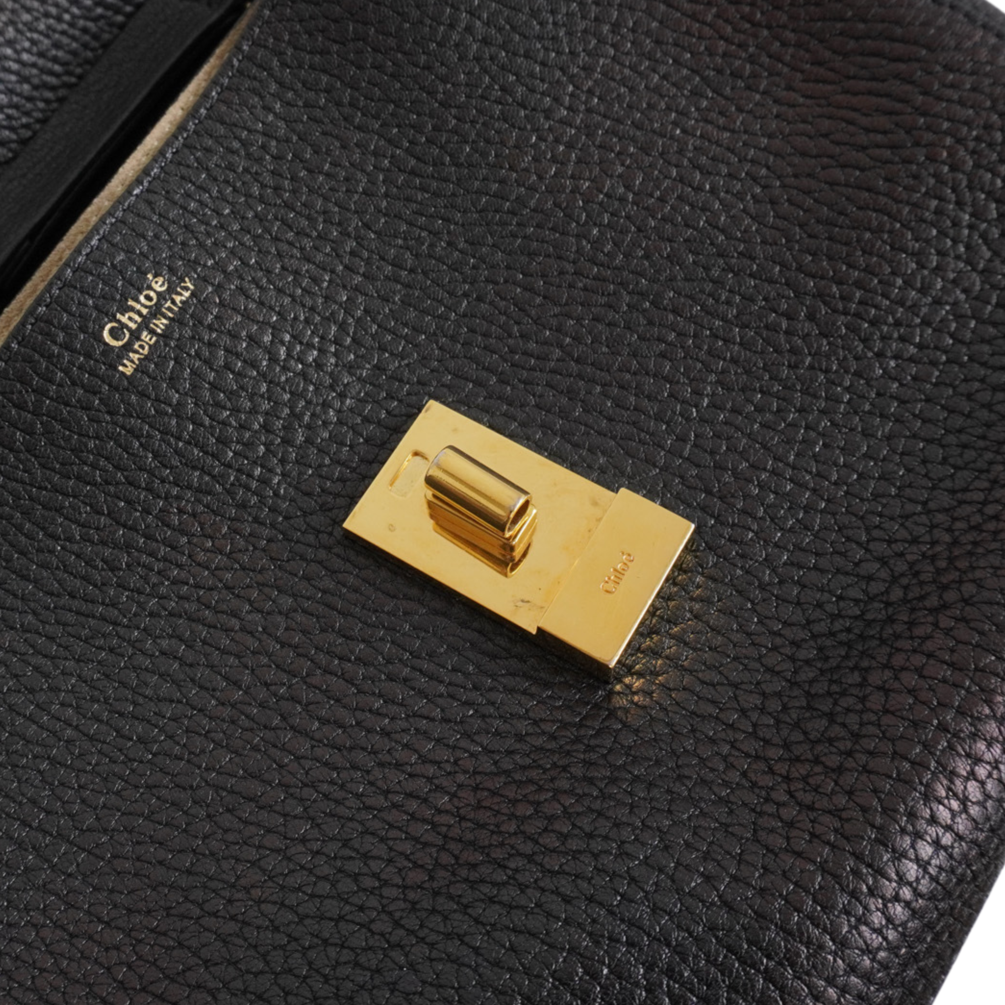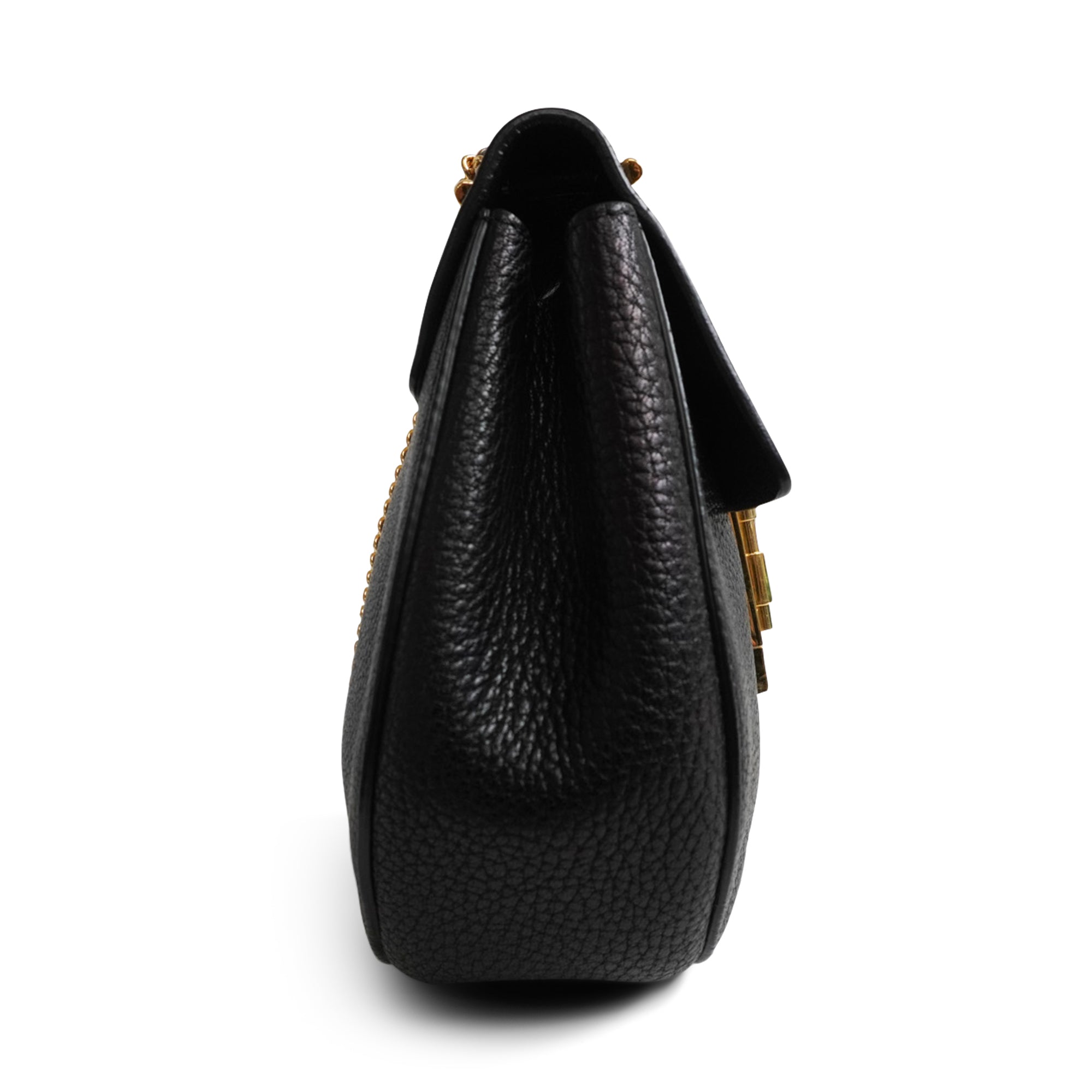 Chloe 'Drew' bag in grained black leather with gold hardware and a chain crossbody strap. Features a turnlock closure with metal bar lock detail. The bag is lined with beige suede and has a single slip pocket.
