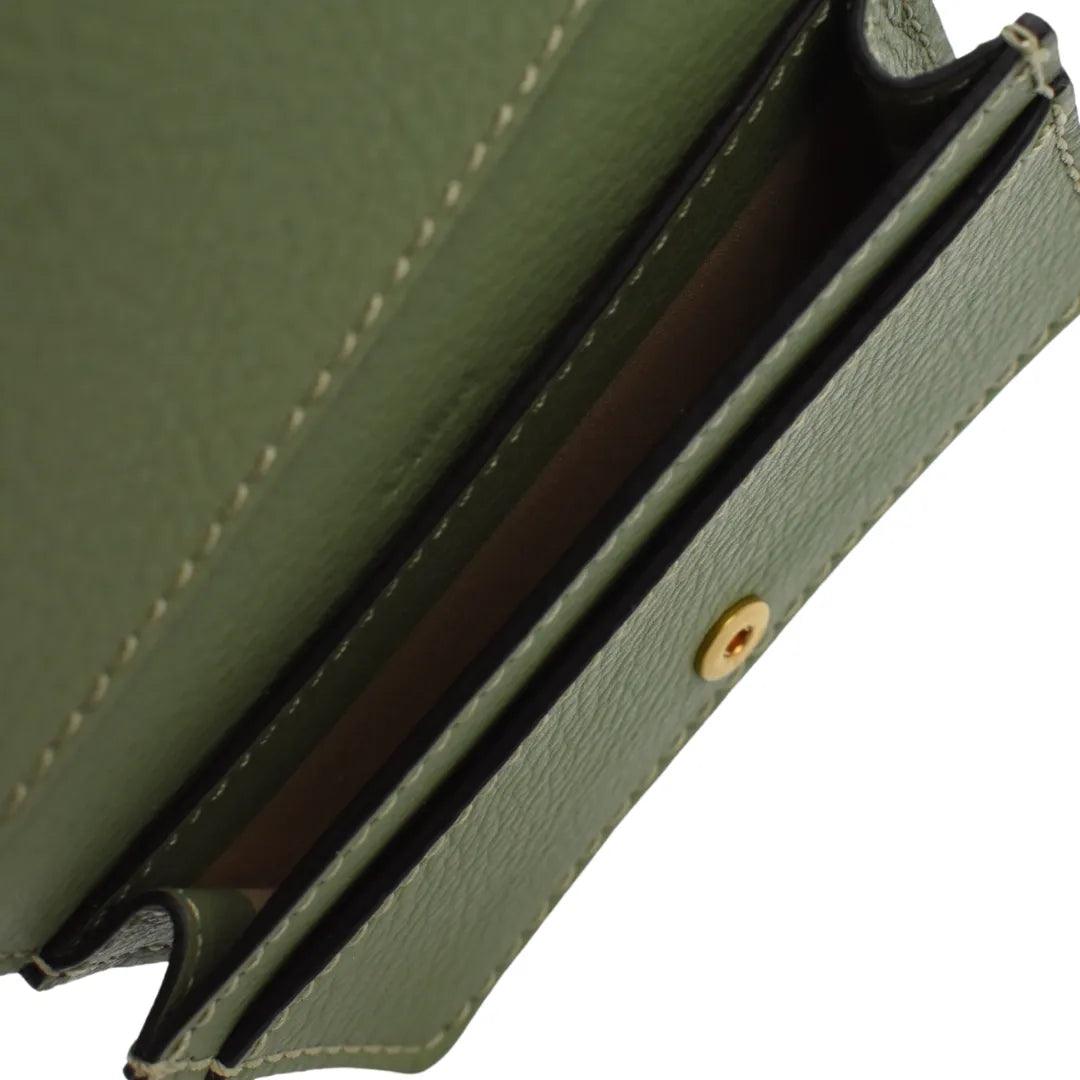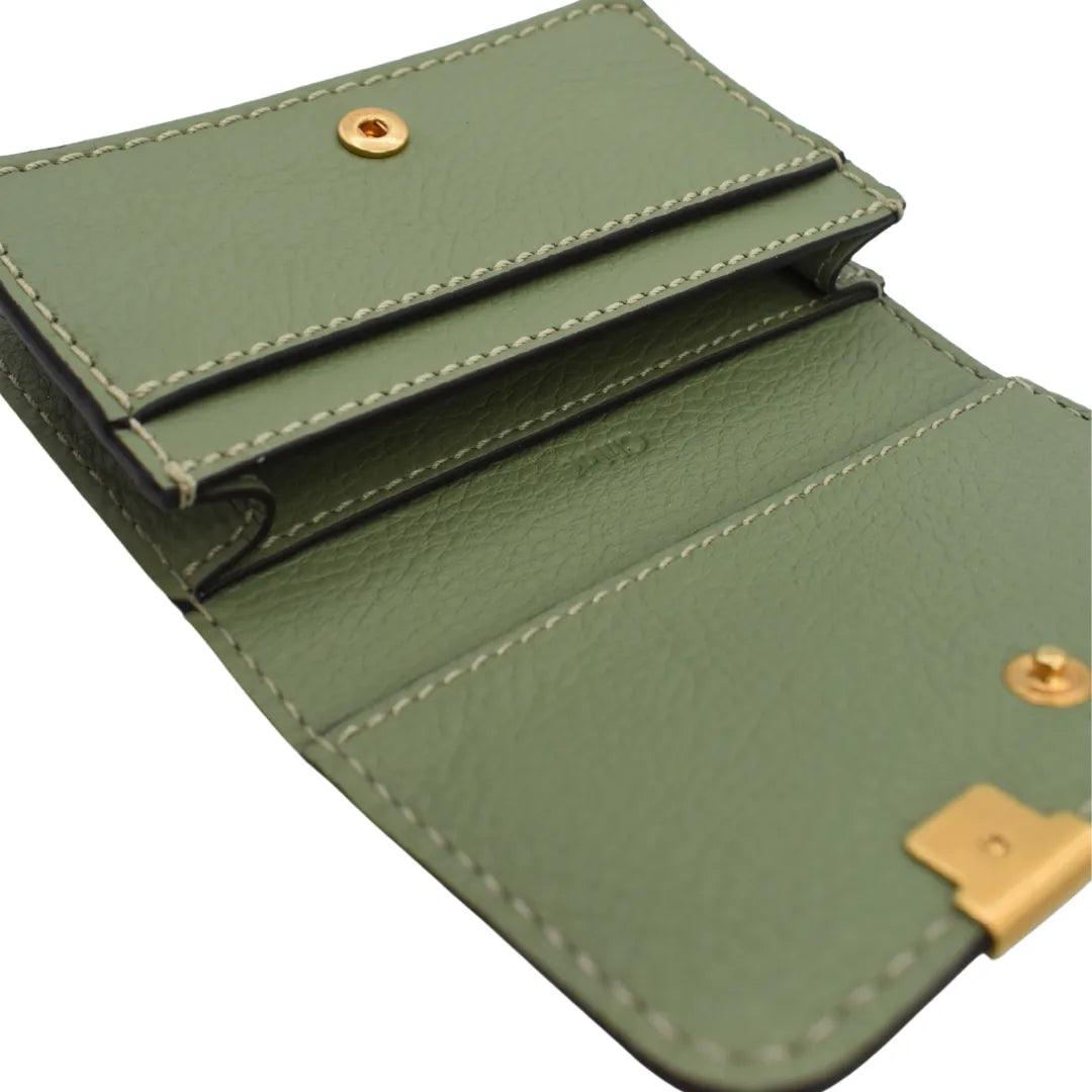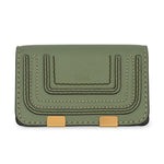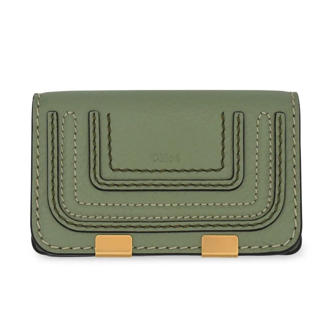 Chloe 'Marcie' small cardholder wallet in sage green leather. Features gold hardware, a snap-button closure, and black glue trim. The interior features a large compartment and a slip-pocket.