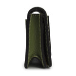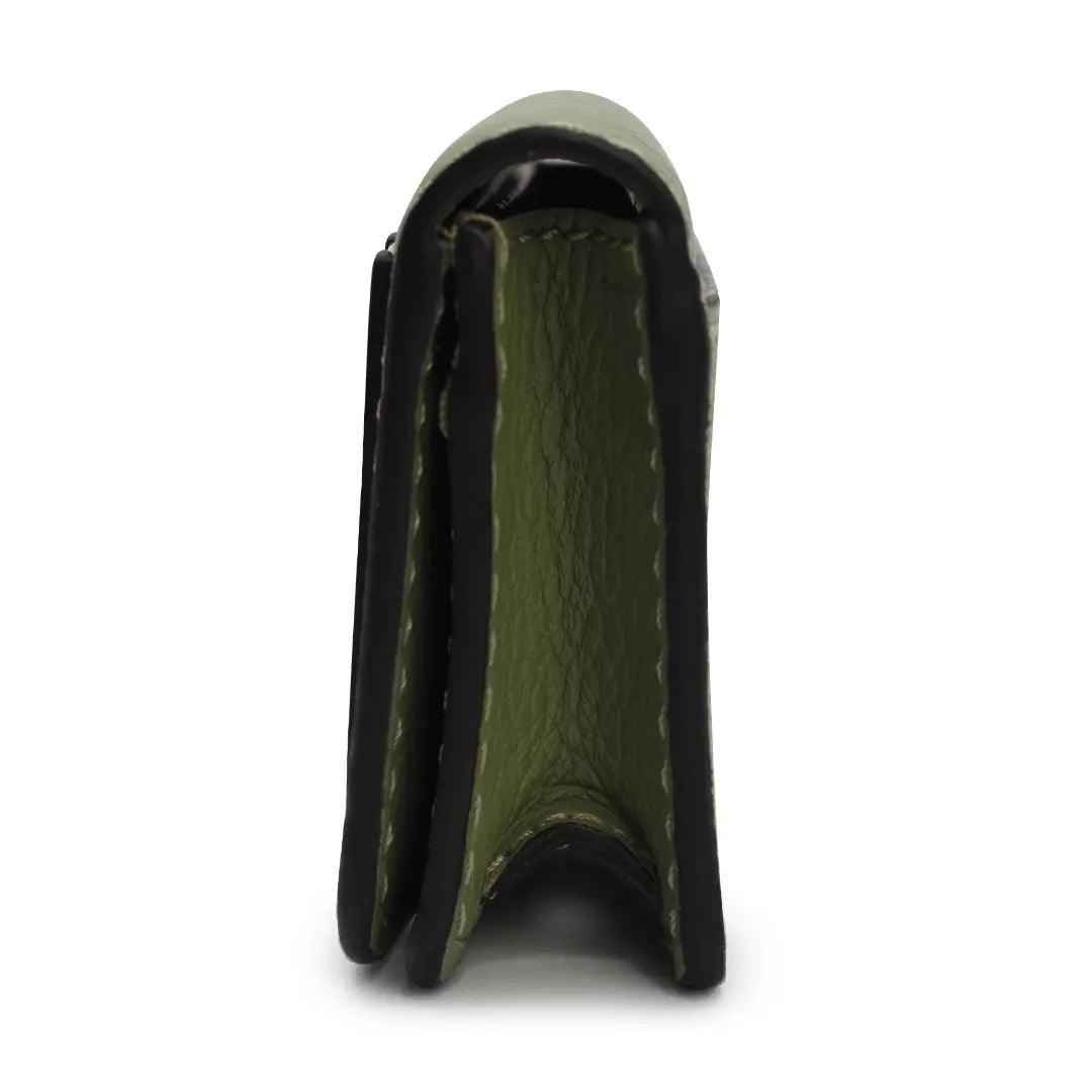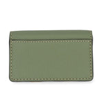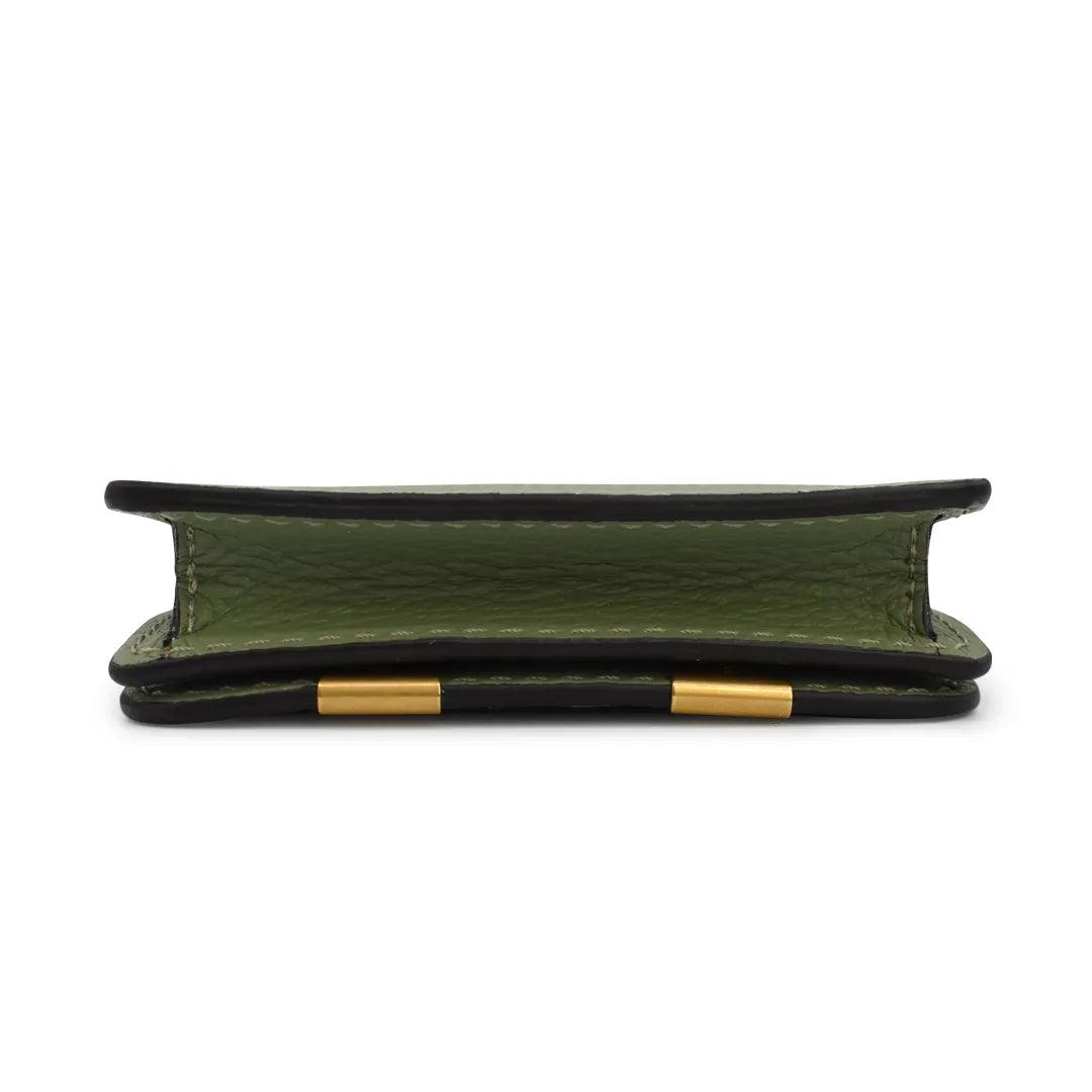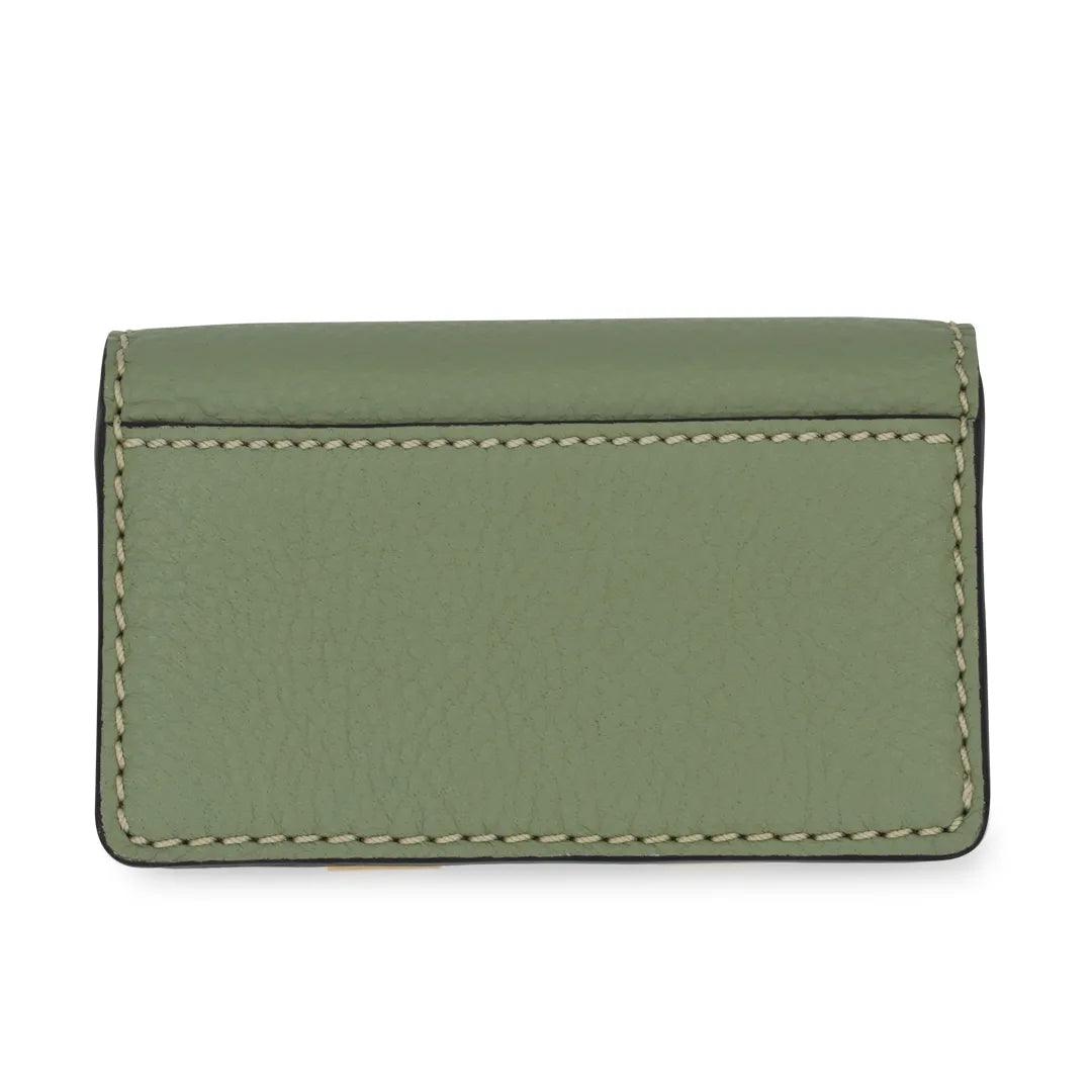 Chloe 'Marcie' small cardholder wallet in sage green leather. Features gold hardware, a snap-button closure, and black glue trim. The interior features a large compartment and a slip-pocket.