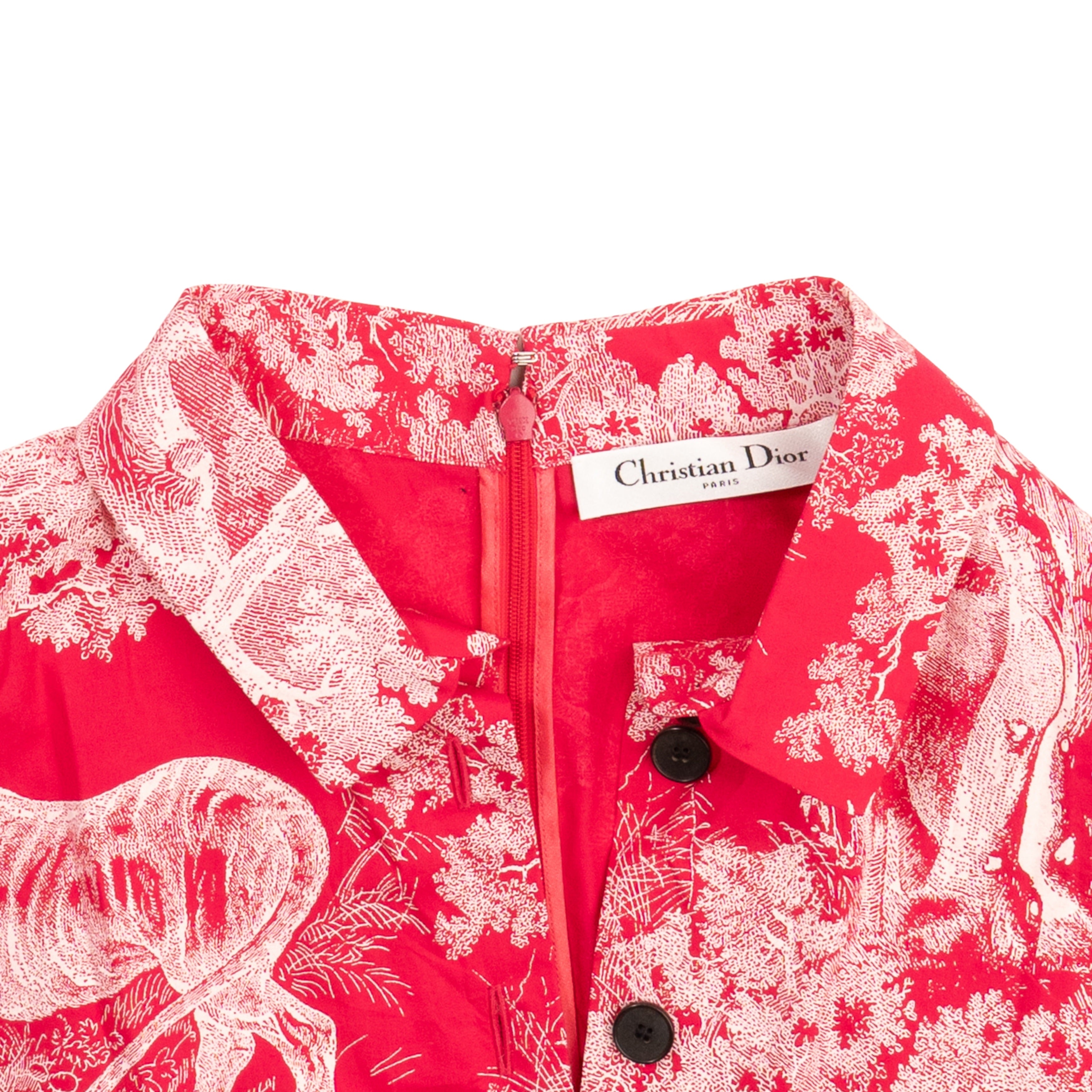Christian Dior short dress in fuschia and light pink 'Dioriviera' Toile du Jouy printed cotton with black buttons down the chest, short sleeves, and a pleated skirt.