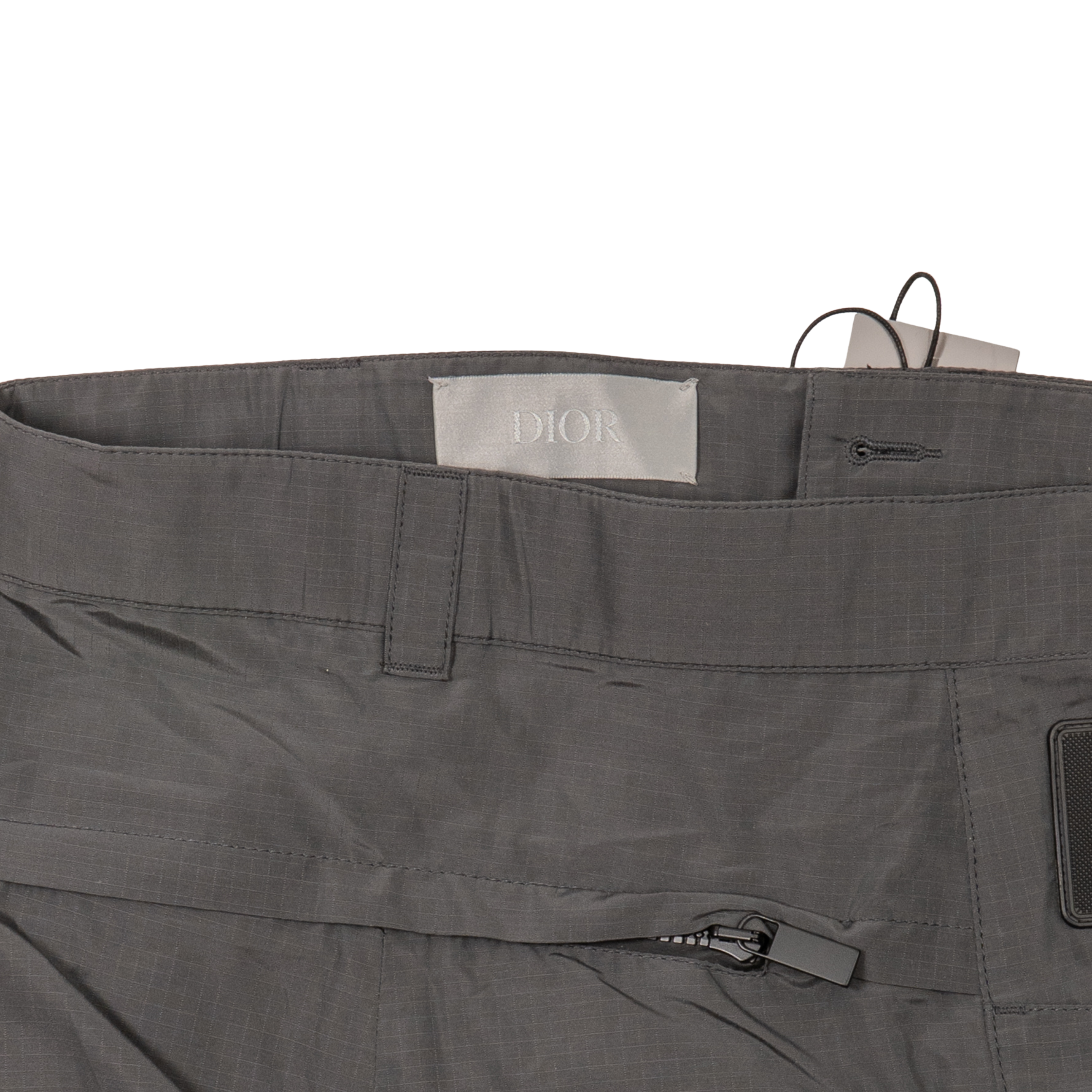 Christian Dior tapered cargo pants in grey ripstop nylon. Features large patch pockets on the sides, zip pocket across the back, adjustable cords at the ankles, and a black rubber logo on the back.
