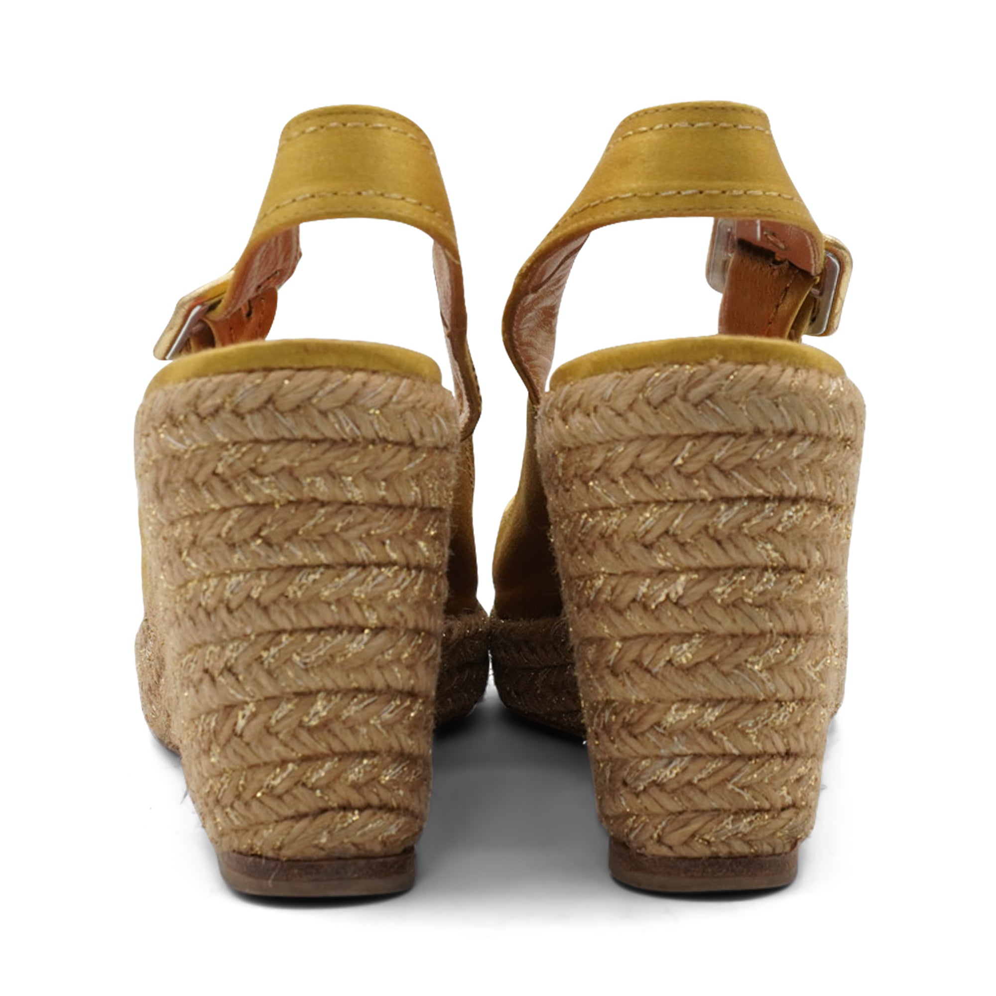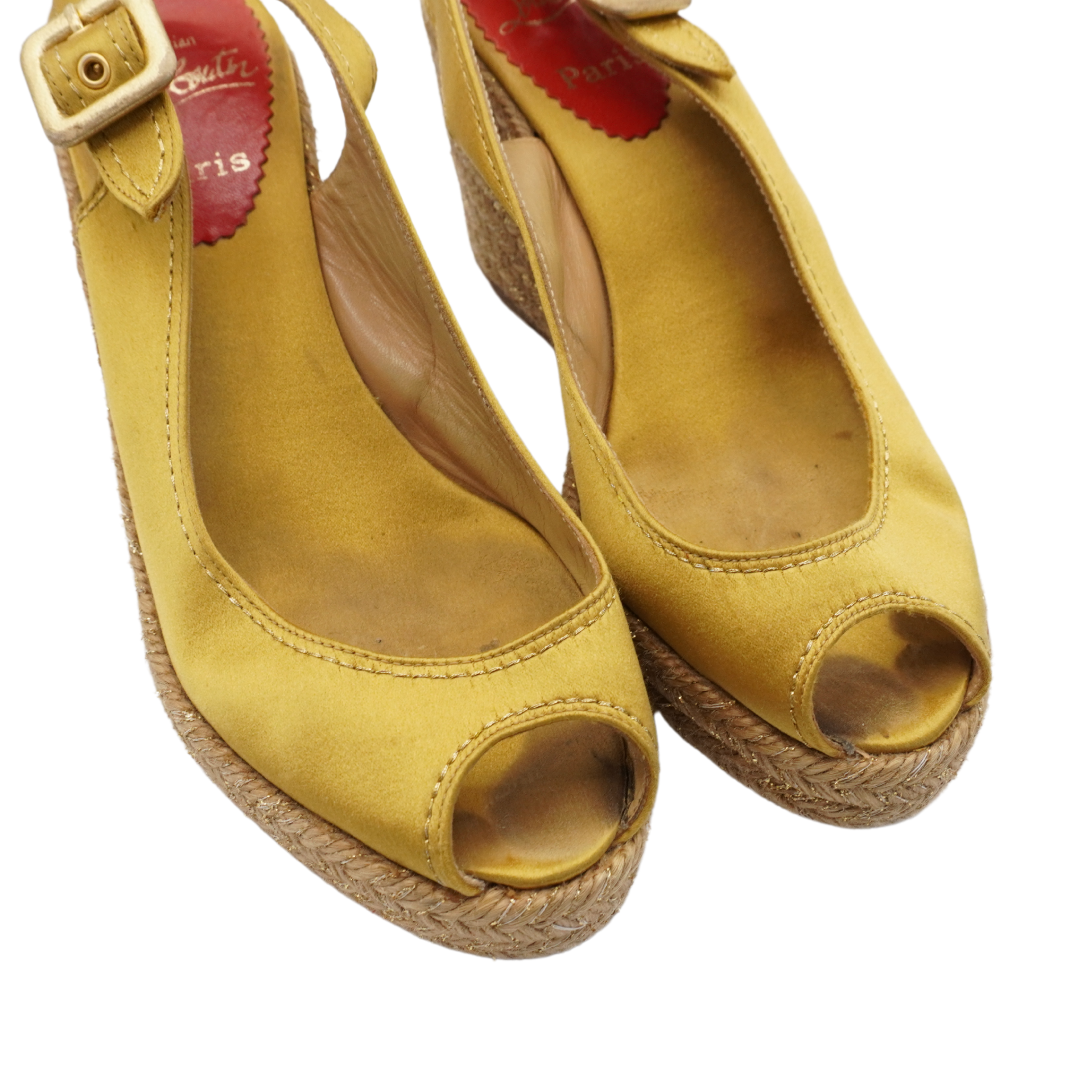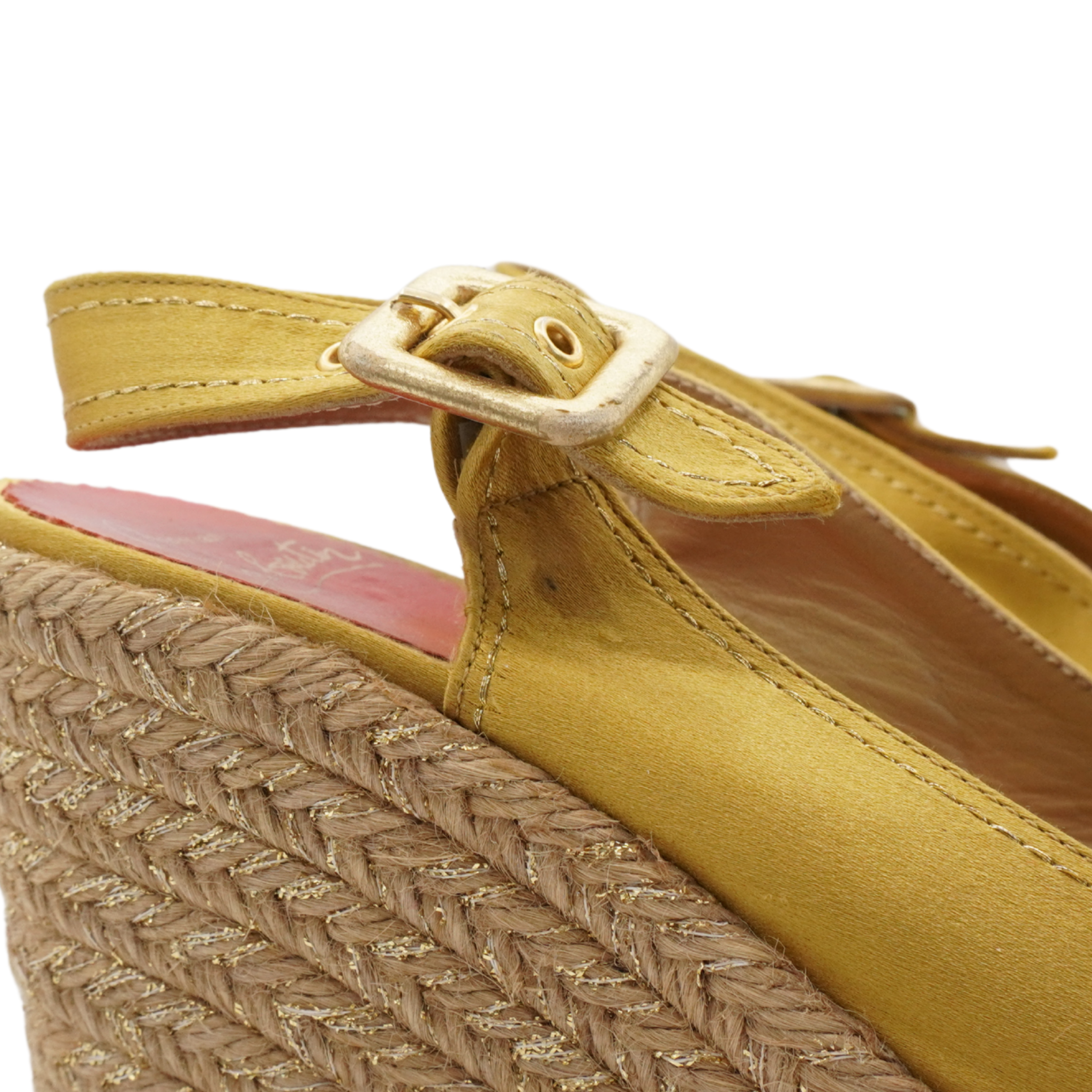 Christian Louboutin 'Menorca' peep toe, slingback sandals in gold satin with gold leather buckles. Feature braided espadrille platform wedges with gold metallic threads woven throughout.