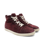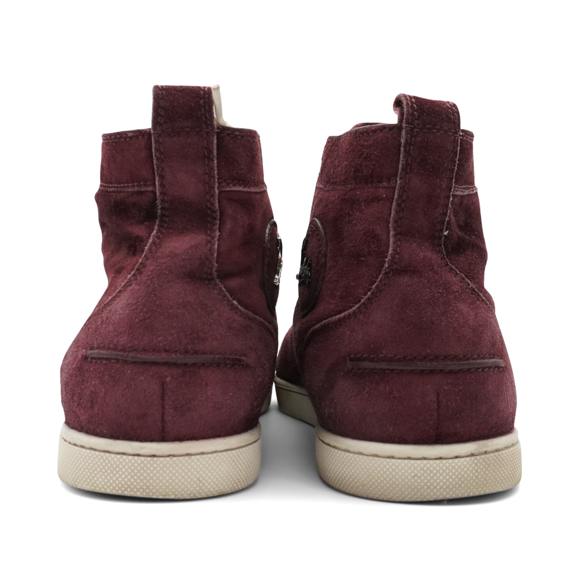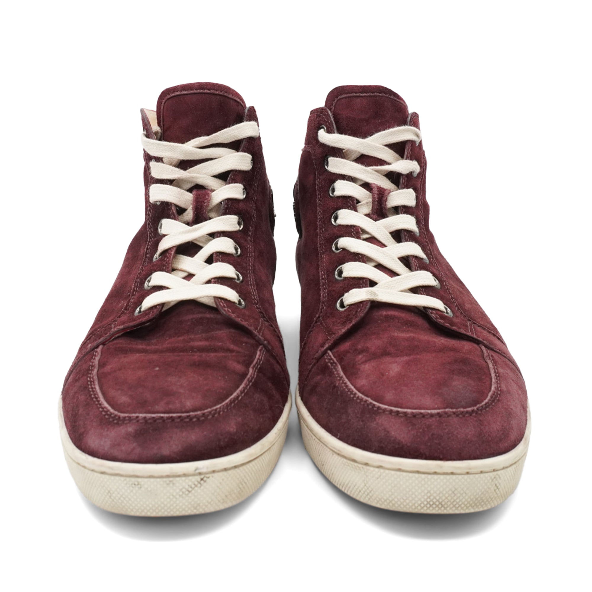 Christian Louboutin 'Rantus' high-top sneakers in burgundy suede leather. Features a white rubber sole, lace-up closure, and a logo plaque in gunmetal hardware on the side with a red bottom sole.