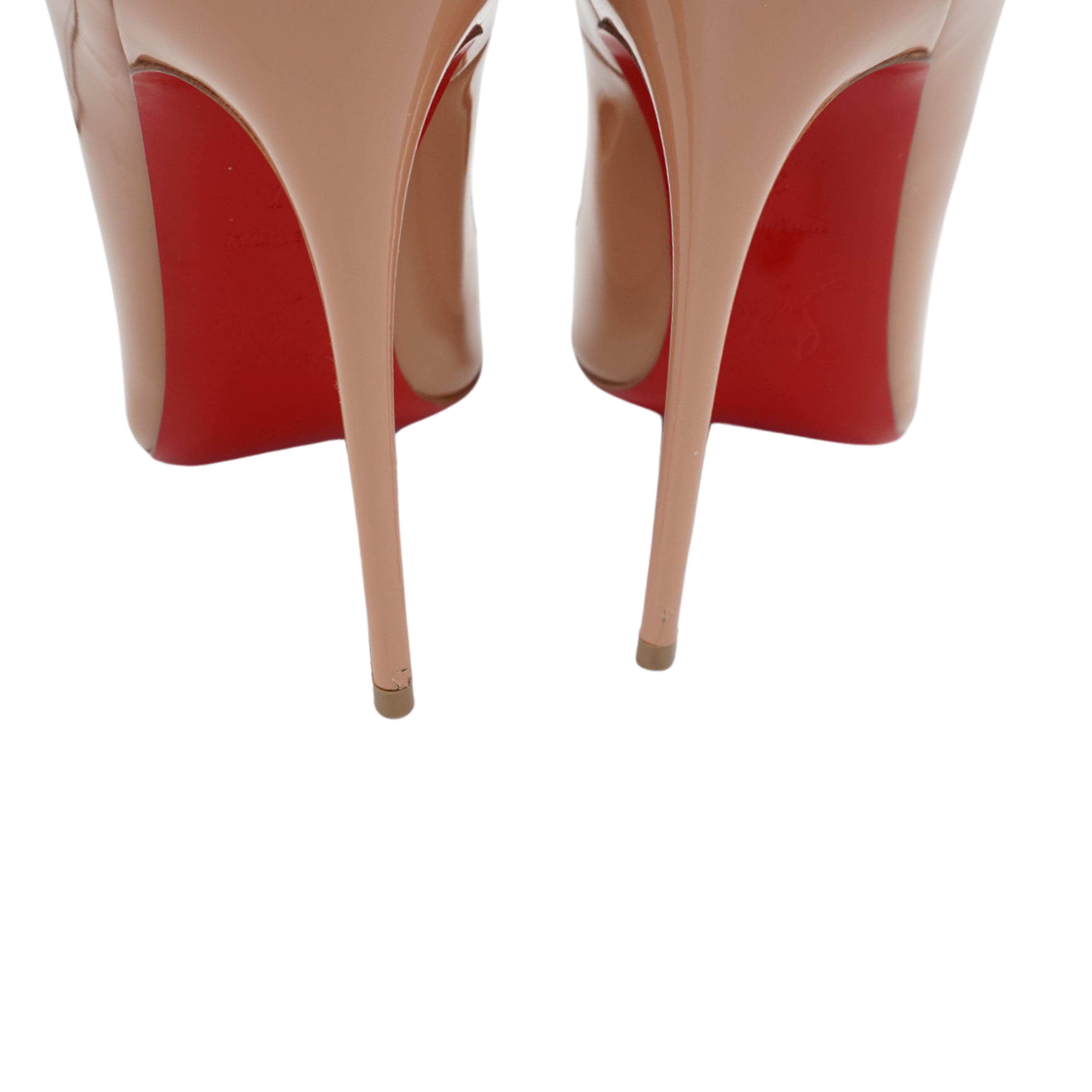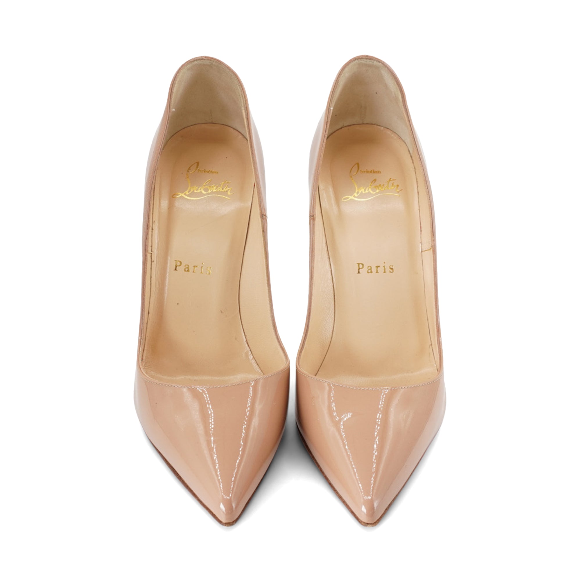Christian Louboutin 'So Kate 120' pointed toe stiletto heels in nude patent leather.