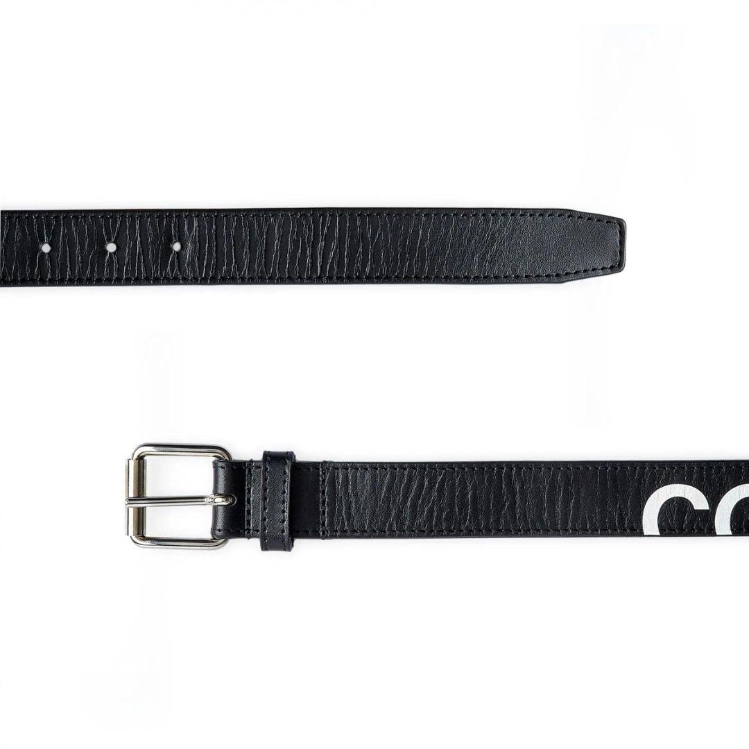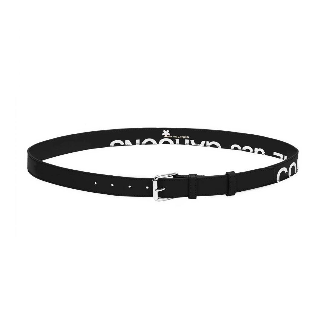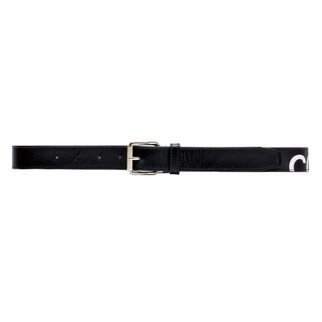 Comme Des Garcons 'Huge Logo' belt in black leather with white logo print and a silver buckle.