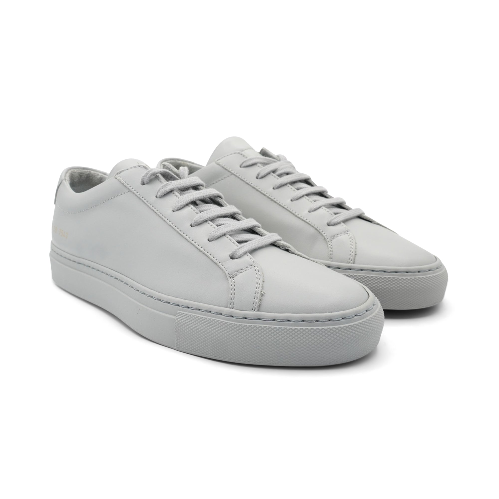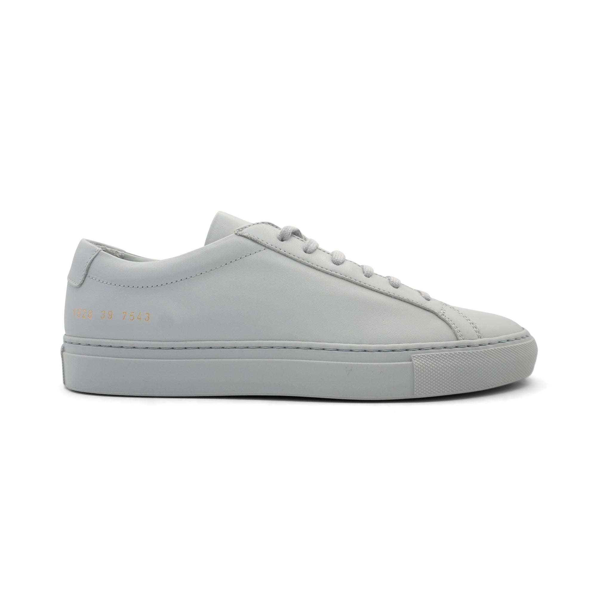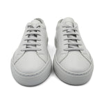 Common Projects 'Achillies Low' sneakers in smooth grey leather with tonal laces and soles. Feature gold foil stamping on the outer heel.