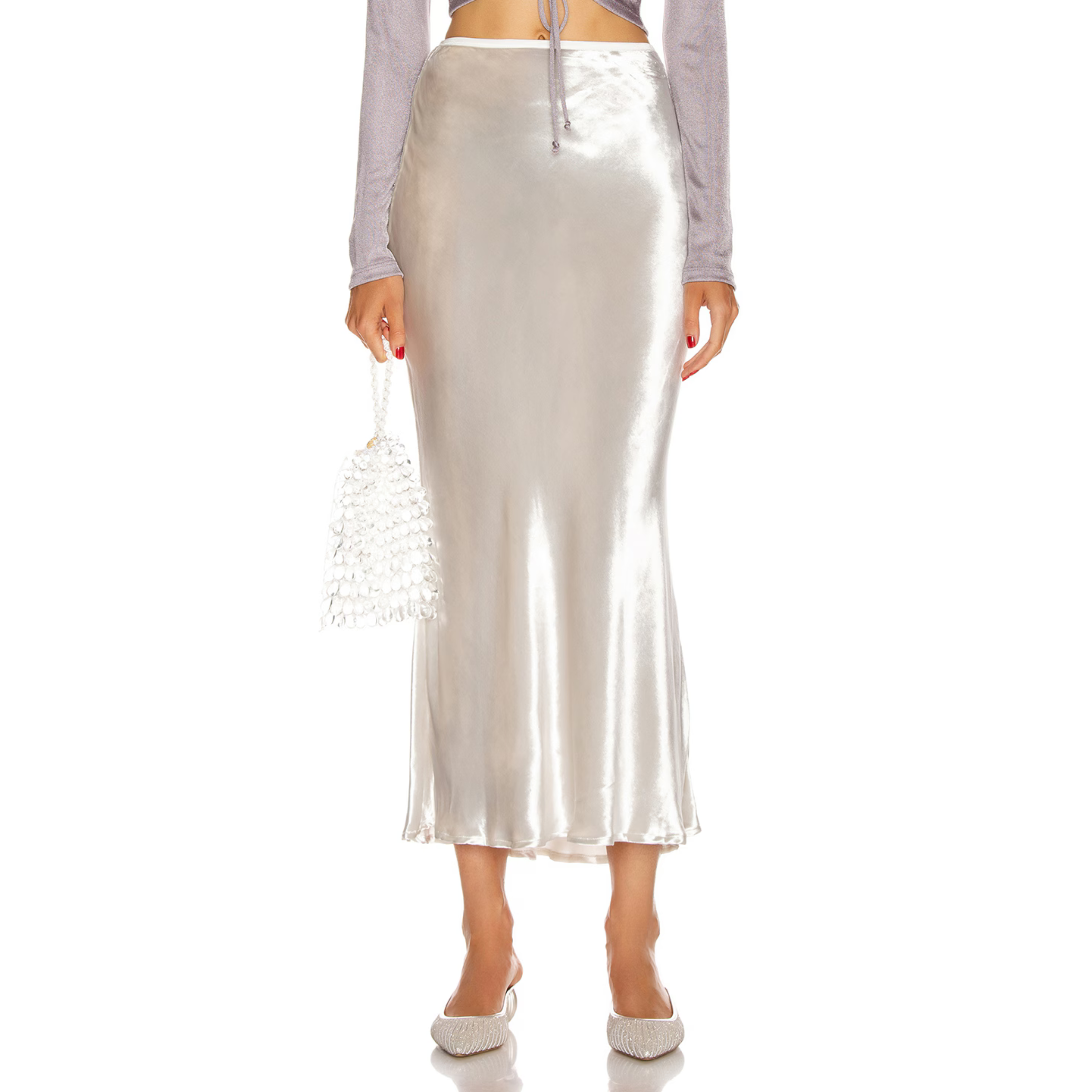 Cult Gaia 'Scarlett' bias cut full length slip skirt in pearl white velvet with elastic waistband and slight a-line fit.