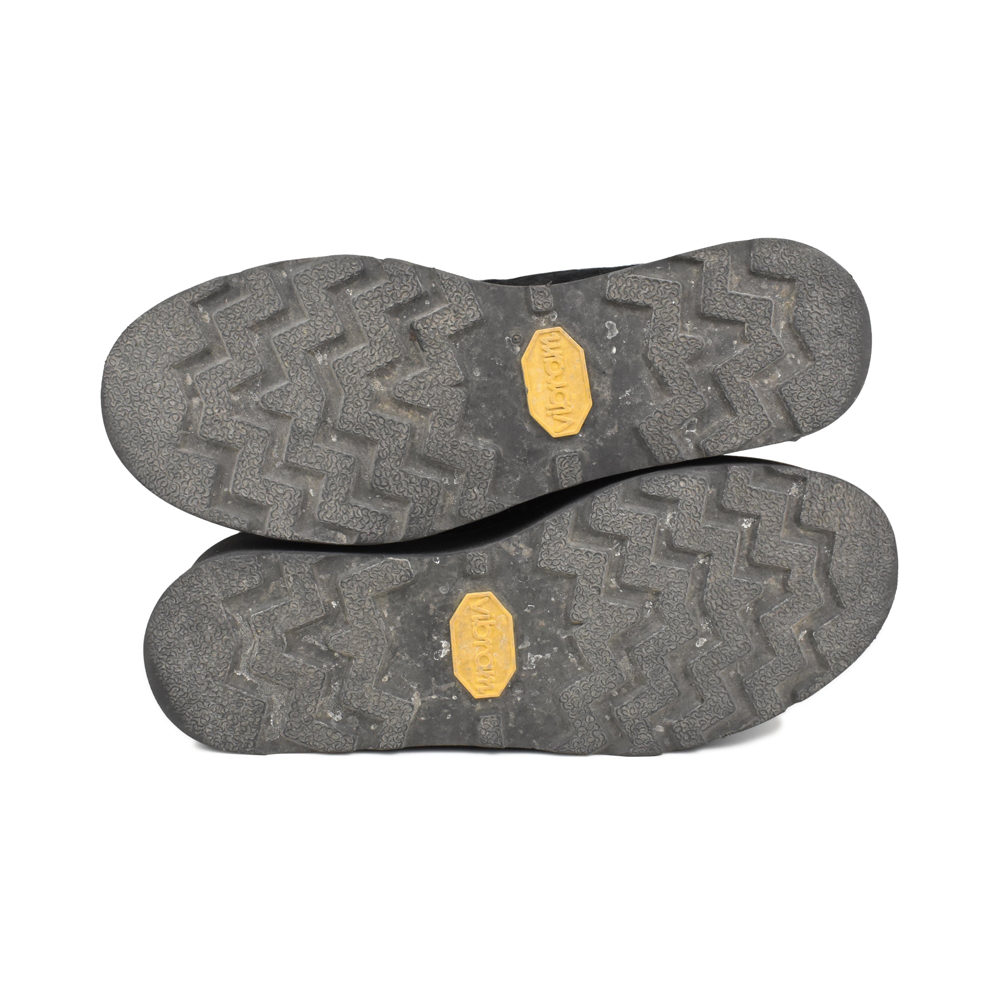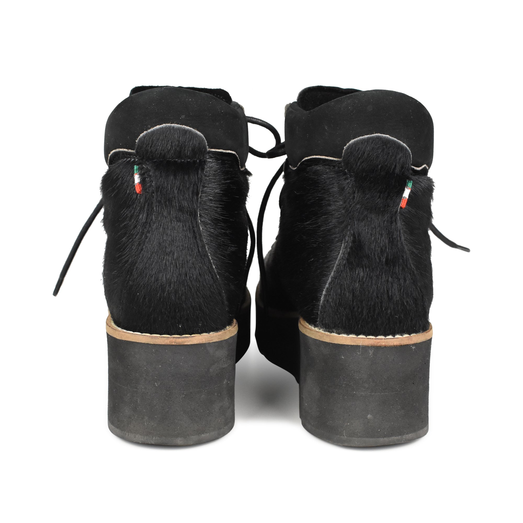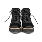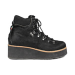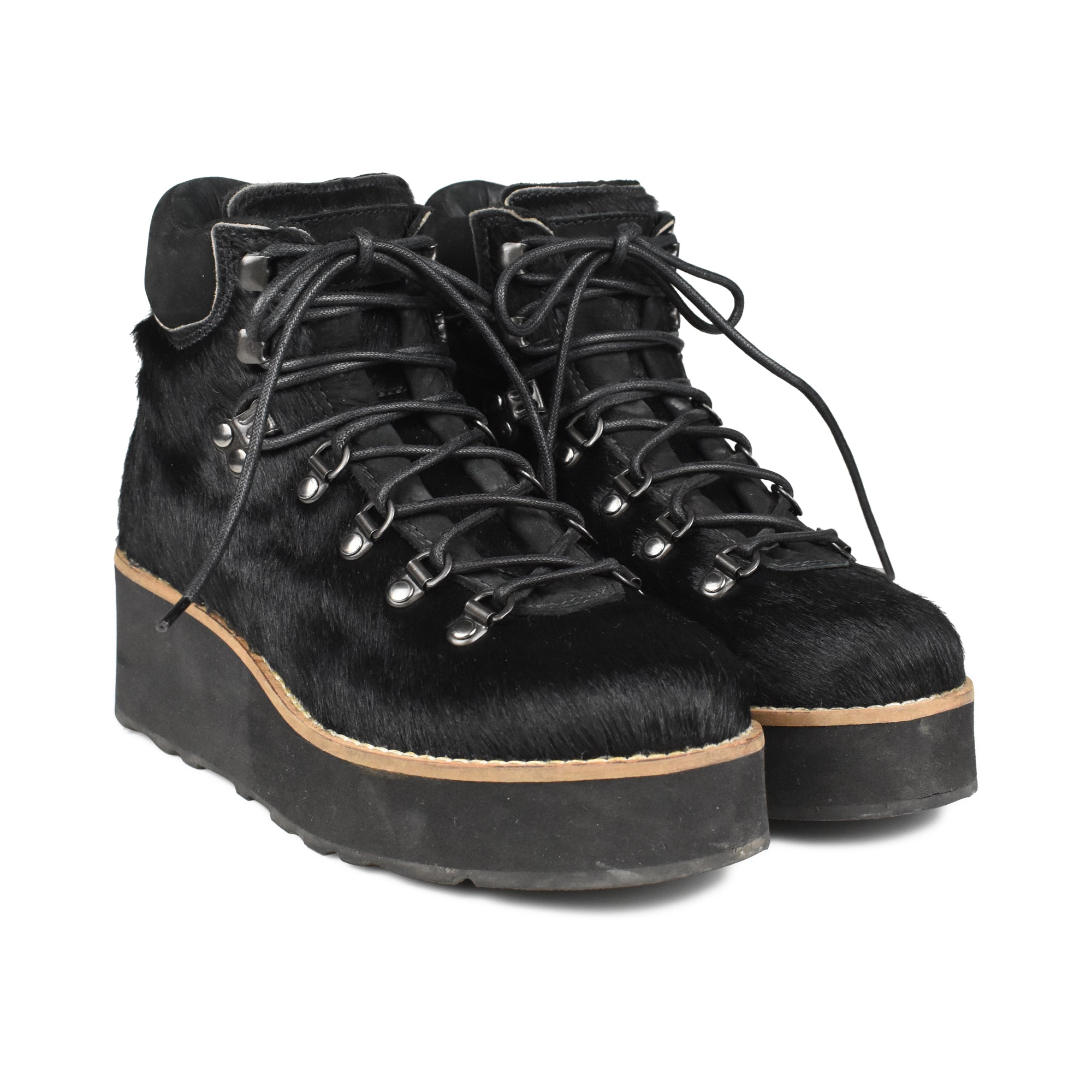 Diemme hiking style boots in black calf hair with platform wedge soles, black suede cuffs, and Vibram soles.