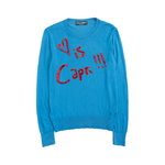 Dolce & Gabbana 'Love Is' crewneck sweater in blue fine knit silk with red sequin embroidered writing on the chest.