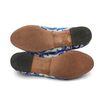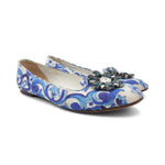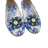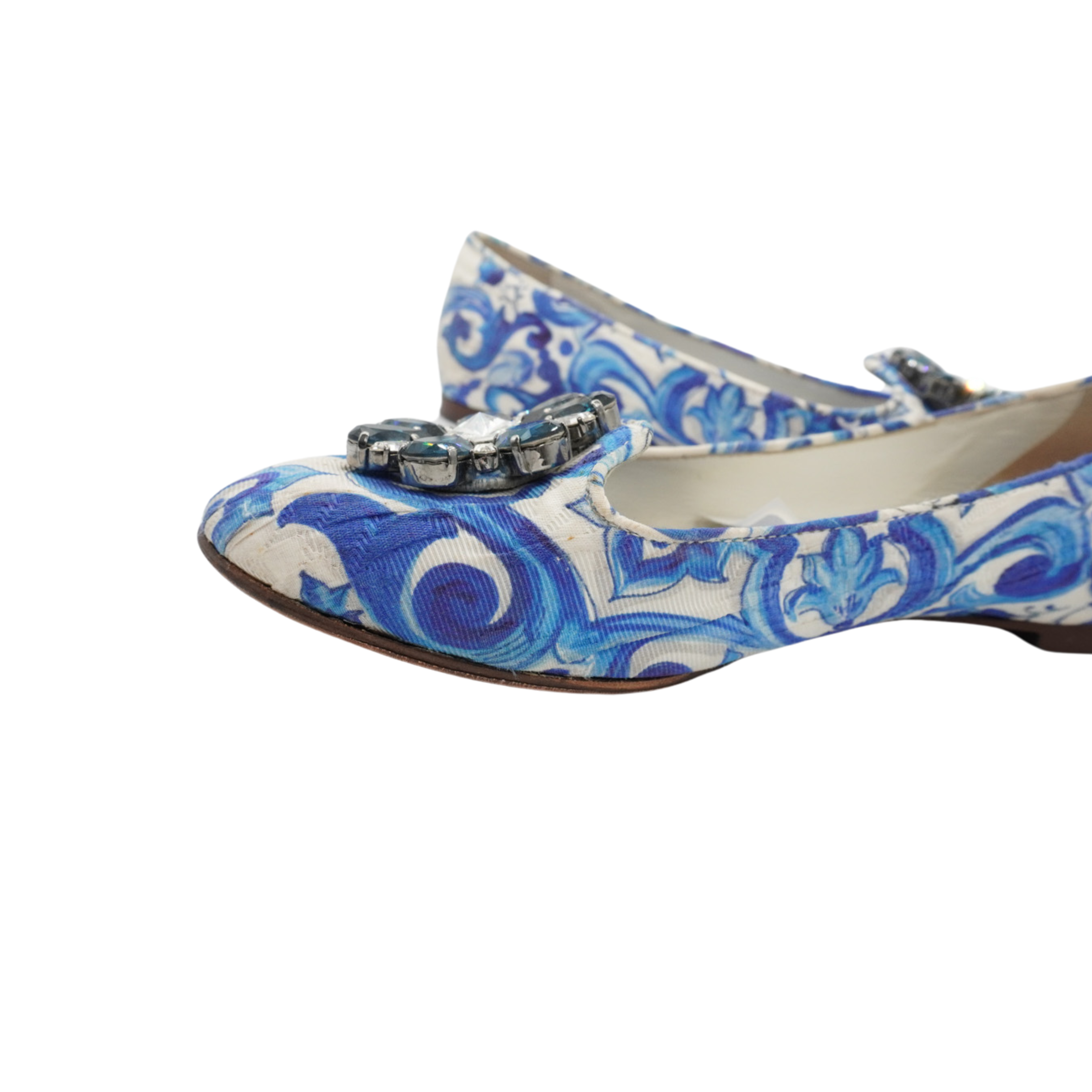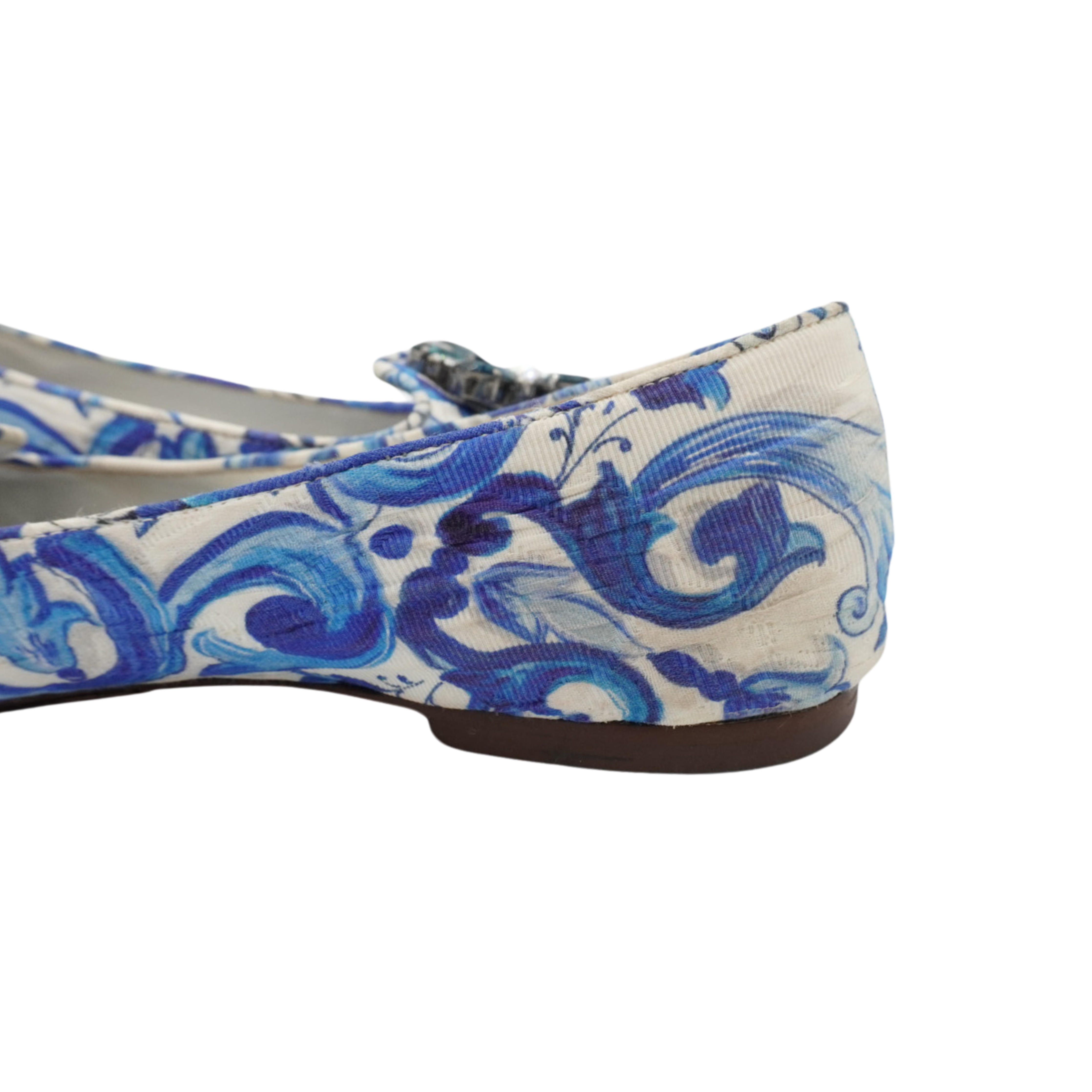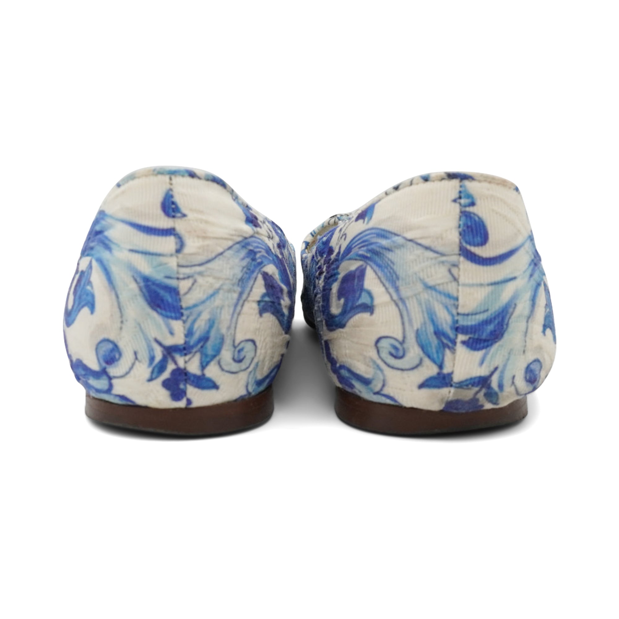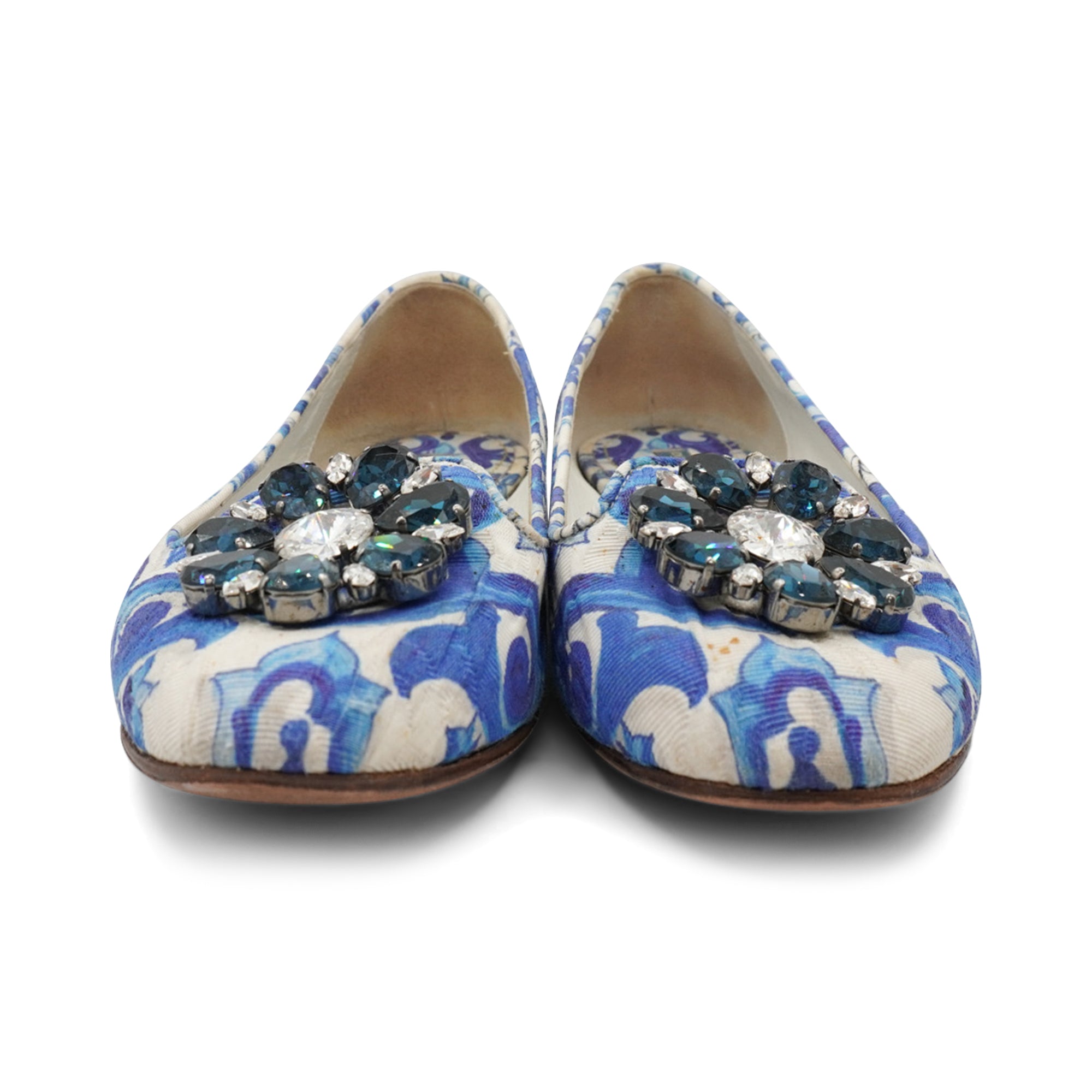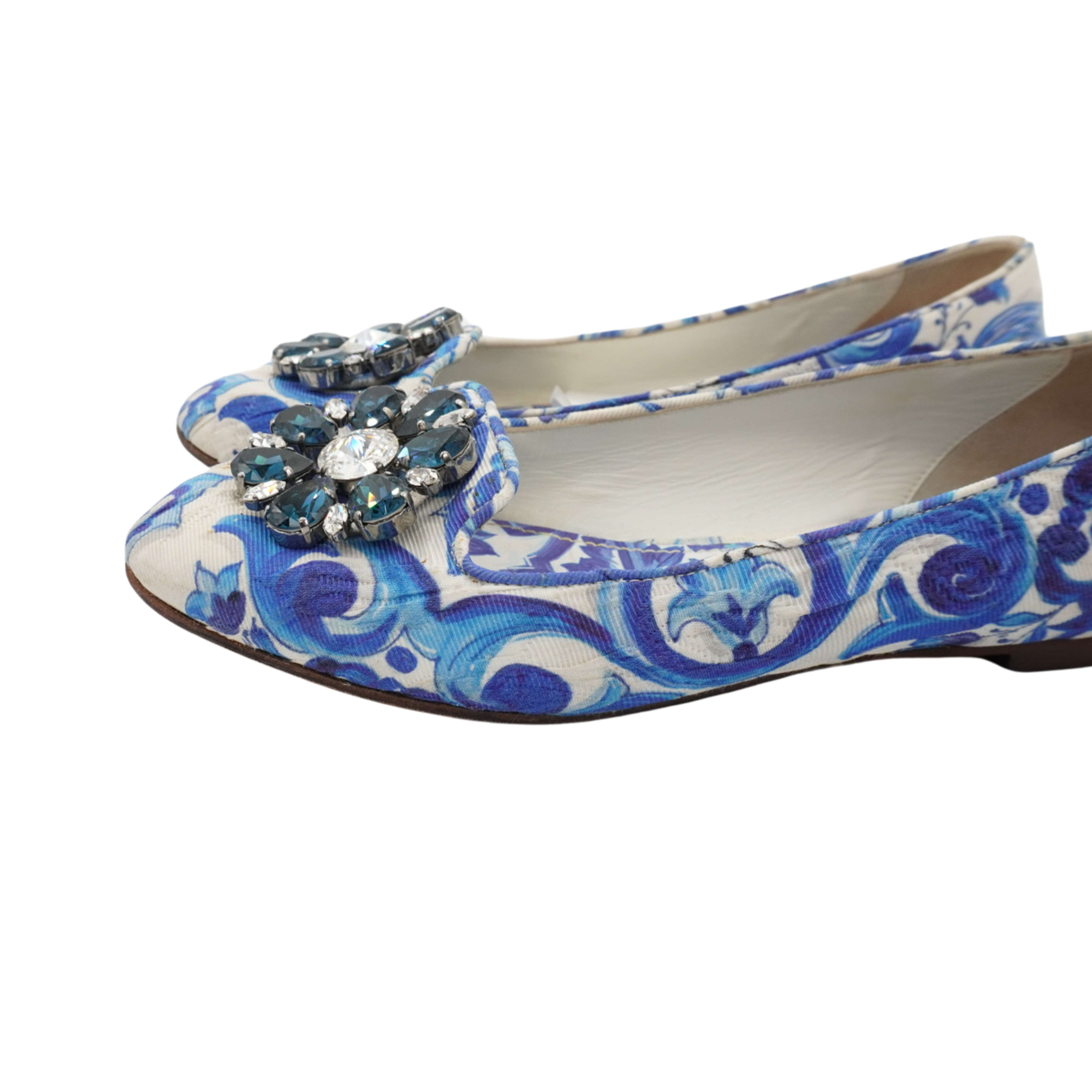 Dolce & Gabbana 'Majolica Tile' flats in blue and white printed jacquard fabric with blue and white crystal embellishment on the toe box.