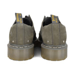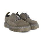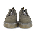 Dr Martens x A Cold Wall '1461 Bex' platform loafers in grey nubuck leather and grey rubber sole. Features white stitching around the sole, zipper detail on the front in silver hardware with a grey rubber pull-tab, elasticized tongue, and grey and yellow heel pull-tab.