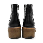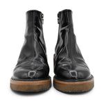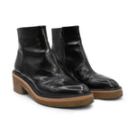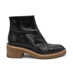Dries Van Noten 'Donna' Boots in black shiny patent leather with a round toe and brown platform gum sole. Features a side zip closure in gold hardware.