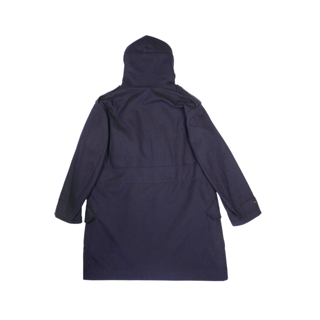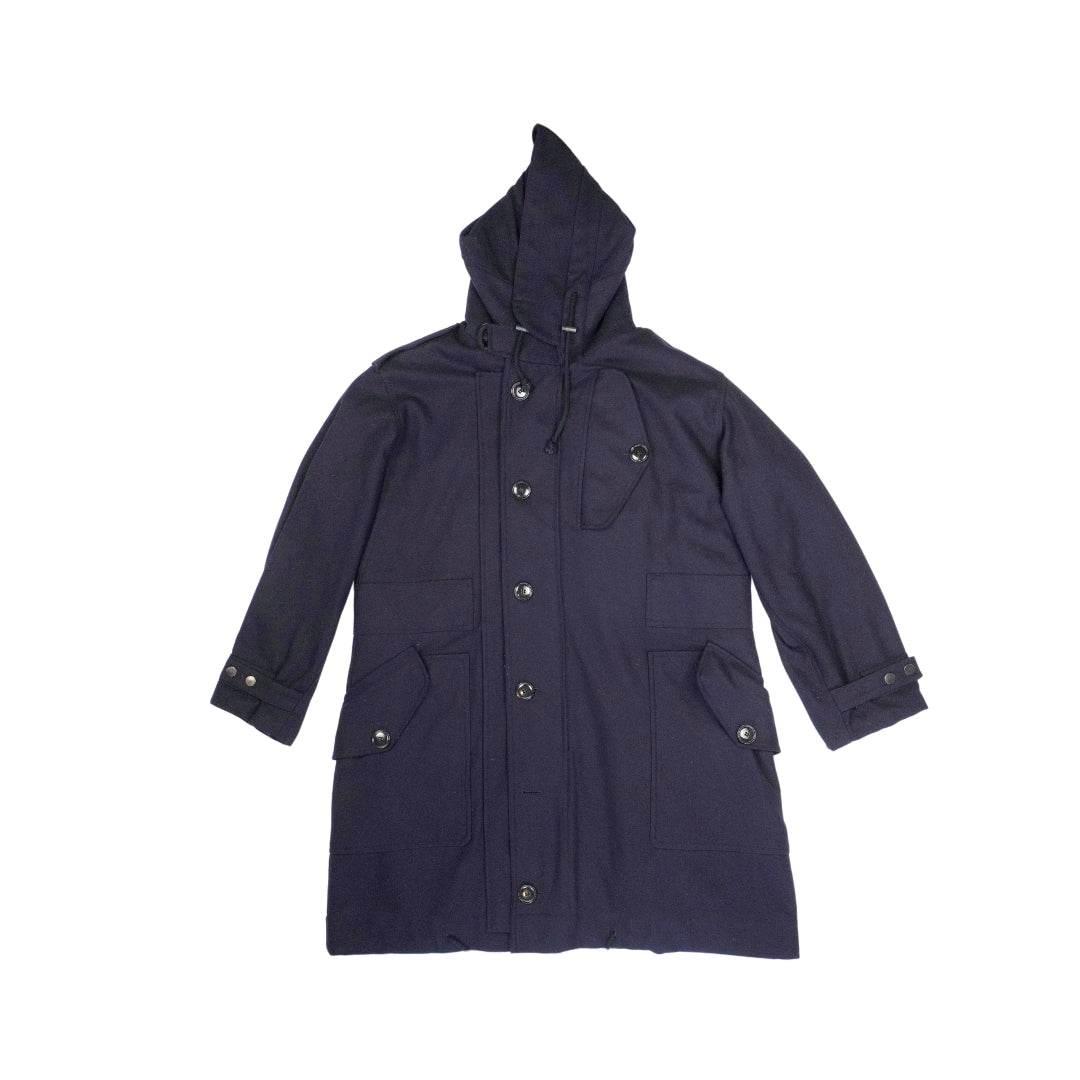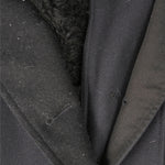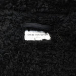 Dries Van Noten mid-length coat in navy wool with front zip closure in silver hardware and black button panel. Features black fuzzy lining and large flap pockets.