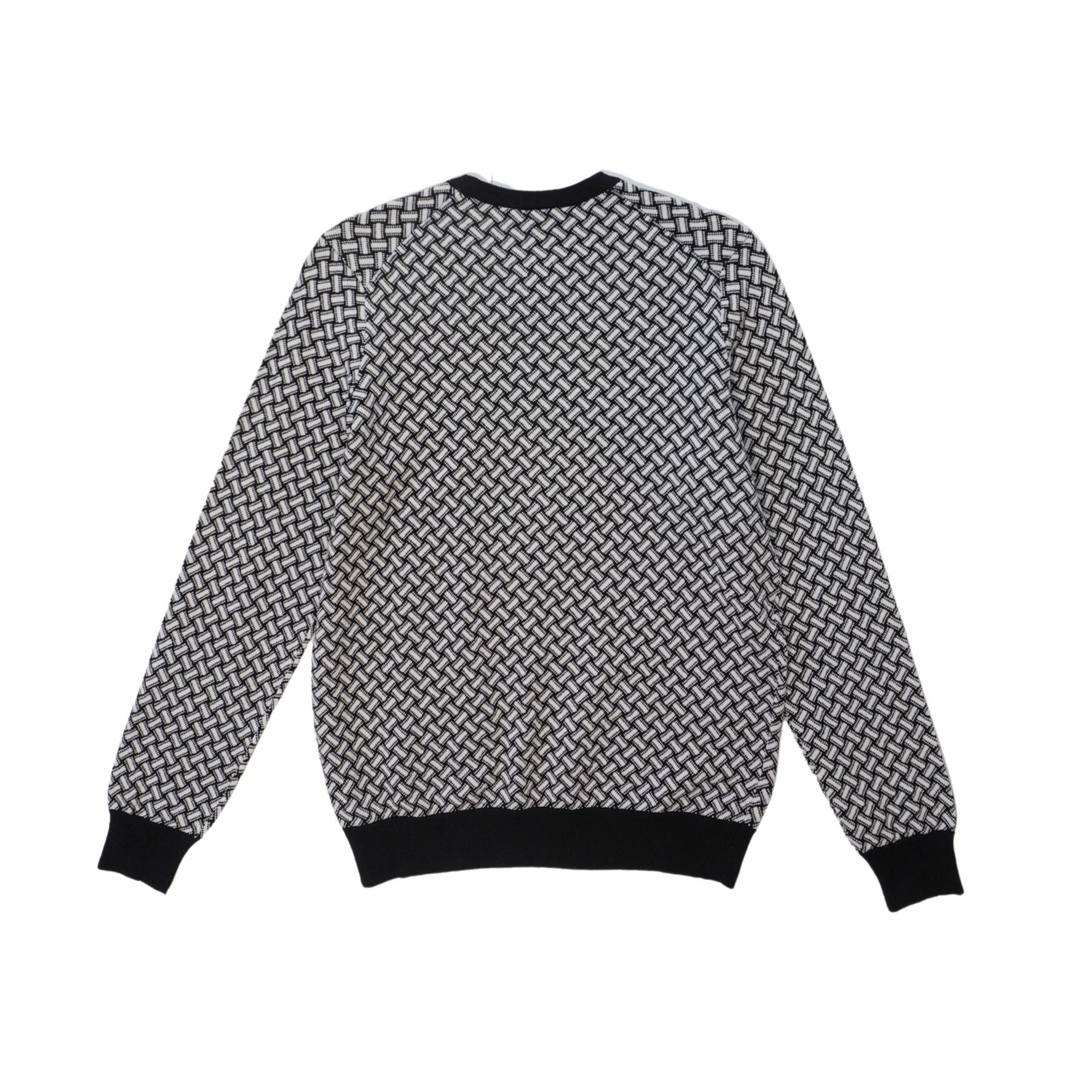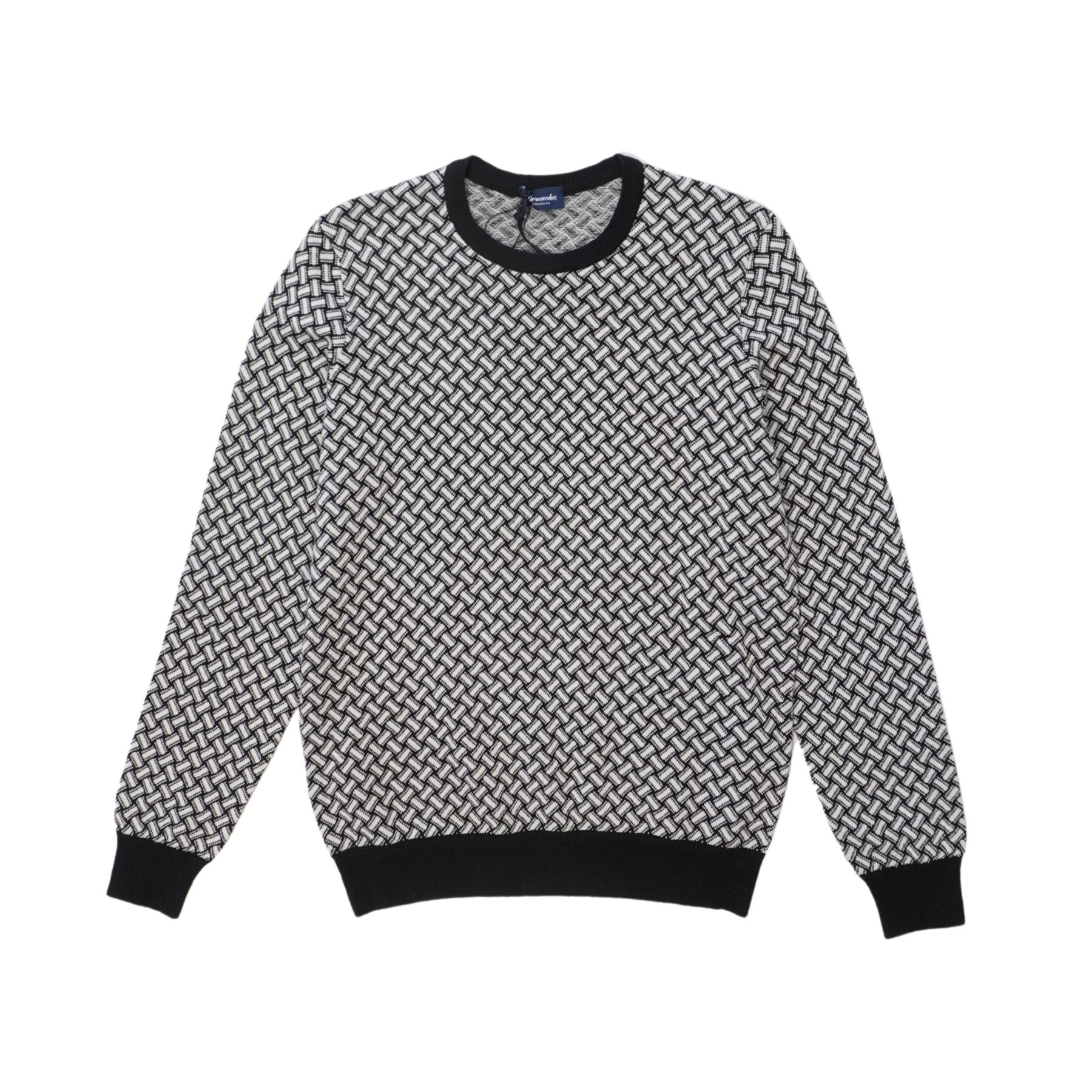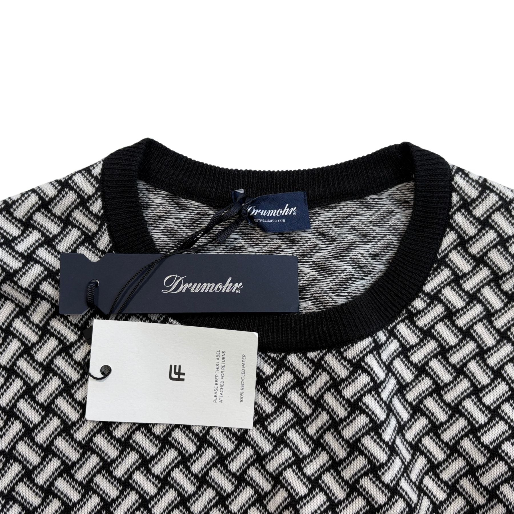 Drumohr 'Intarsia Knit' crewneck sweater in cotton knit with a black and white woven pattern with black ribbed neck trim and cuffs.