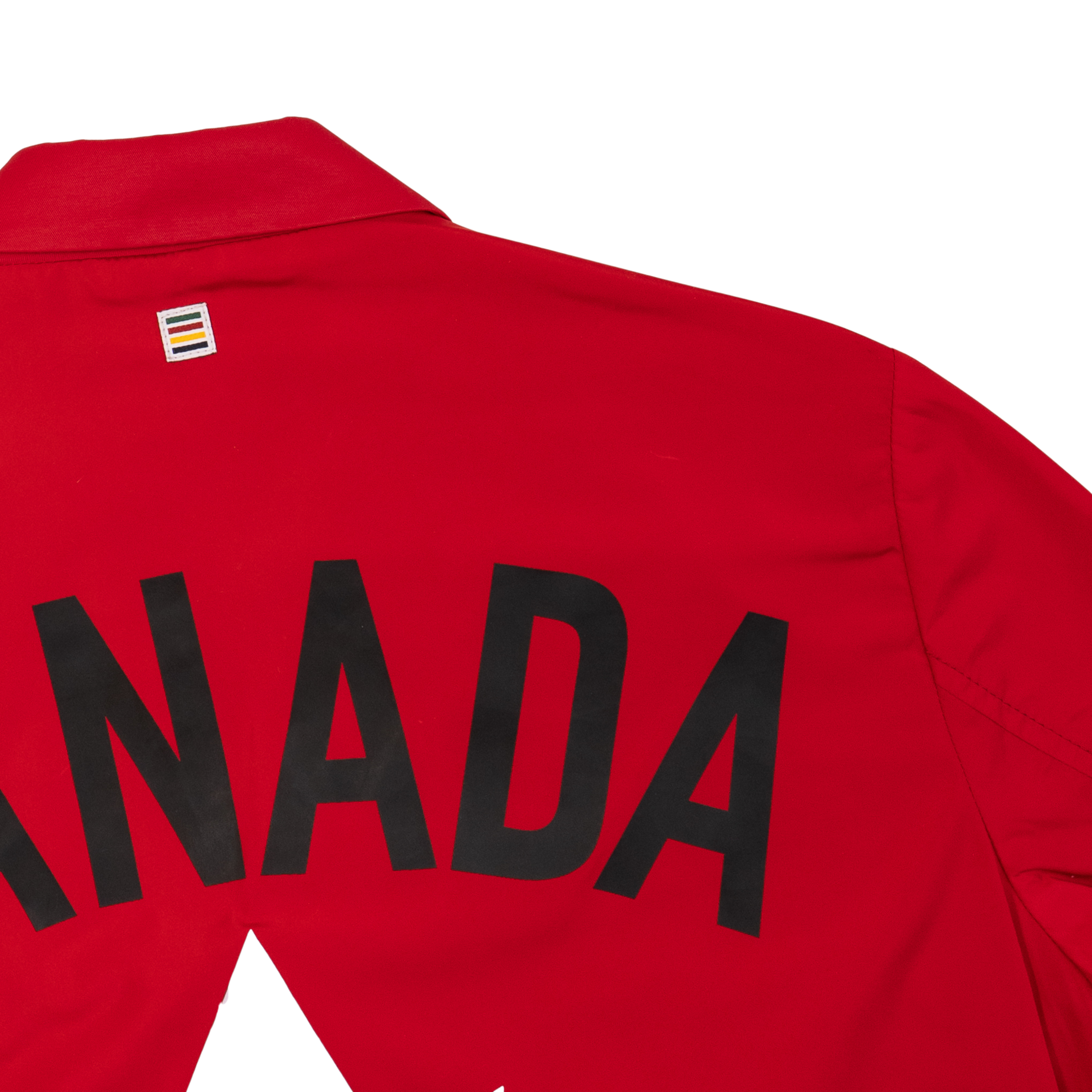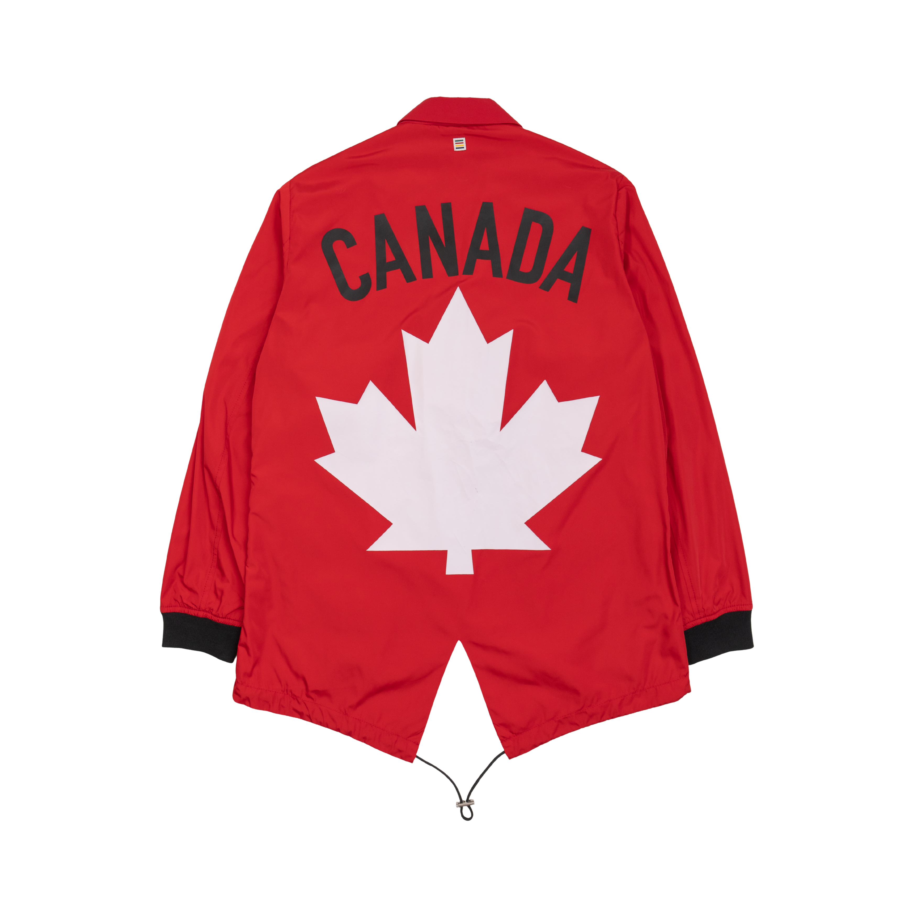 DSquared2 x Olympics x Hudson's Bay 2016 Rio Olympics Team Canada opening ceremony jacket. A red nylon blazer with three buttons down the front, three flap pockets on the front, a zip pocket on the chest, Canada Olympics logo, black ribbed cuffs, and a big black and white Team Canada graphic on the back.