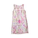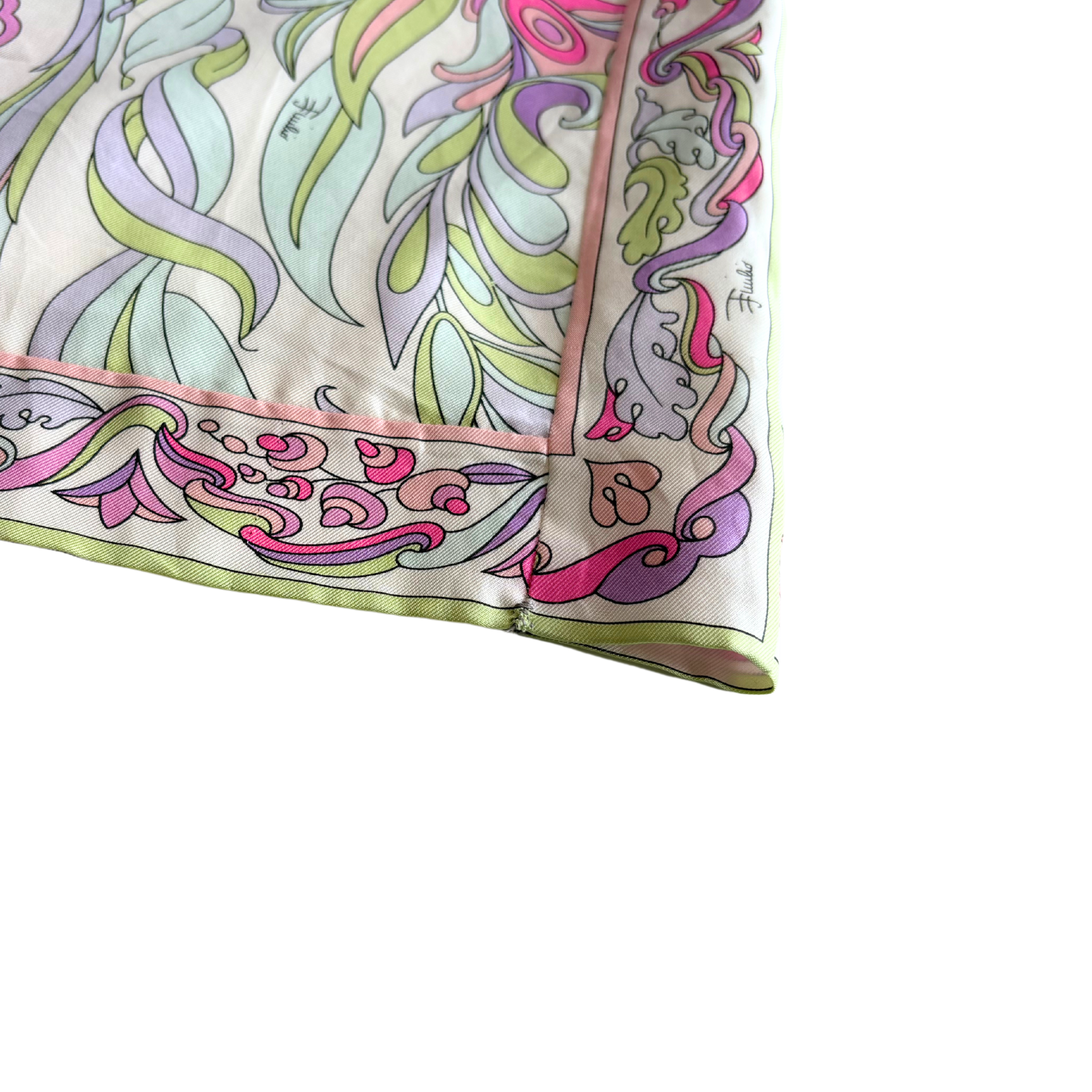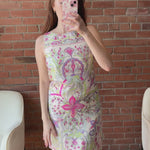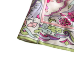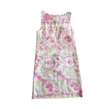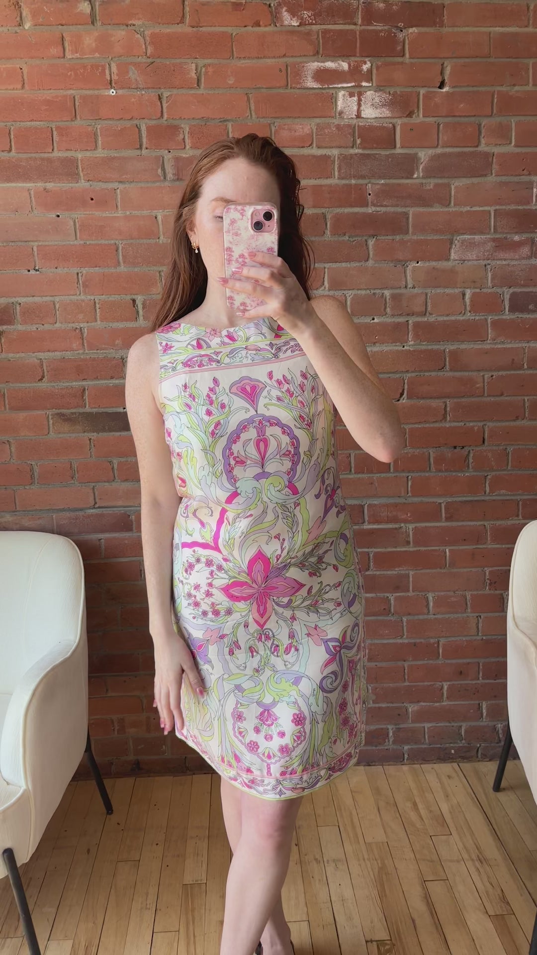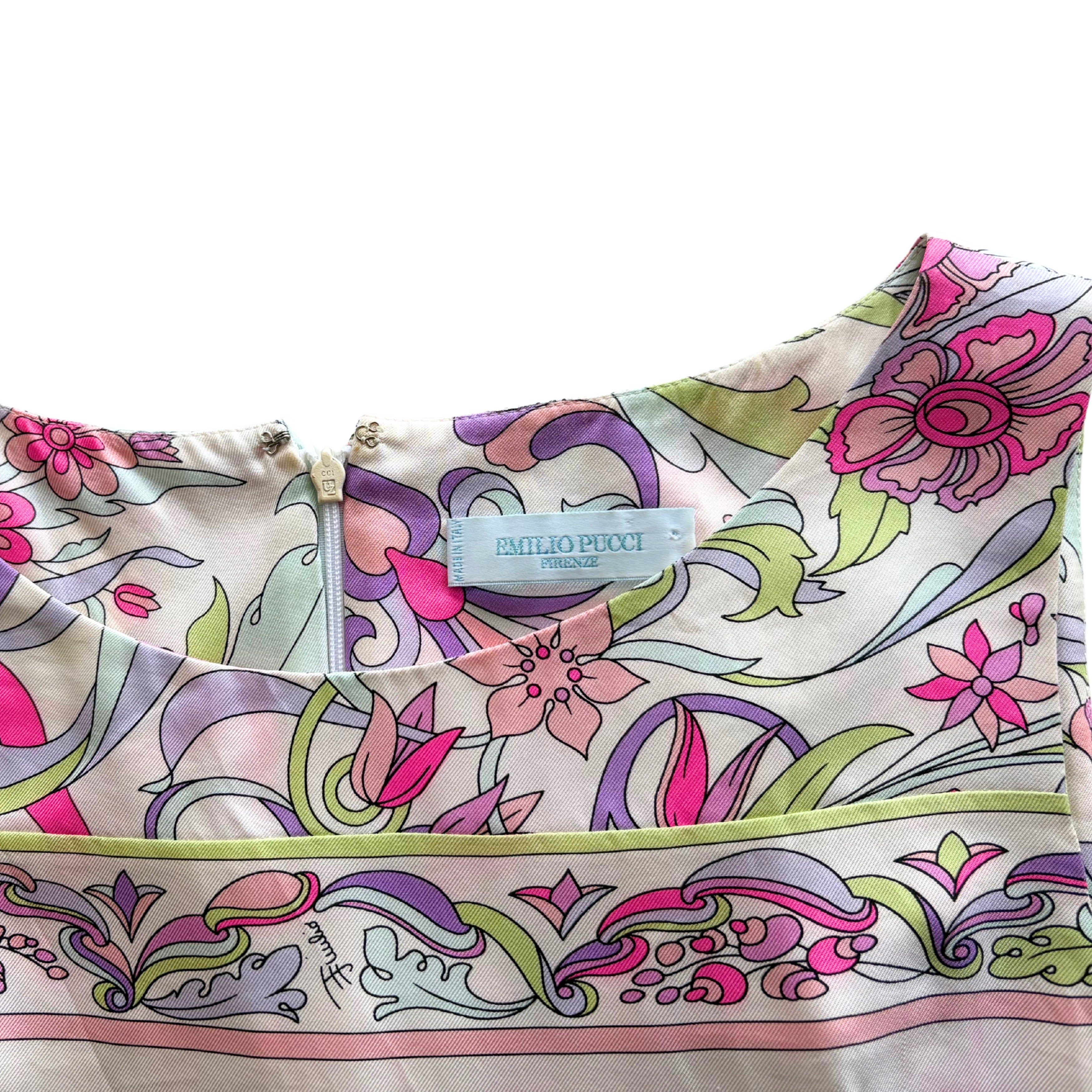 Emilio Pucci sleeveless sheath midi dress in white, pink and green multi-coloured floral patterned silk with an invisible zipper closure at the back neckline.