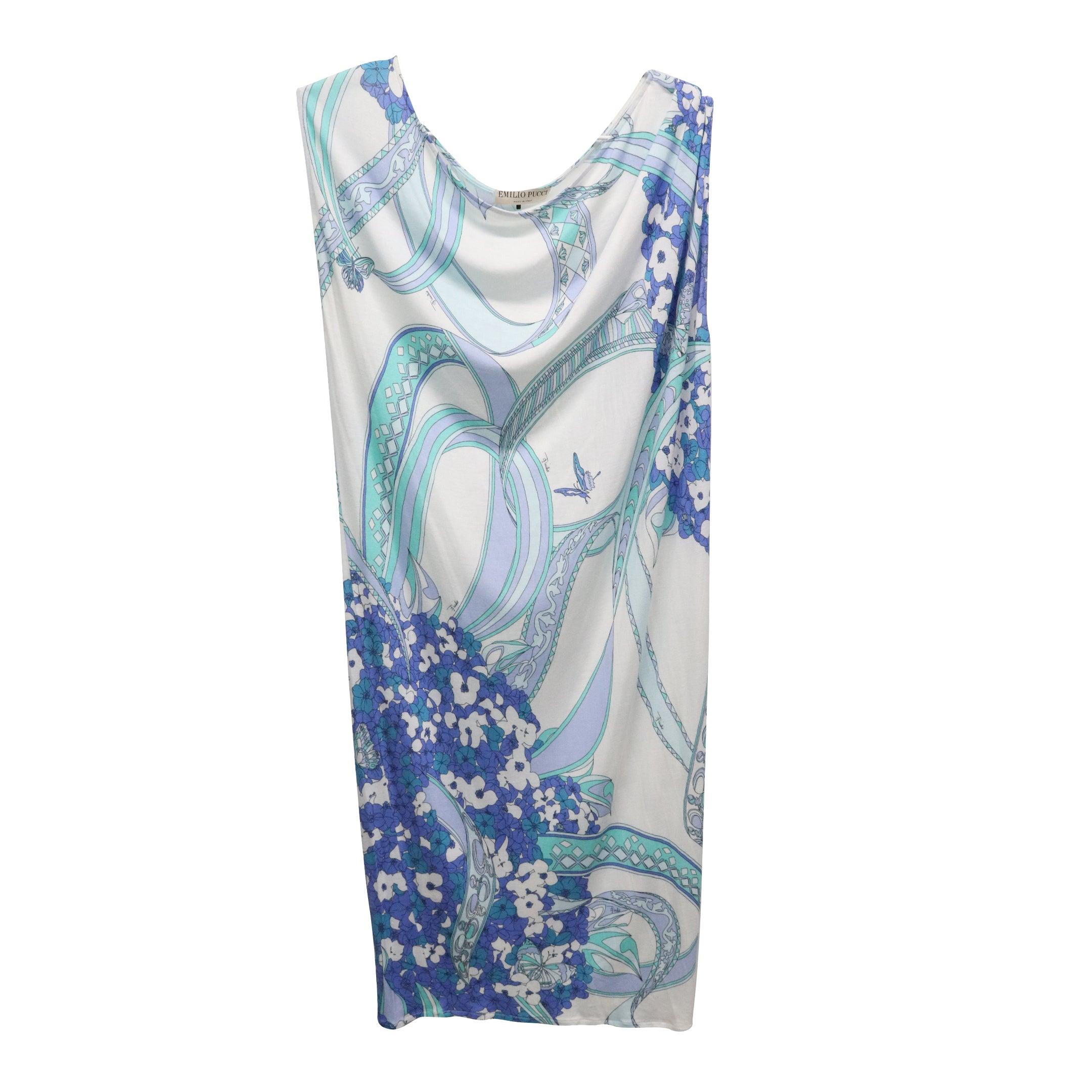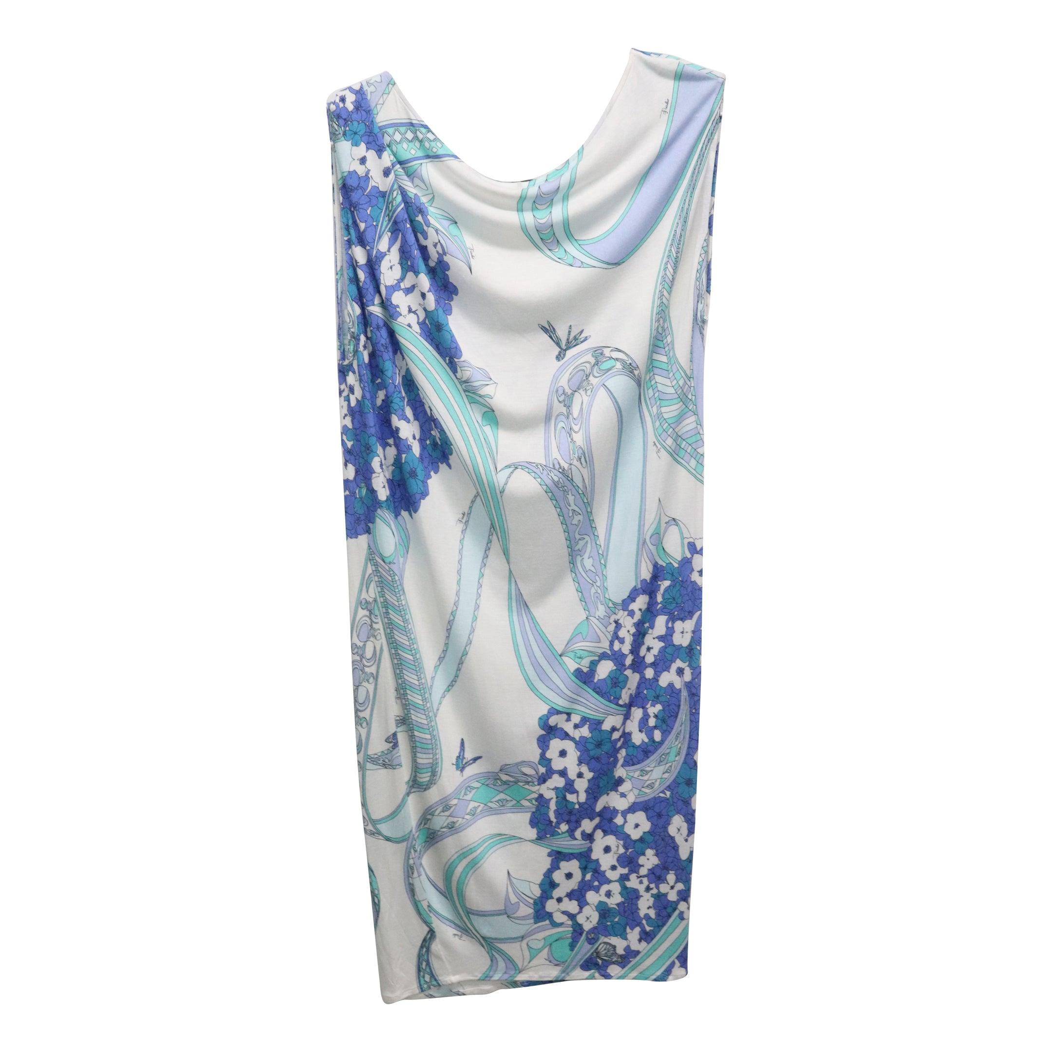 Emilio Pucci Shift Dress in blue, teal blue and white with black pucci outline pattern.