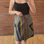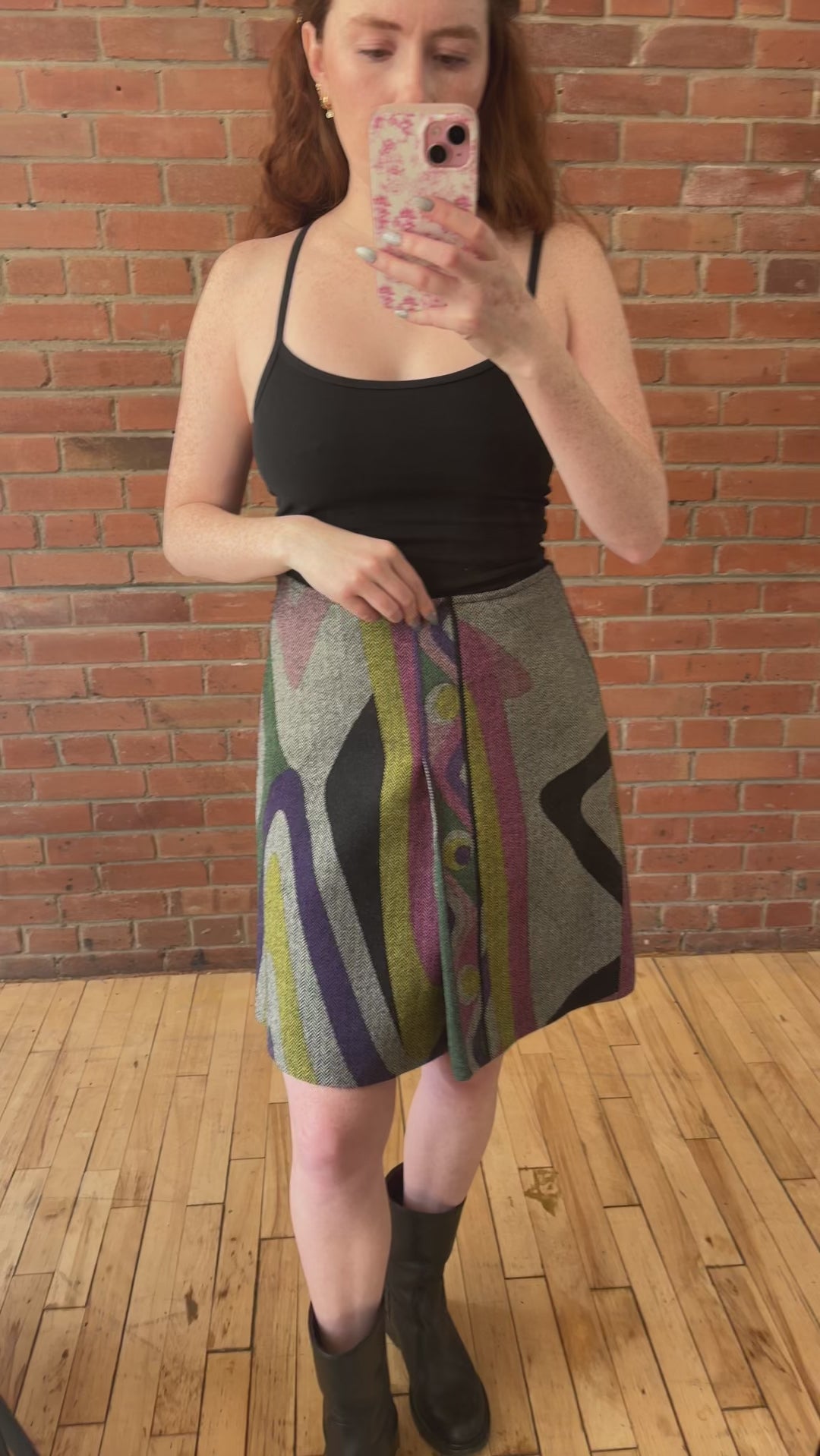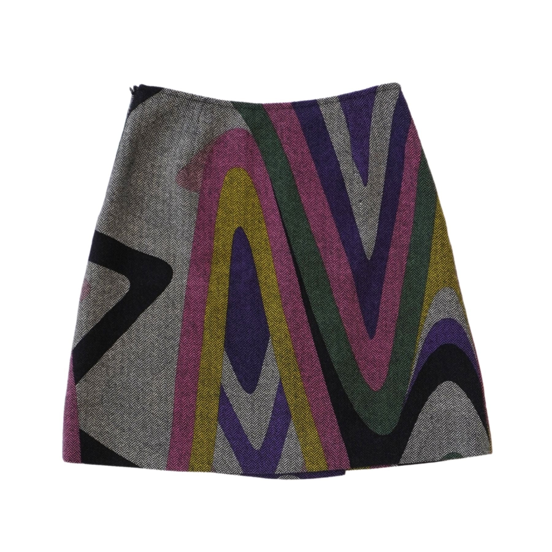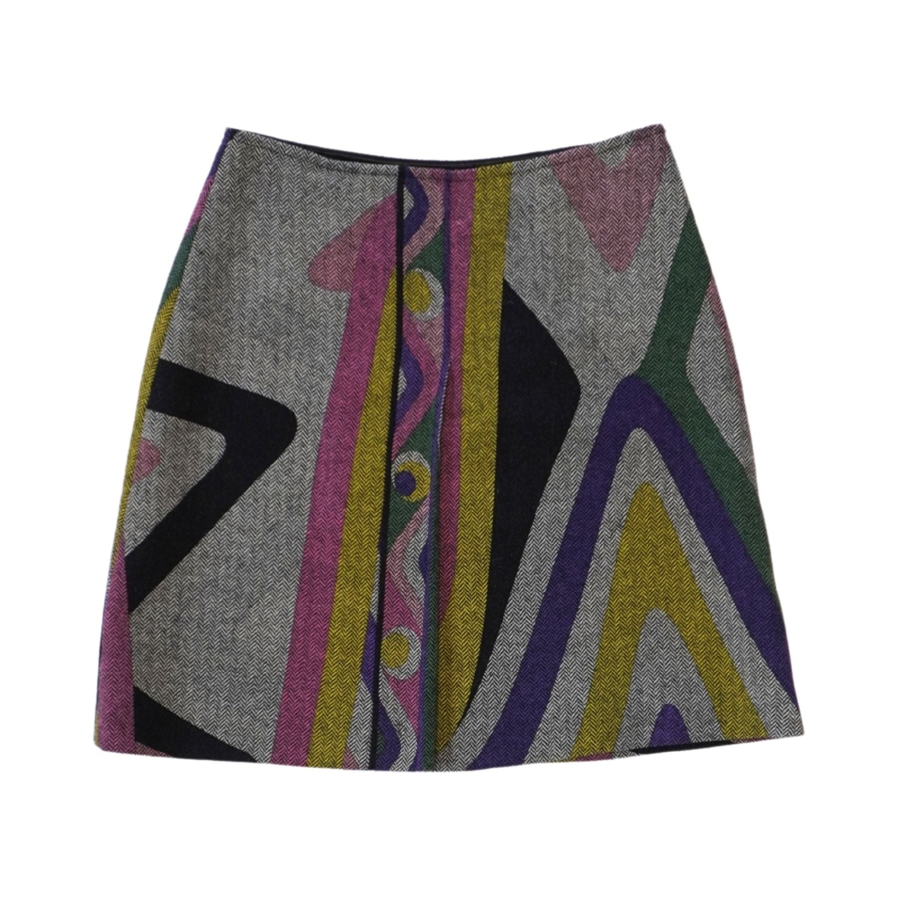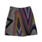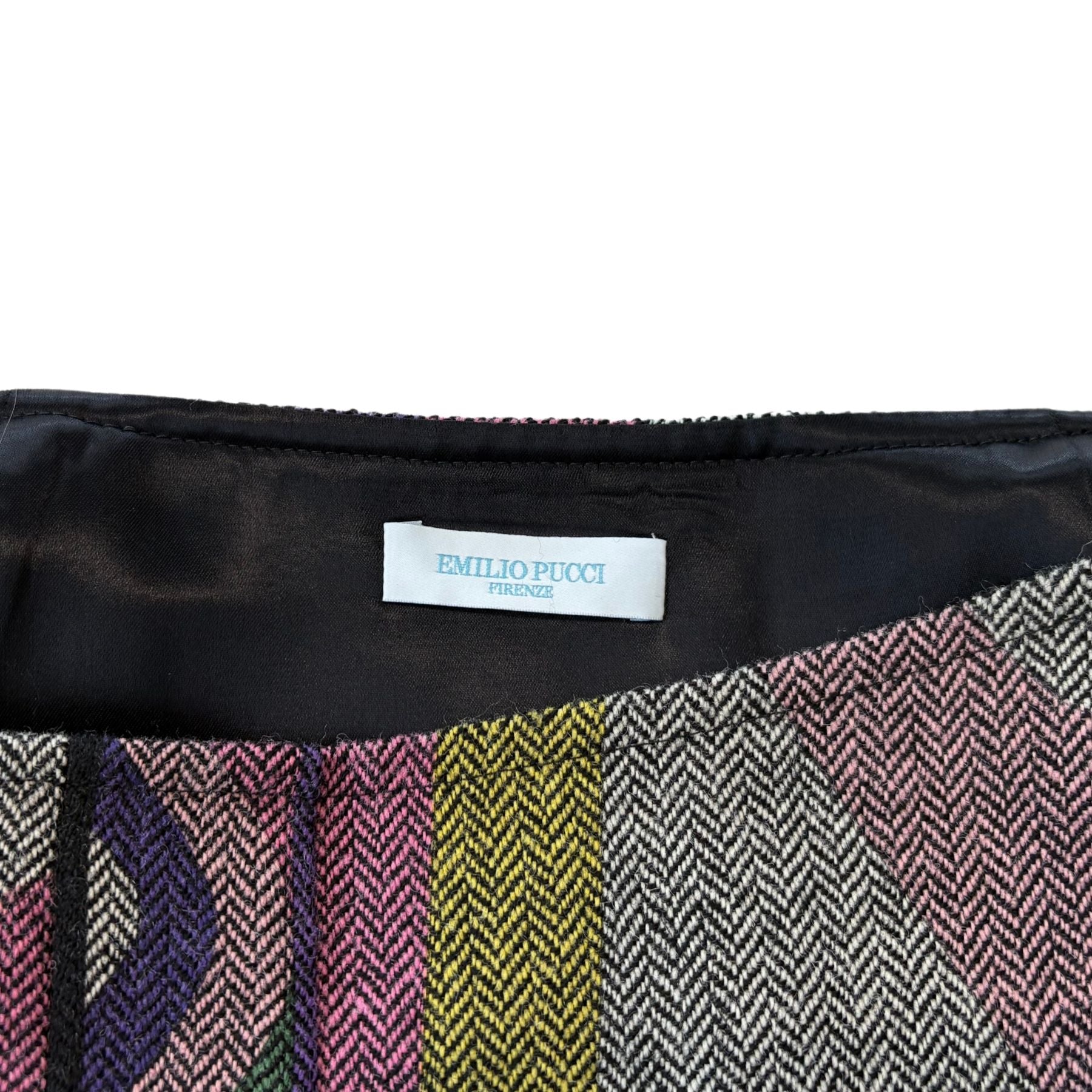 Emilio Pucci wool skirt in a grey woven herringbone fabric with multicolour abstract signature 'Pucci' print throughout and a front-pleat detail.