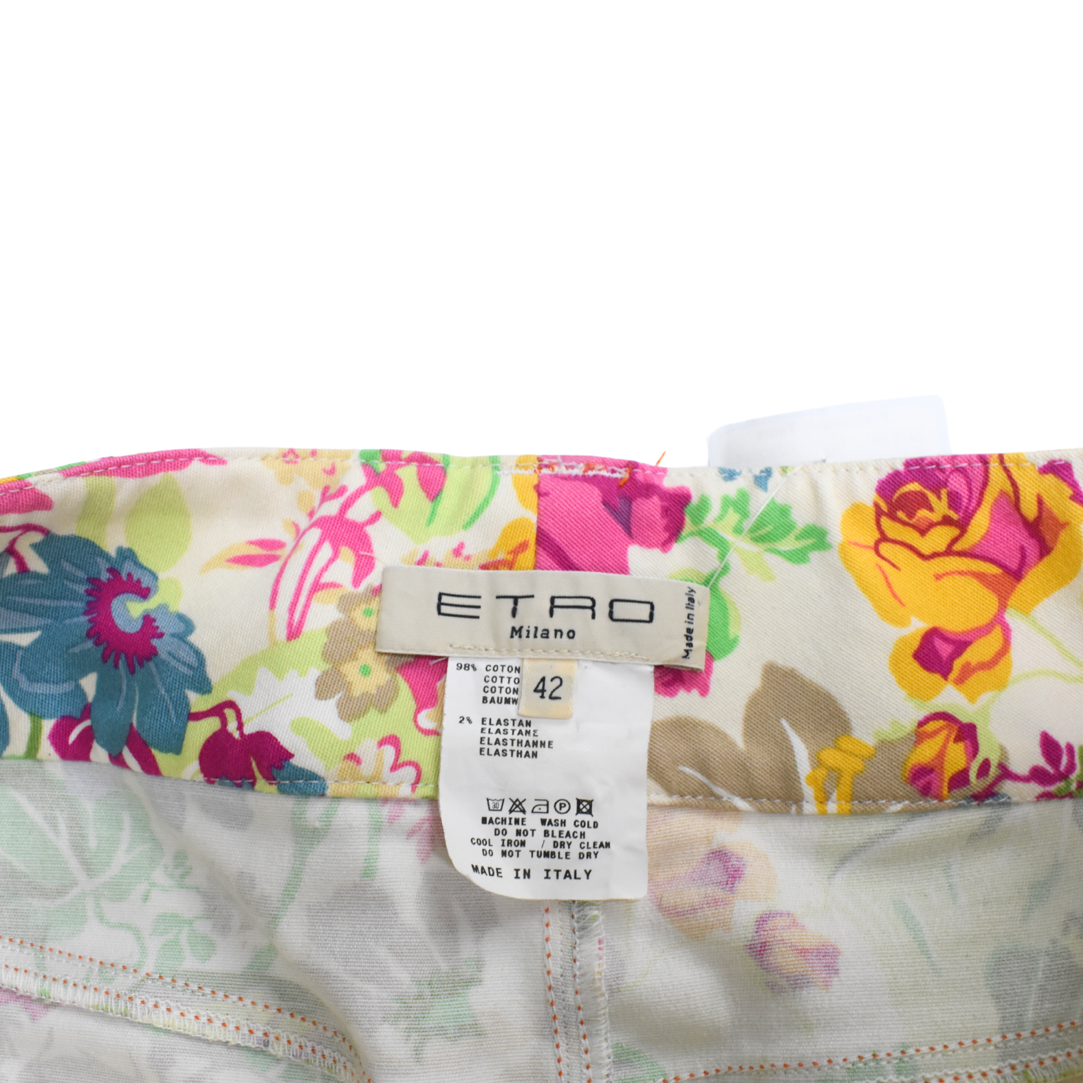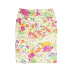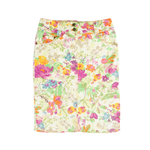 Etro pencil skirt in cream cotton denim with all-over multicolour floral print and gold button hardware.