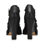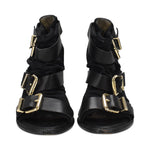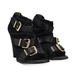 Fendi peep-toe wedges in black leather with three strap buckles in gold hardware and stretch fabric lining.