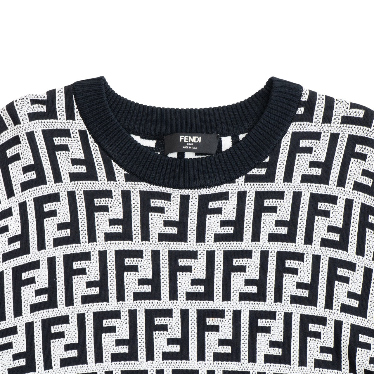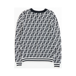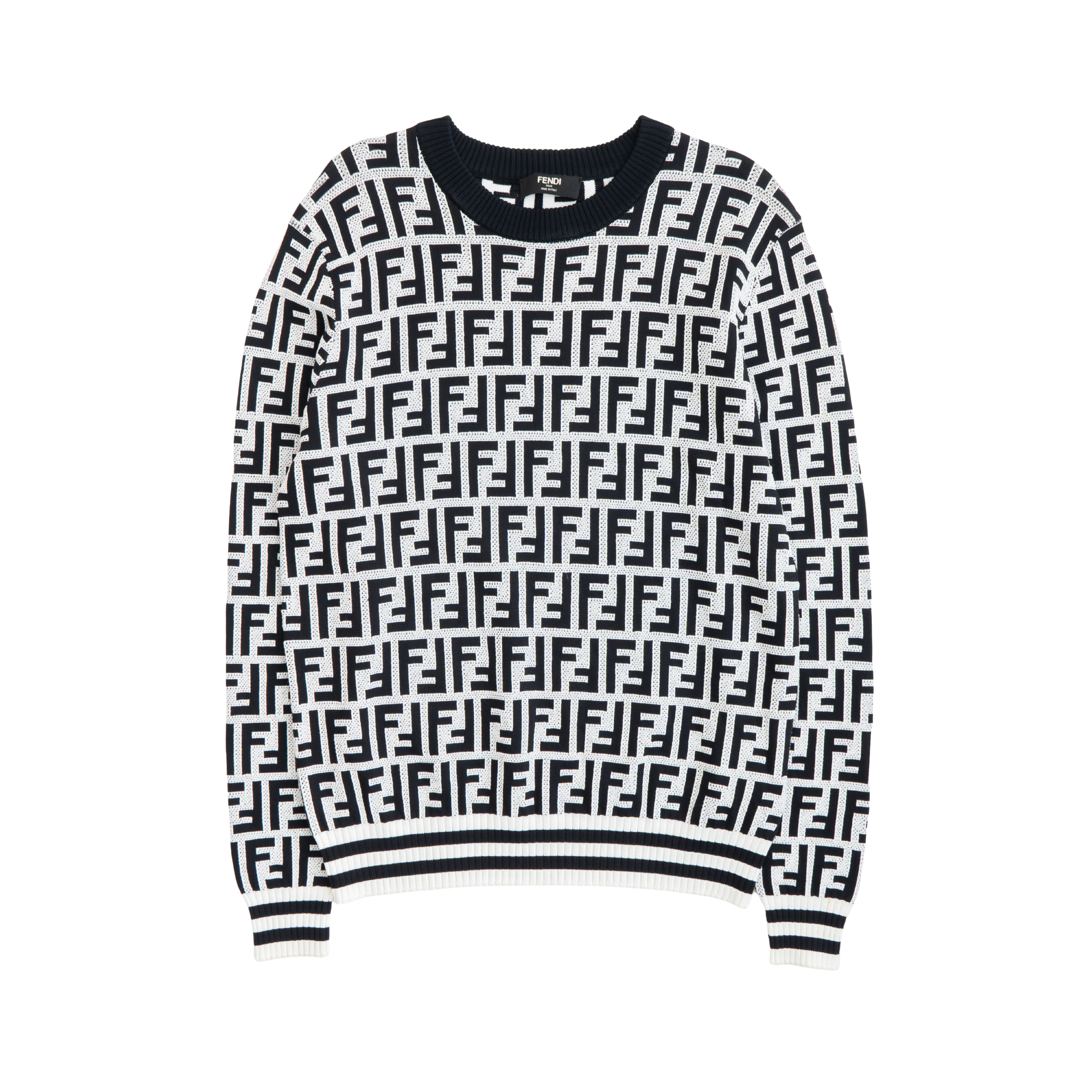 Fendi crewneck sweater in black and white 'FF' monogram wool knit with black and white ribbed trim and black ribbed collar.