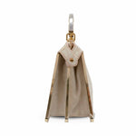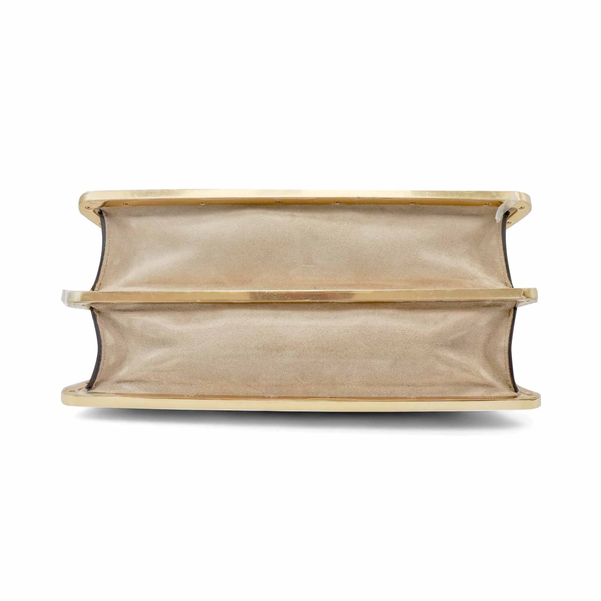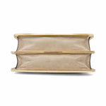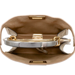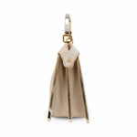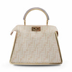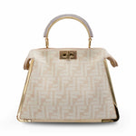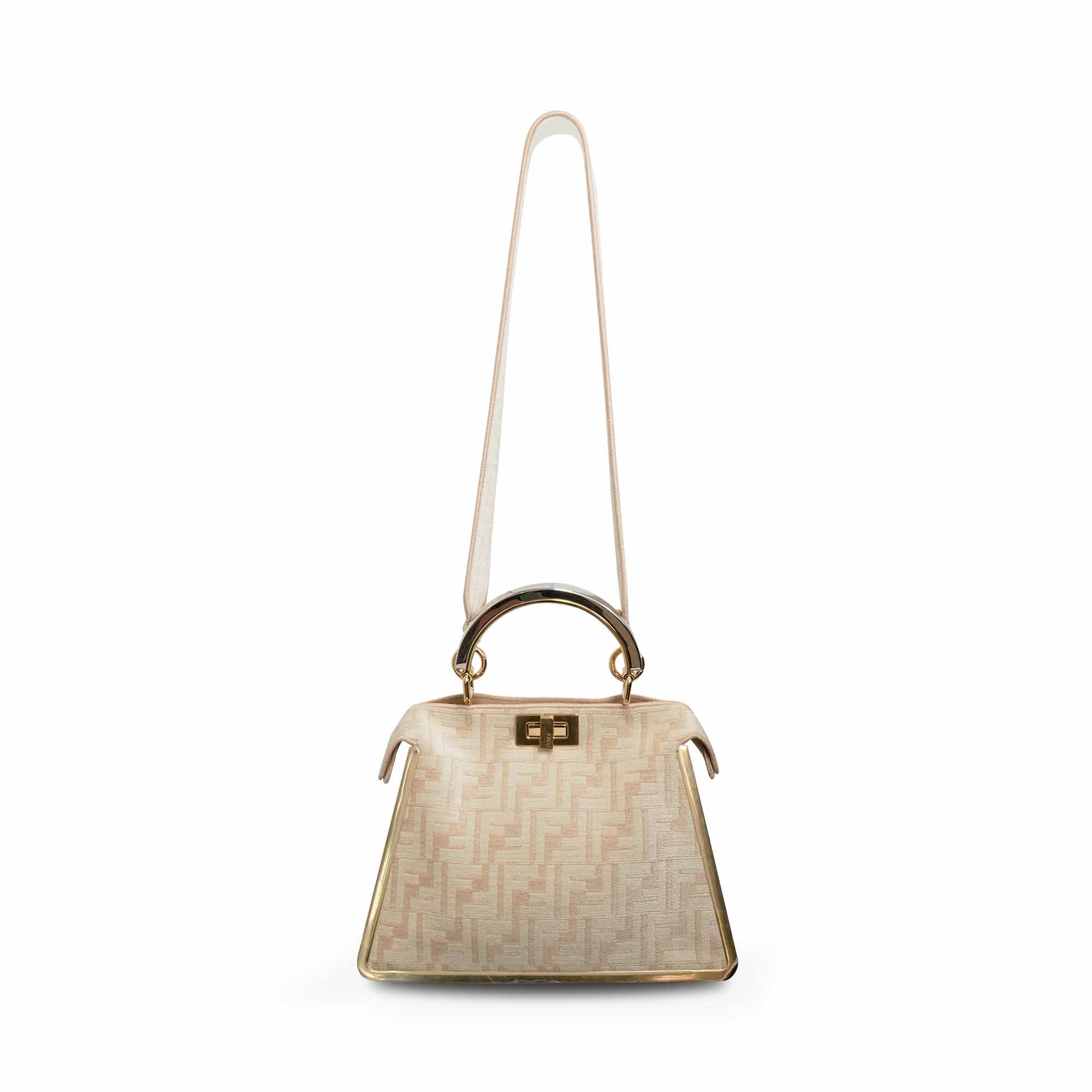 Fendi 'Small Peekaboo ISeeU' handbag in cream and beige FF monogram chenille with gold metal trim and a structured gold and silver metal handle. Features suede lined pockets on both sides with turnlock closures and side snaps allowing for the backs signature fold forward 'Peekaboo' opening.