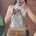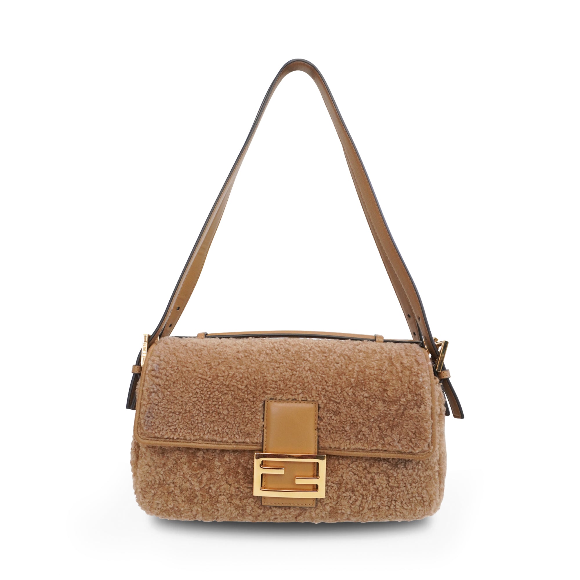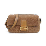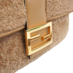 Fendi double sided, baguette bag in caramel brown shearling with gold hardware and brown leather details. Features two adjustable shoulder straps, one small top handle, and snap and zipper closures on both sides.