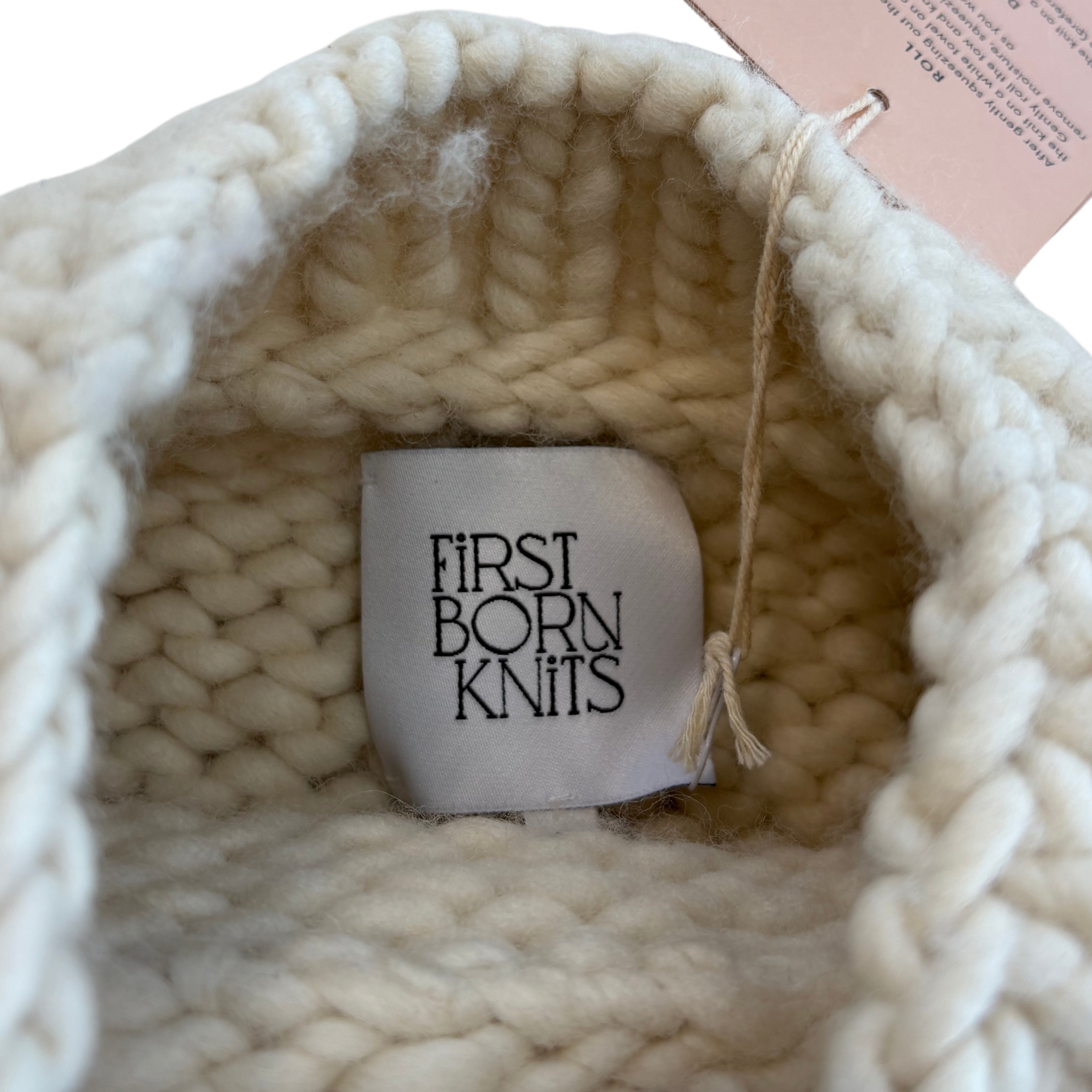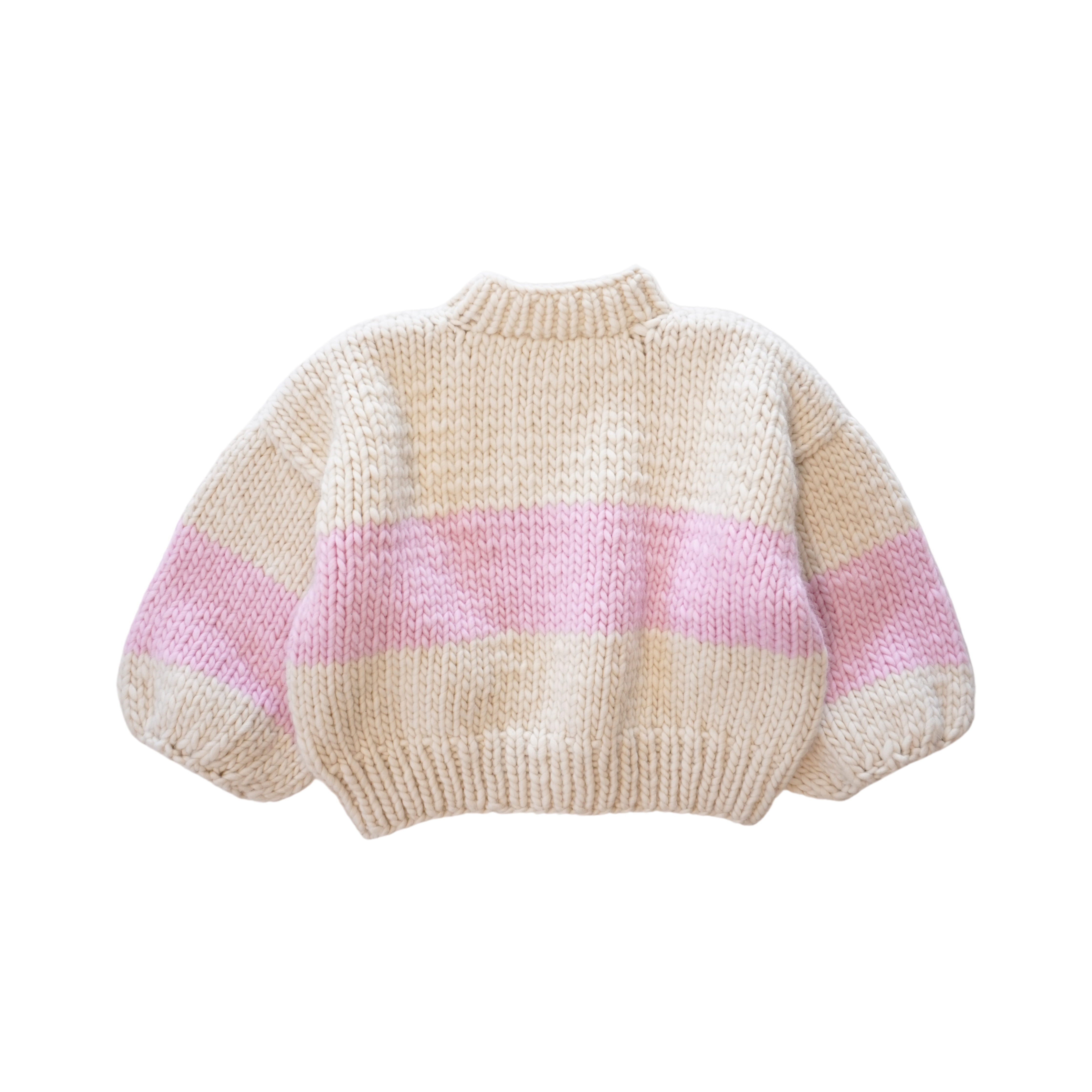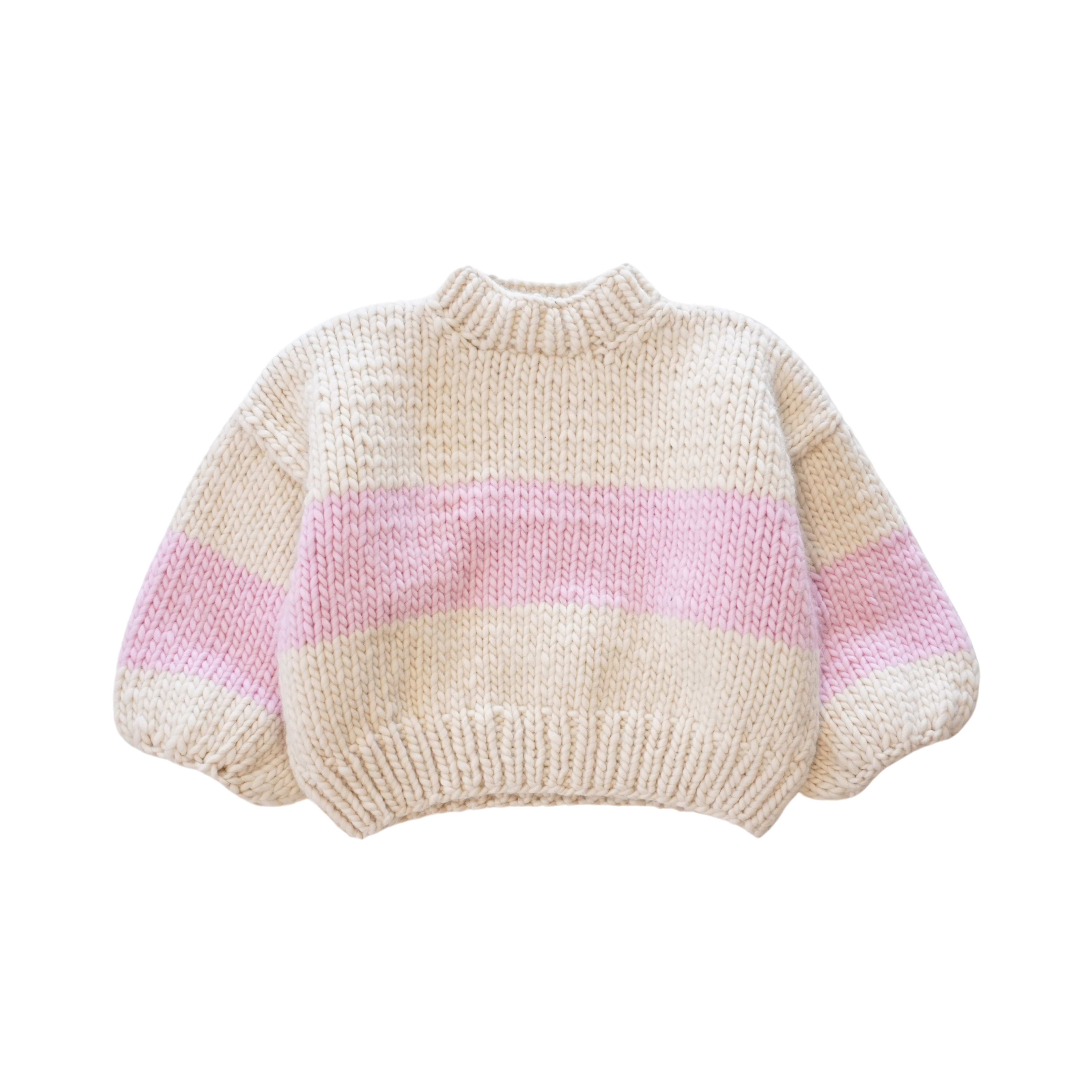 First Born Knits 'Angeline' cream and pink chunky knit sweater with a slightly cropped fit and balloon sleeves.