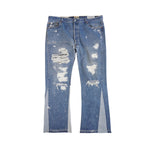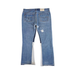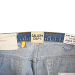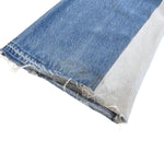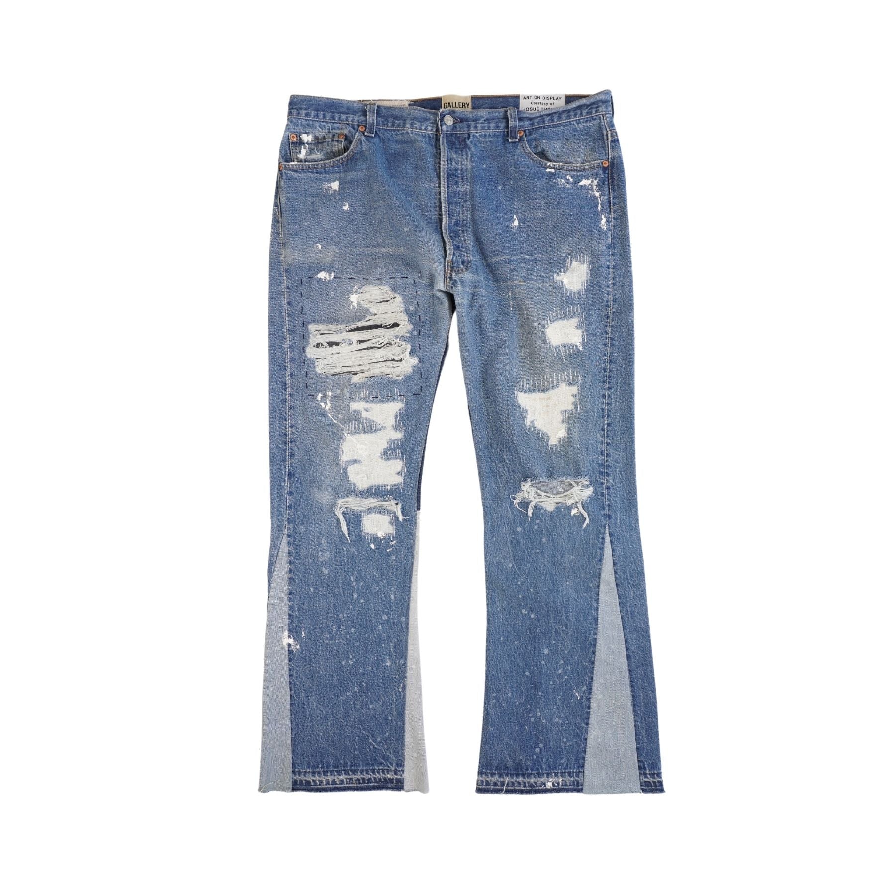 Gallery Dept. 'Indiana' vintage Levi's 501s jeans in medium blue washed denim with a re-cut for a slimmer fit and wider leg opening. Features reinforcing rips, darning, and paint splatter detailing.