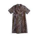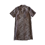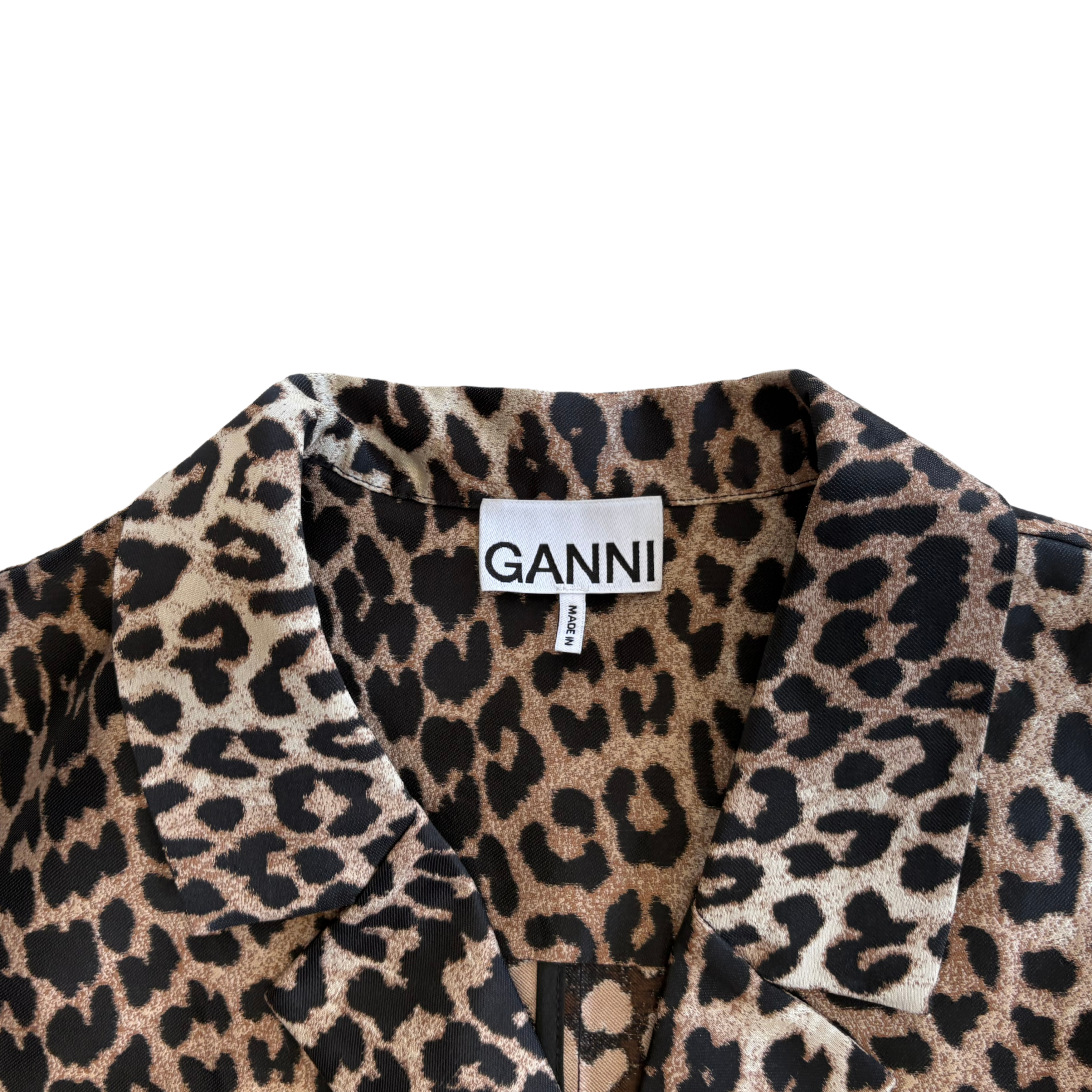 Ganni mid-length boxy wrap dress in a black and brown leopard print with two side seam pockets, a notch collar, and an attached thick waist belt.