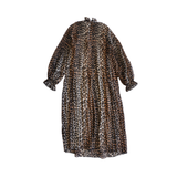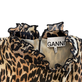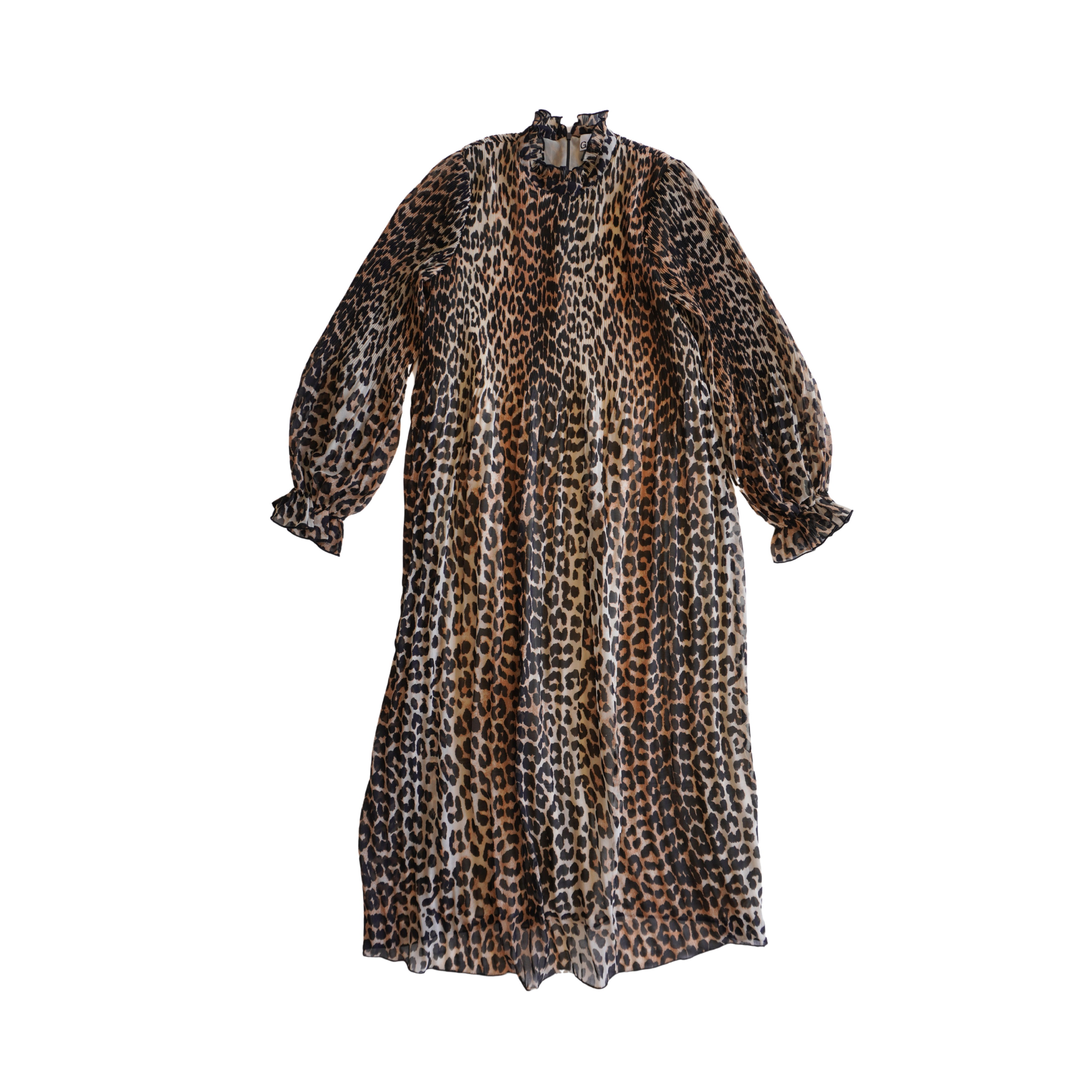 Ganni pleated georgette maxi dress in brown and black leopard print with a micro pleat top, ruffle collar, billowy sleeves with a ruffle cuff and invisible zipper closure at the back.
