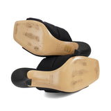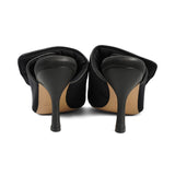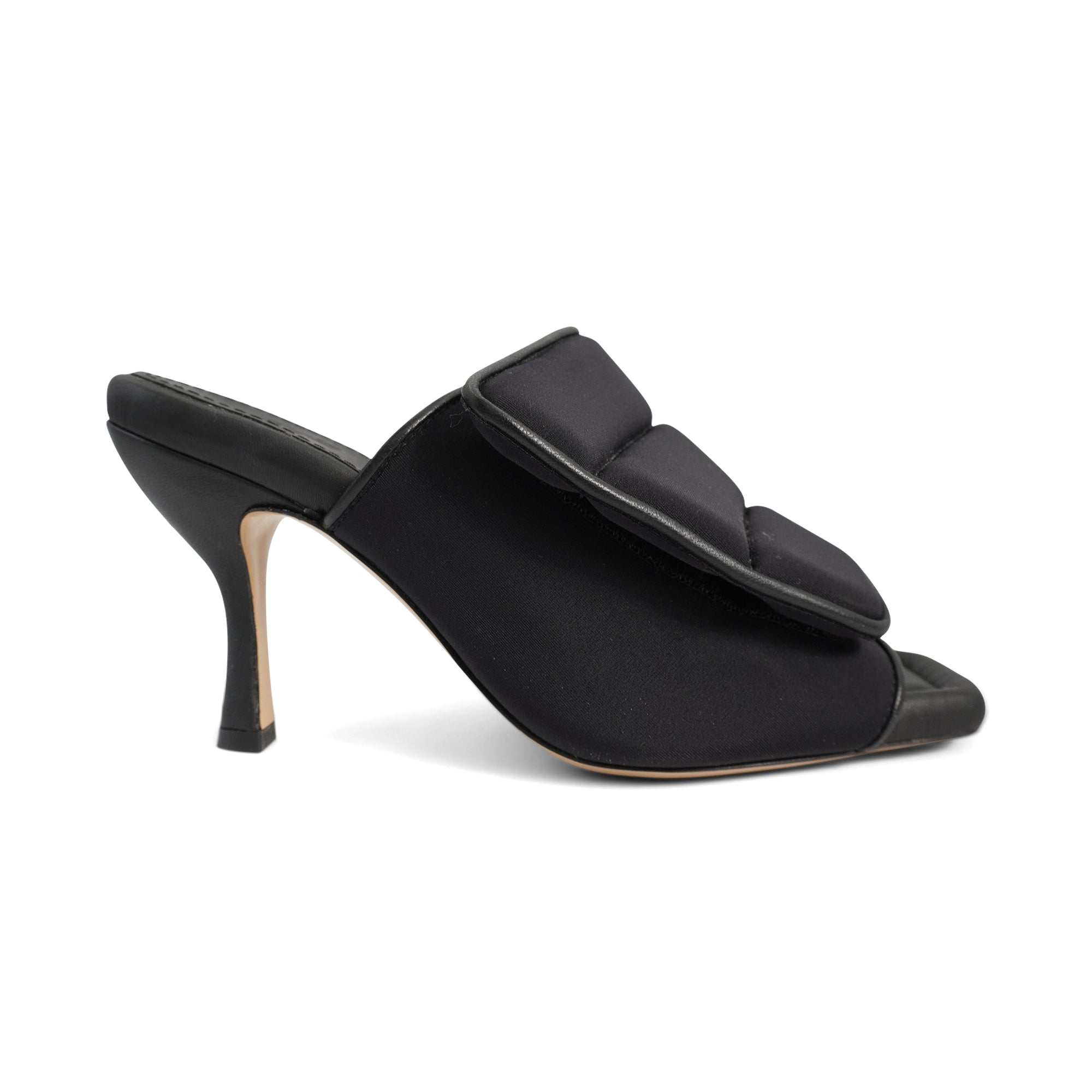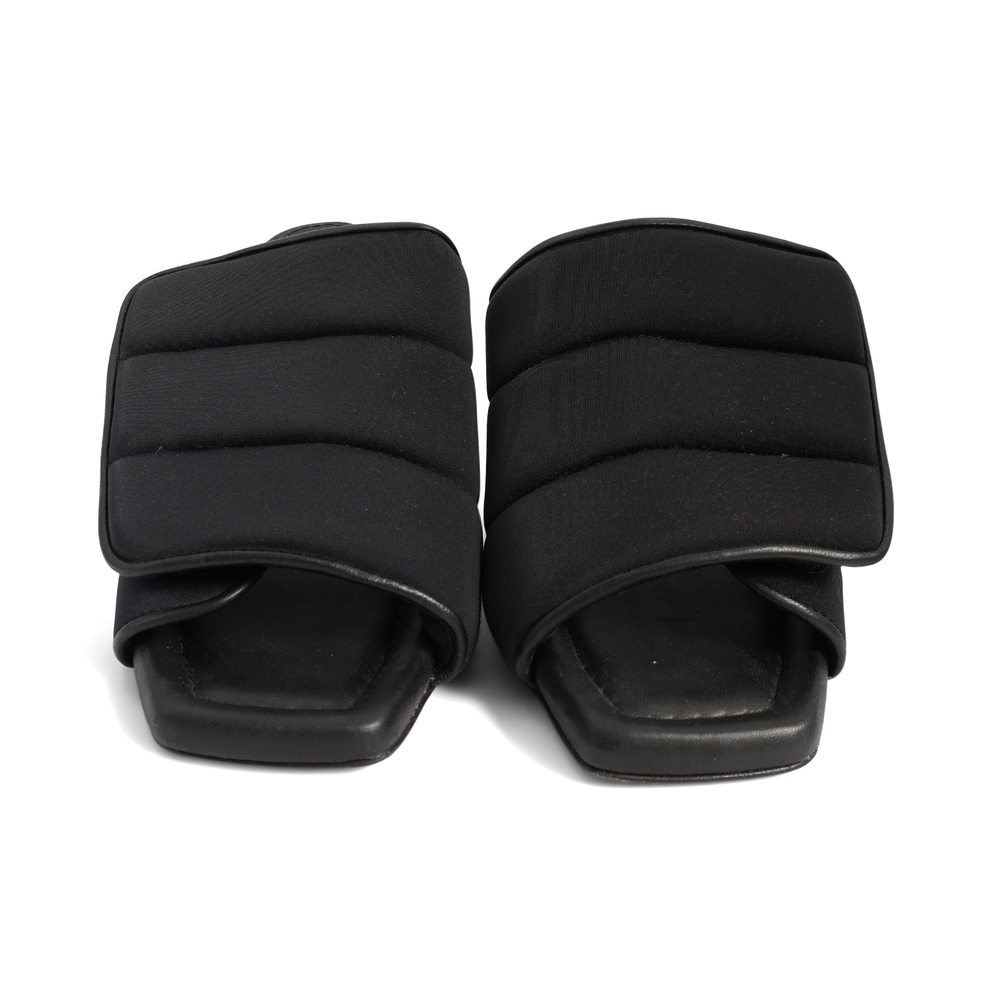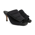 Gia Borghini 'Gia 4' sandals in black neoprene with a black leather sole and trim, a puffy velcro toe strap, and a short curved heel.