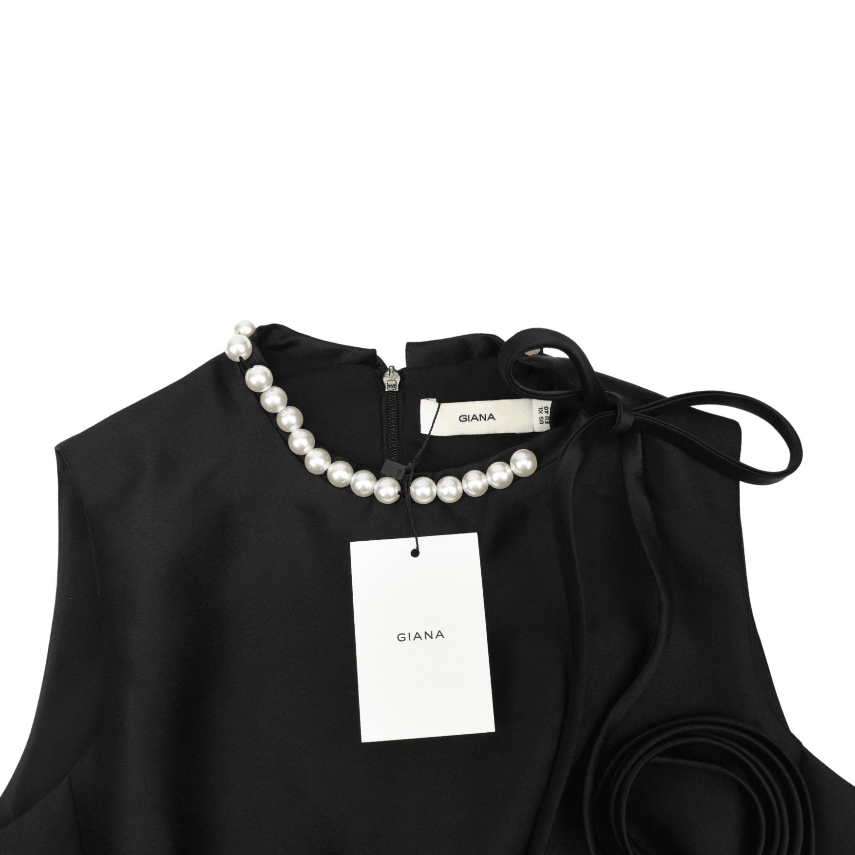 Giana 'Lauderee' dress in black satin poly with a pleated skirt, a pearl embellished neckline, and a hidden back zip opening.